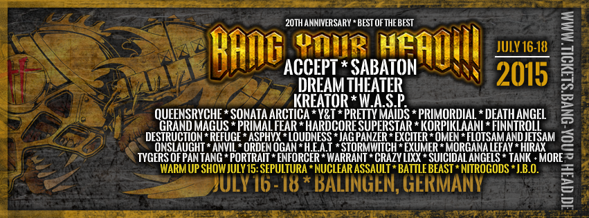 ACCEPT, ANVIL, ASPHYX, BATTLE BEAST, CRAZY LIXX, DEATH ANGEL, DESTRUCTION, DREAM THEATER, ENFORCER, EXCITER, EXUMER, FINNTROLL, FLOTSAM & JETSAM, H.E.A.T., HARDCORE SUPERSTAR, HIRAX, J.B.O, JAG PANZER, KORPIKLAANI, KREATOR, LOUDNESS, MORGANA LEFAY, NITRO GODS, NUCLEAR ASSAULT, OMEN, ONSLAUGHT, ORDEN OGAN, PORTRAIT, PRETTY MAIDS, PRIMAL FEAR, PRIMORDIAL, QUEENSRYCHE, REFUGE, SABATON, SEPULTURA, SONATA ARCTICA, STORMWITCH, SUCIDAL ANGELS, TANK, TYGERS OF PAN TANG, W.A.S.P., WARRANT, Y&T