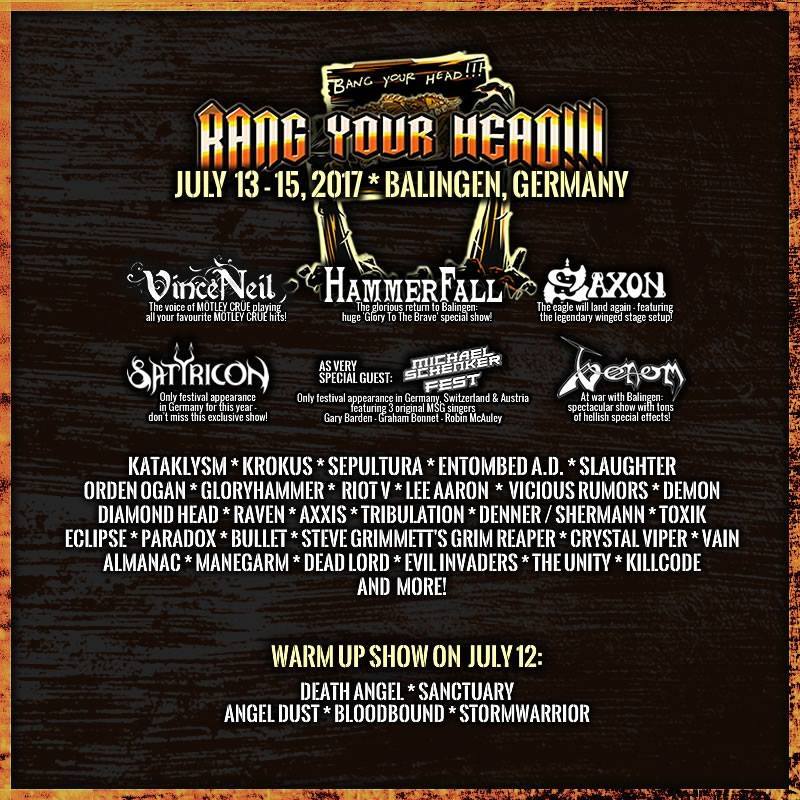 ALMANAC, ANGEL DUST, AXXIS, BLOODBOUND, BULLET, CRYSTAL VIPER, DEAD LORD, DEATH ANGEL, DEMON, DENNER / SHERMAN, DIAMOND HEAD, ECLIPSE, ENTOMBED A.D., EVIL INVADERS, GLORYHAMMER, HAMMERFALL, KATAKLYSM, KILLCODE, KROKUS, LEE AARON, MANEGARM, MICHAEL SCHENKER FEST, ORDEN OGAN, PARADOX, RAVEN, RIOT IV, SANCTUARY, SATYRICON, SAXON, SEPULTURA, SLAUGHTER, STEVE GRIMMET’S GRIM REAPER, STORMWARRIOR, THE UNITY, TOXIK, TRIBULATION, VAIN, VENOM, VICIOUS RUMORS, VINCE NEIL uvm.