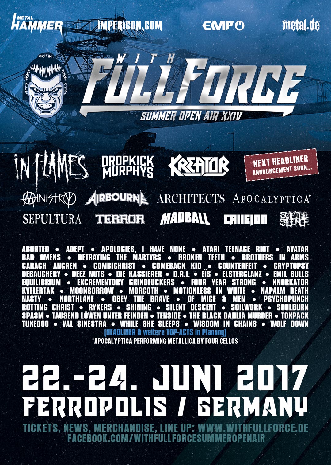 Nach dem Nils und ich fast manisch in der letztjährigen Ausgabe aufgegangen sind, hängt die Messlatte für diese Spielzeit extrem hoch. Dabei gibt es einige wichtige Neuerungen zu vermelden. Dem erfahrenen Forcer wird nicht nur die Terminveränderung - letztes Juni-Wochenende anstelle des traditionellen ersten Juli-Wochenendes - aufgefallen sein, sondern insbesondere auch der Wechsel des Ackers. Weg vom Scharm des ausgedienten Flugplatzes und idyllischen Erholungsgebiets in Roitzschjora, hin zur industriellen Atmosphäre von Ferropolis, Gräfenhainchen. Einige kennen die Location vielleicht durch das Melt! oder als Spielstädte von Metallica, 2003. Wir sind auf jeden Fall gespannt, wie sich der Wechsel auf die bisher stets geile Atmosphäre des With Full Force auswirken wird. Was die Bands angeht, lassen sich die Veranstalter auch dieses Jahr wieder nicht lumpen und präsentieren uns und euch die großen Namen der Szene als Headliner. Fiel die Show von IN FLAMES 2015 buchstäblich ins Wasser, bekommen die Pioniere des Melodic Death Metals heuer eine erneute Chance den ausgefallenen Gig nachzuholen. Man kann den Stilwechsel der Göteburger gut heißen oder auch nicht, für eine zündende Show sind sie immer noch eine Bank!