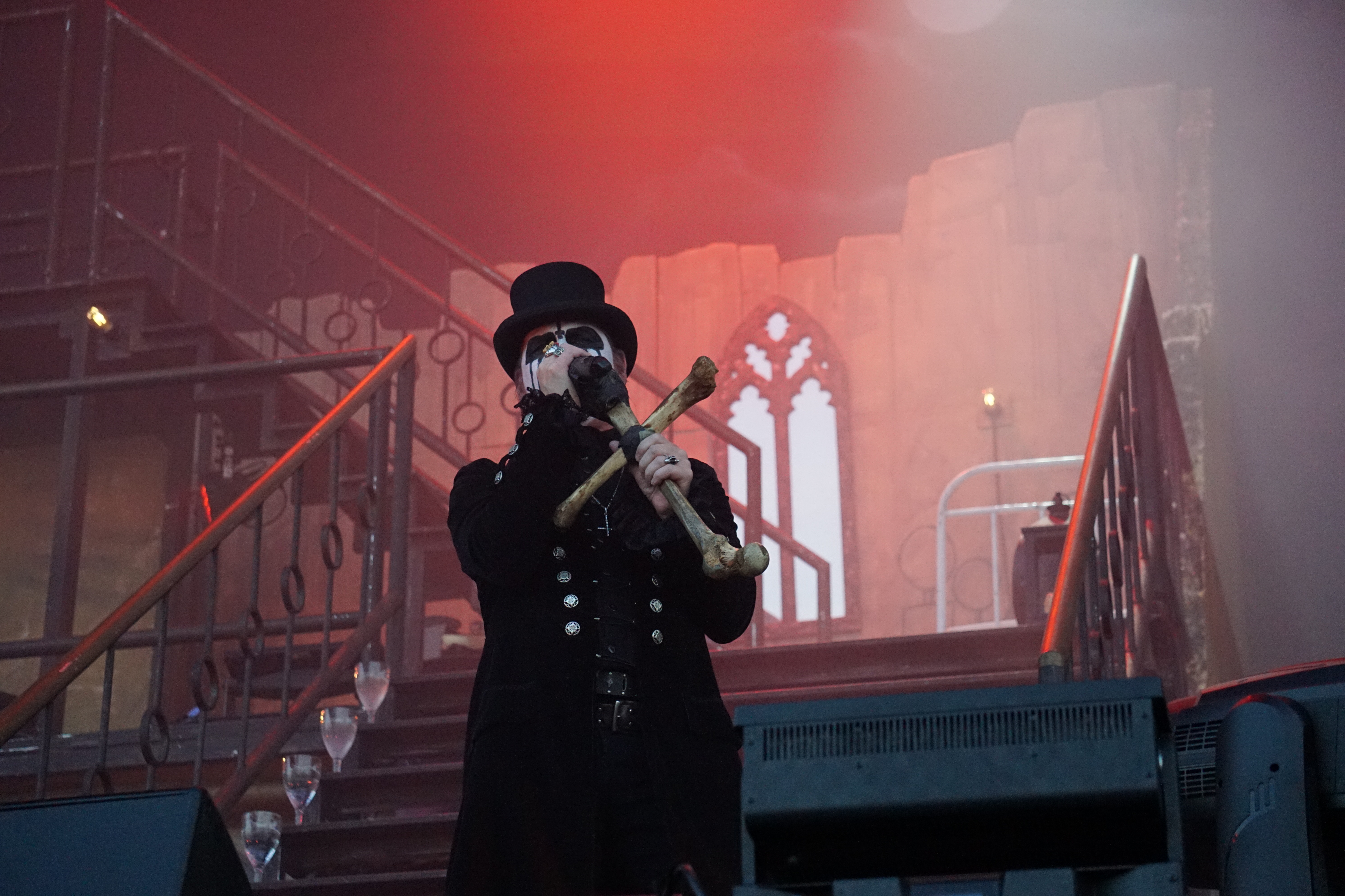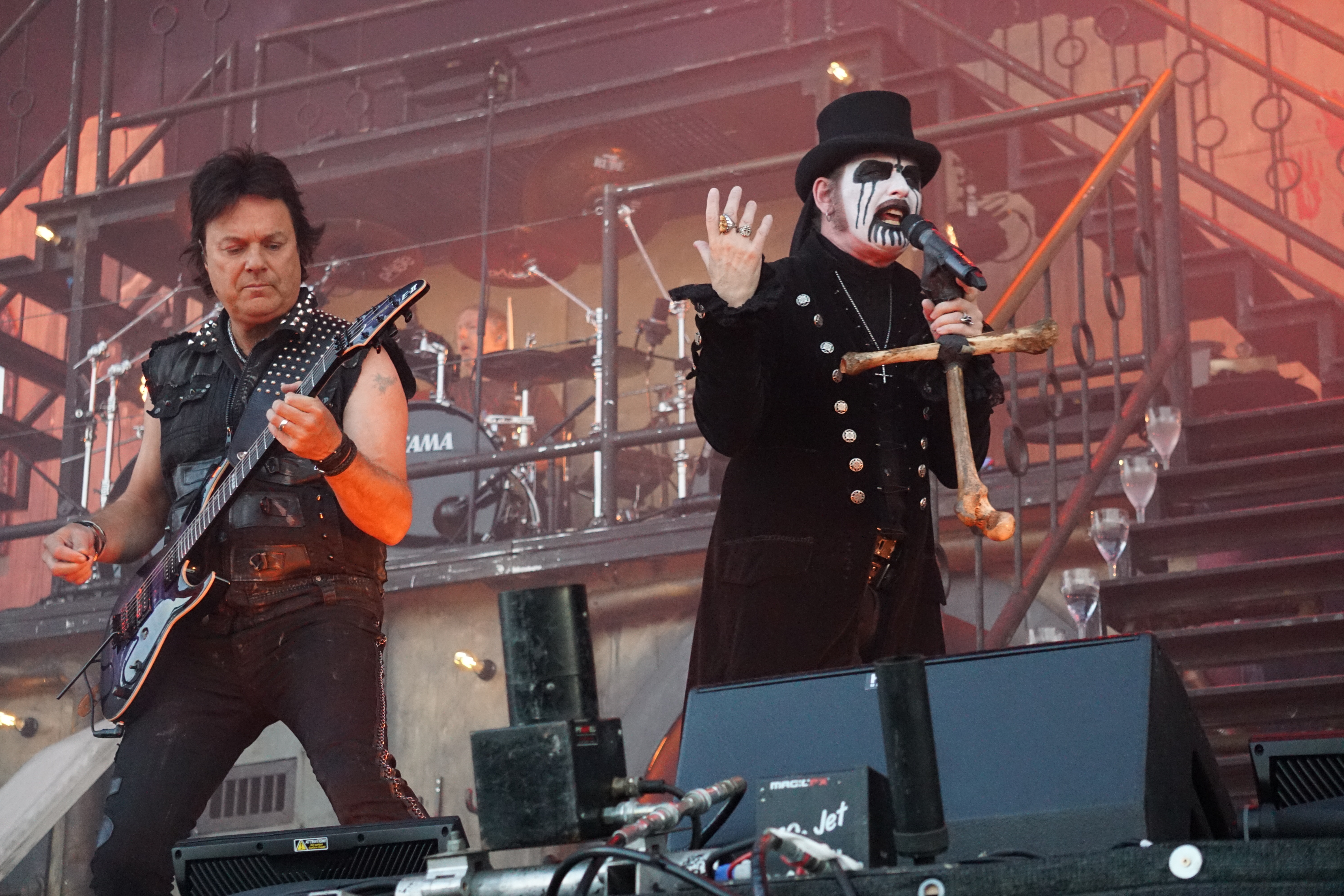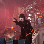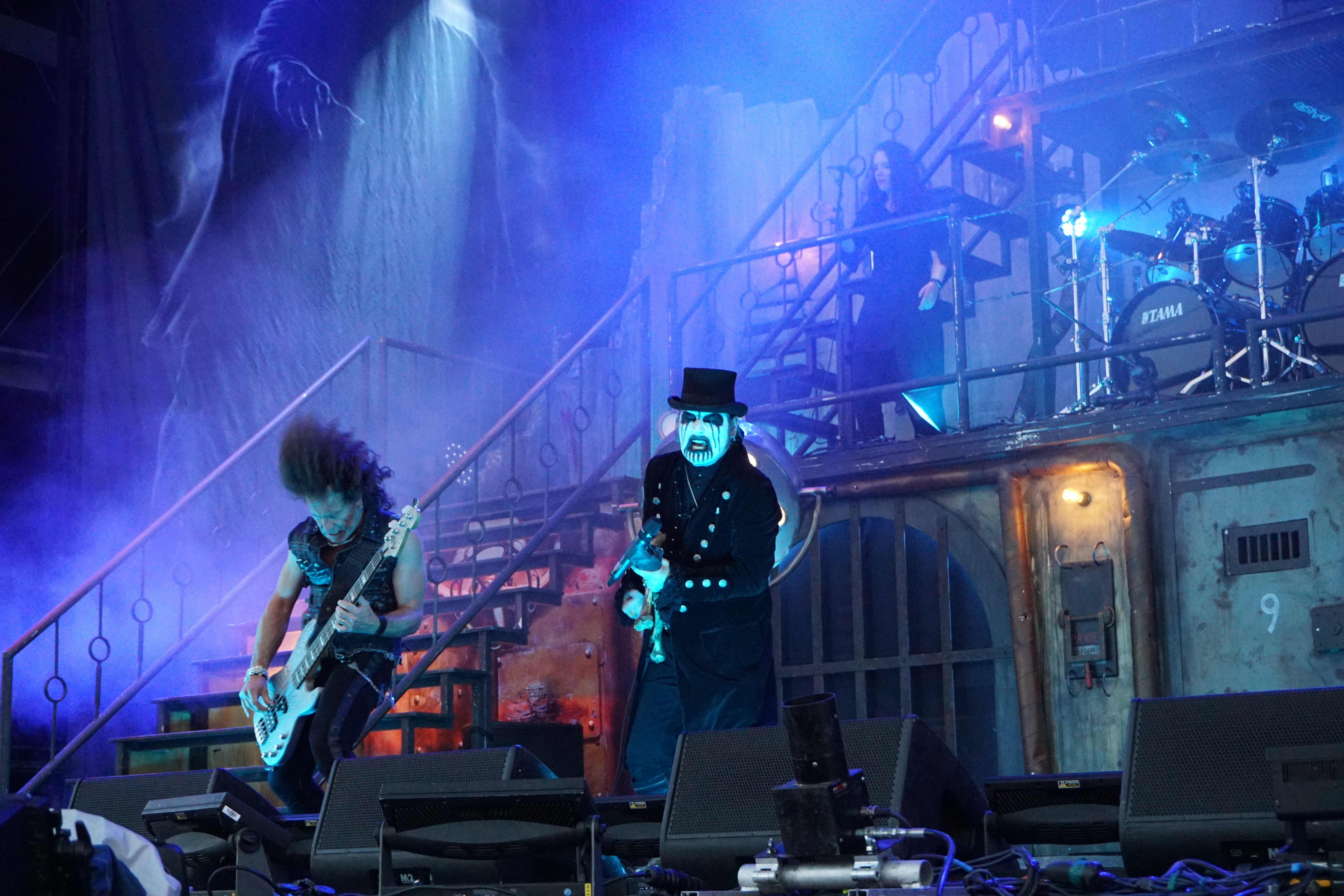 Wer jetzt auf die Bühne muss, hat eh einen schweren Stand. Vielleicht war das mit KING DIAMOND als Kontrastprogramm dann eine gute Idee. Der Oldschool-Metal kombiniert mit der Stimmlage (Falsett-Stimme) des Herrn Kim Bendix Petersen (bürgerl. Name) ist was Spezielles und nicht jedermanns Sache, deshalb war das Battlefield auch zunächst nur mäßig gefüllt. Ich persönlich schätze die Musik von MERCYFULL FATE und KING DIAMOND, konnte mir das Ganze aber bisher nicht länger als maximal eine LP-Länge antun. Den unvergleichlichen KING DIAMOND aber nun zum ersten Mal live zu erleben, verursachte selbst mir altem Hasen ein flaues Gefühl in der Magengegend. Für das zu erwartende Horrortheater war es anfangs eigentlich noch zu hell. Das Bühnenbild entführte uns in ein düsteres Sanatorium, mit einem rostigen Treppenaufgang rechts und links zu den oberen Stockwerken. In der Mitte, quasi im ersten Stock, war das Schlagzeug aufgebaut. Darunter befand sich zwischen zwei vergitterten Luftschächten eine Art Zellentür, die von zwei Gestalten in Mönchskutten geöffnet wurde. Auf einem Behandlungsstuhl liegend, wurde der King von den beiden zu “St. Lucifer's Hospital“ auf die Bühne geschoben. Die restlichen Musiker erschienen nacheinander im ersten Stockwerk und stimmten “The Candle“ an. Zum nächsten Stück “Voodoo“ erschien eine schwarz gekleidete Dame mit seltsamen Zeichen im Gesicht. Ihr galt es nun den Teufel auszutreiben. Und wieder tauchten die beiden Mönche auf, diesmal mit einem Kindersarg. Die darin befindliche Puppe wurde zu “Funeral“ von Mr. Diamond persönlich erdolcht und mit “Arrival“ wurden wir einem regelrechten Gitarrengewitter ausgesetzt. An dieser Stelle muss einmal erwähnt werden, dass der Sound an der Hauptbühne immer exzellent war und dabei spielte es keine Rolle wo man sich befand. Es war indes nicht nur der Sound, sondern selbstverständlich die Performance des dunklen Monarchen, der gesangstechnisch wohl so etwas wie seinen zweiten Frühling erlebte. Klar und dynamisch kletterte er nicht nur die Treppen sondern auch die Oktaven hoch und runter. Besonders brillant war der Vortrag von “A Mansion in Darkness“, jedoch sollten die Tracks aus der kreativen “Them“ - Phase noch kommen. Zwei der progressiven Sahnestückchen gab's dann auch mit Intro direkt hintereinander. Vor „“Welcome Home“ samt Oma und “Invisible Guest“ bekam die treue Gemeinde aber noch das neue Lied “Masquerade Of Madness“ vorgetragen, das dann auch gebührend gefeiert wurde. Mit dem akustisch angehauchten “Black Horsemen“ wurde die Horrorshow beendet. Ich hätte mir zwar noch den ein oder anderen MERCYFULL FATE Kracher gewünscht, insgesamt war die Darbietung aber immerhin gespickt mit vielen Highlights aus der frühen Schaffensphase des Edelsteinkönigs.