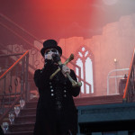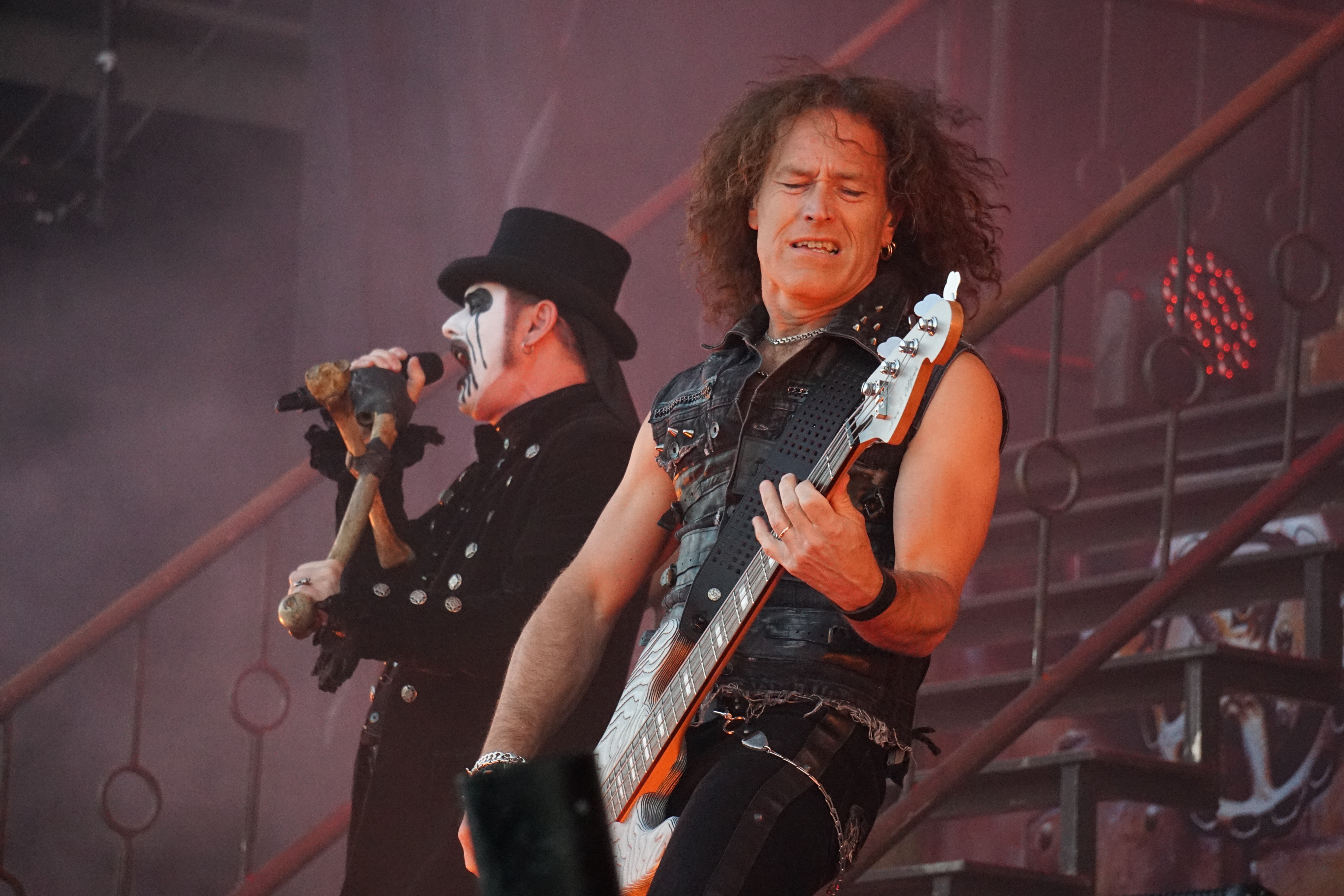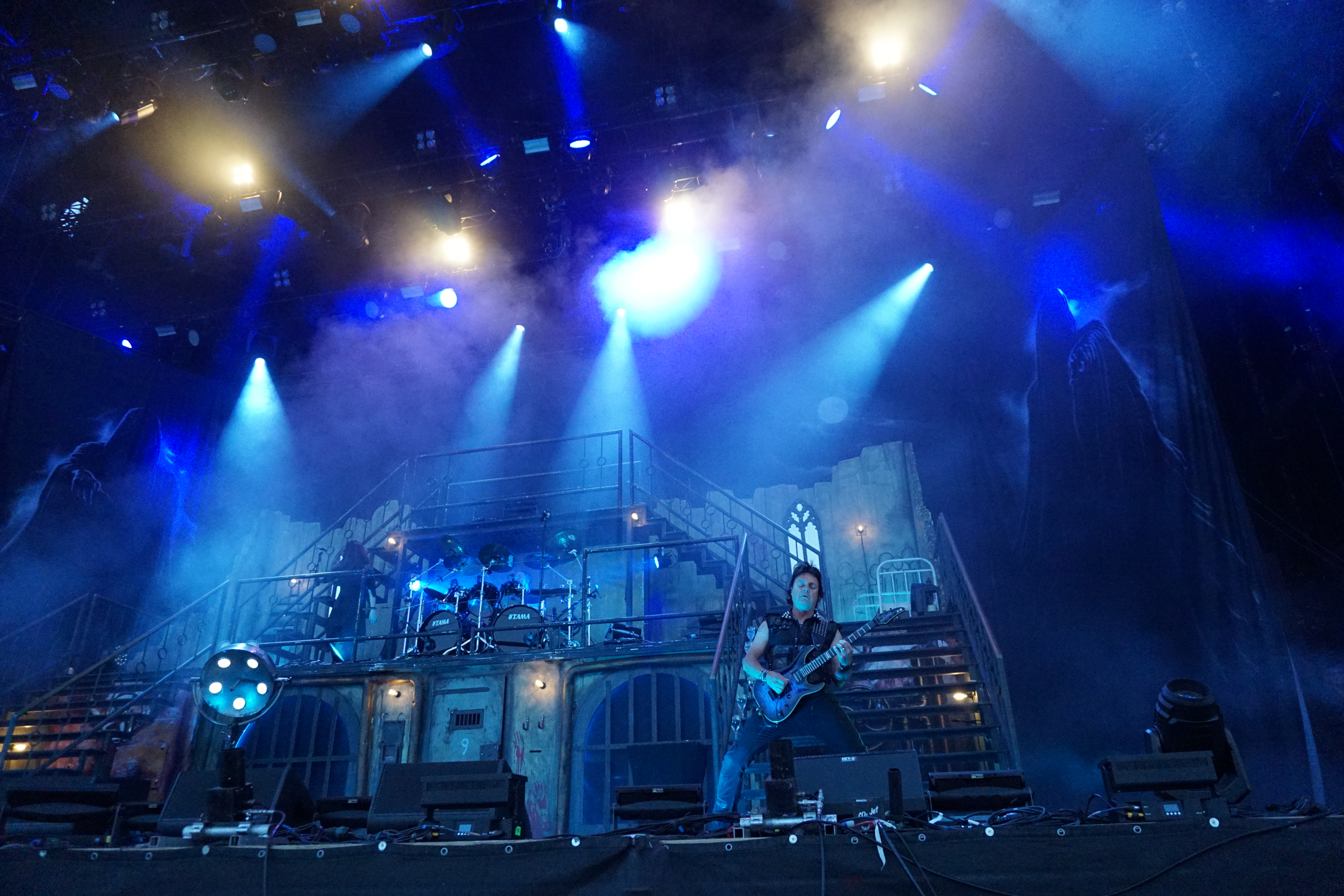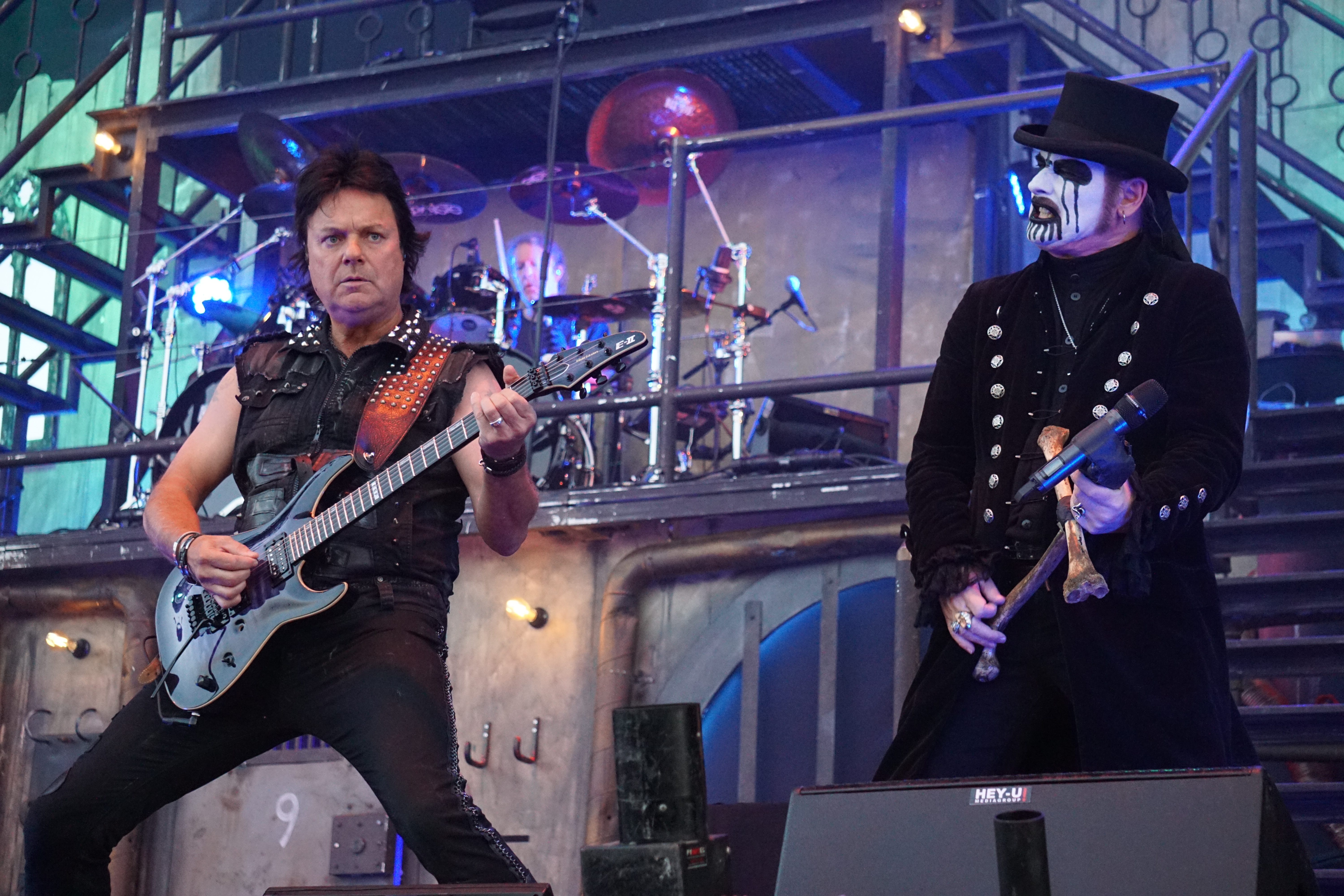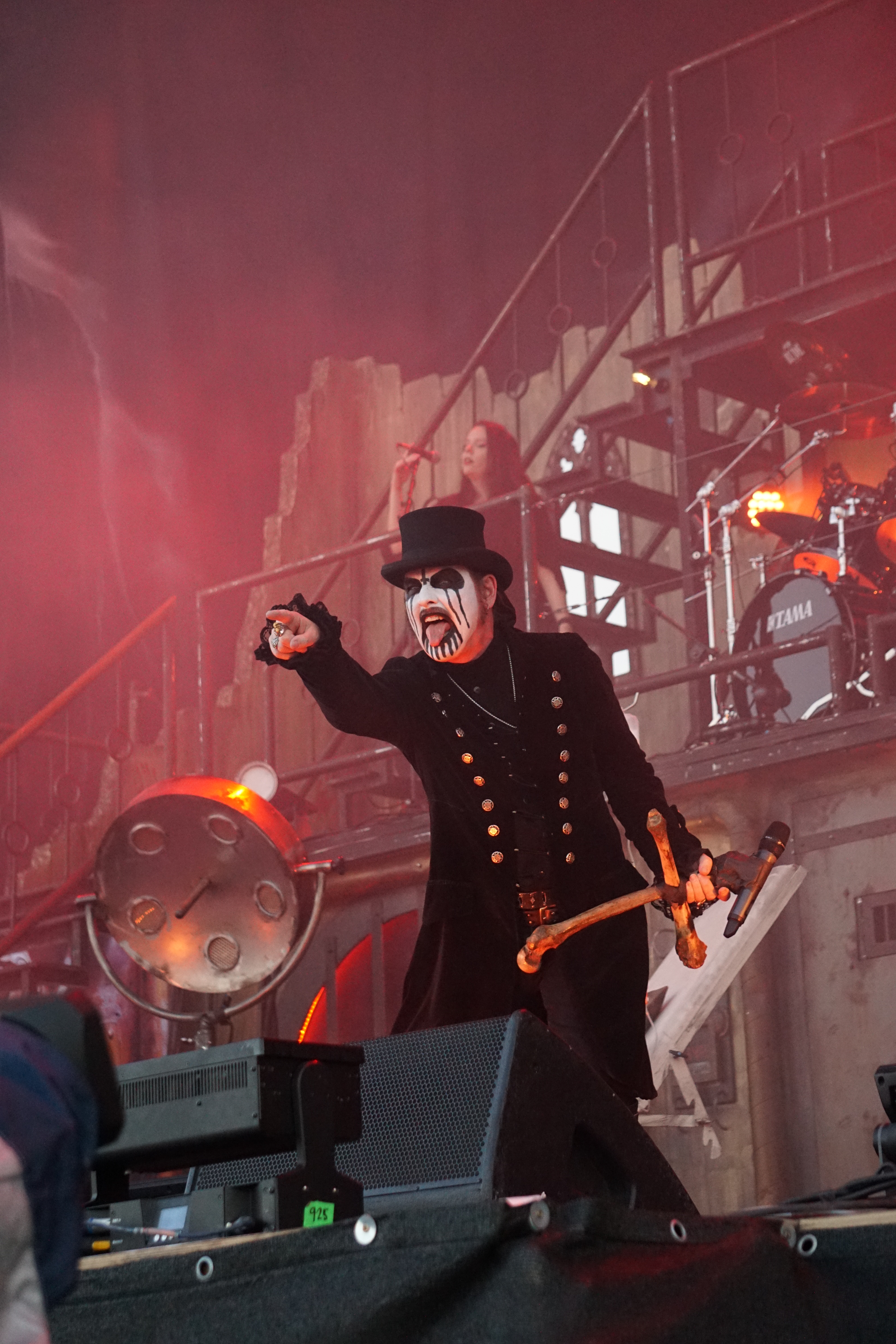 Wer jetzt auf die Bühne muss, hat eh einen schweren Stand. Vielleicht war das mit KING DIAMOND als Kontrastprogramm dann eine gute Idee. Der Oldschool-Metal kombiniert mit der Stimmlage (Falsett-Stimme) des Herrn Kim Bendix Petersen (bürgerl. Name) ist was Spezielles und nicht jedermanns Sache, deshalb war das Battlefield auch zunächst nur mäßig gefüllt. Ich persönlich schätze die Musik von MERCYFULL FATE und KING DIAMOND, konnte mir das Ganze aber bisher nicht länger als maximal eine LP-Länge antun. Den unvergleichlichen KING DIAMOND aber nun zum ersten Mal live zu erleben, verursachte selbst mir altem Hasen ein flaues Gefühl in der Magengegend. Für das zu erwartende Horrortheater war es anfangs eigentlich noch zu hell. Das Bühnenbild entführte uns in ein düsteres Sanatorium, mit einem rostigen Treppenaufgang rechts und links zu den oberen Stockwerken. In der Mitte, quasi im ersten Stock, war das Schlagzeug aufgebaut. Darunter befand sich zwischen zwei vergitterten Luftschächten eine Art Zellentür, die von zwei Gestalten in Mönchskutten geöffnet wurde. Auf einem Behandlungsstuhl liegend, wurde der King von den beiden zu “St. Lucifer's Hospital“ auf die Bühne geschoben. Die restlichen Musiker erschienen nacheinander im ersten Stockwerk und stimmten “The Candle“ an. Zum nächsten Stück “Voodoo“ erschien eine schwarz gekleidete Dame mit seltsamen Zeichen im Gesicht. Ihr galt es nun den Teufel auszutreiben. Und wieder tauchten die beiden Mönche auf, diesmal mit einem Kindersarg. Die darin befindliche Puppe wurde zu “Funeral“ von Mr. Diamond persönlich erdolcht und mit “Arrival“ wurden wir einem regelrechten Gitarrengewitter ausgesetzt. An dieser Stelle muss einmal erwähnt werden, dass der Sound an der Hauptbühne immer exzellent war und dabei spielte es keine Rolle wo man sich befand. Es war indes nicht nur der Sound, sondern selbstverständlich die Performance des dunklen Monarchen, der gesangstechnisch wohl so etwas wie seinen zweiten Frühling erlebte. Klar und dynamisch kletterte er nicht nur die Treppen sondern auch die Oktaven hoch und runter. Besonders brillant war der Vortrag von “A Mansion in Darkness“, jedoch sollten die Tracks aus der kreativen “Them“ - Phase noch kommen. Zwei der progressiven Sahnestückchen gab's dann auch mit Intro direkt hintereinander. Vor „“Welcome Home“ samt Oma und “Invisible Guest“ bekam die treue Gemeinde aber noch das neue Lied “Masquerade Of Madness“ vorgetragen, das dann auch gebührend gefeiert wurde. Mit dem akustisch angehauchten “Black Horsemen“ wurde die Horrorshow beendet. Ich hätte mir zwar noch den ein oder anderen MERCYFULL FATE Kracher gewünscht, insgesamt war die Darbietung aber immerhin gespickt mit vielen Highlights aus der frühen Schaffensphase des Edelsteinkönigs.