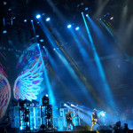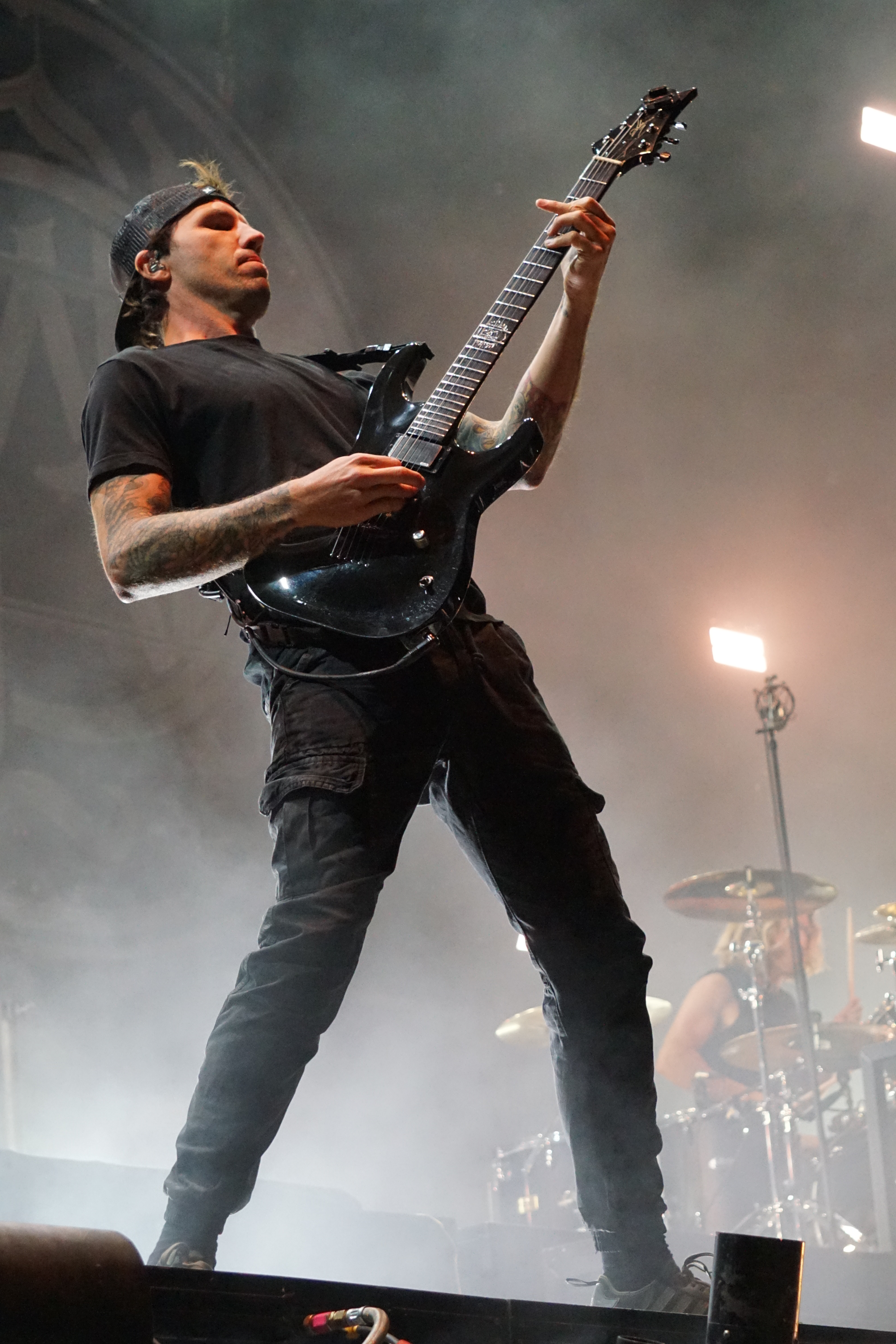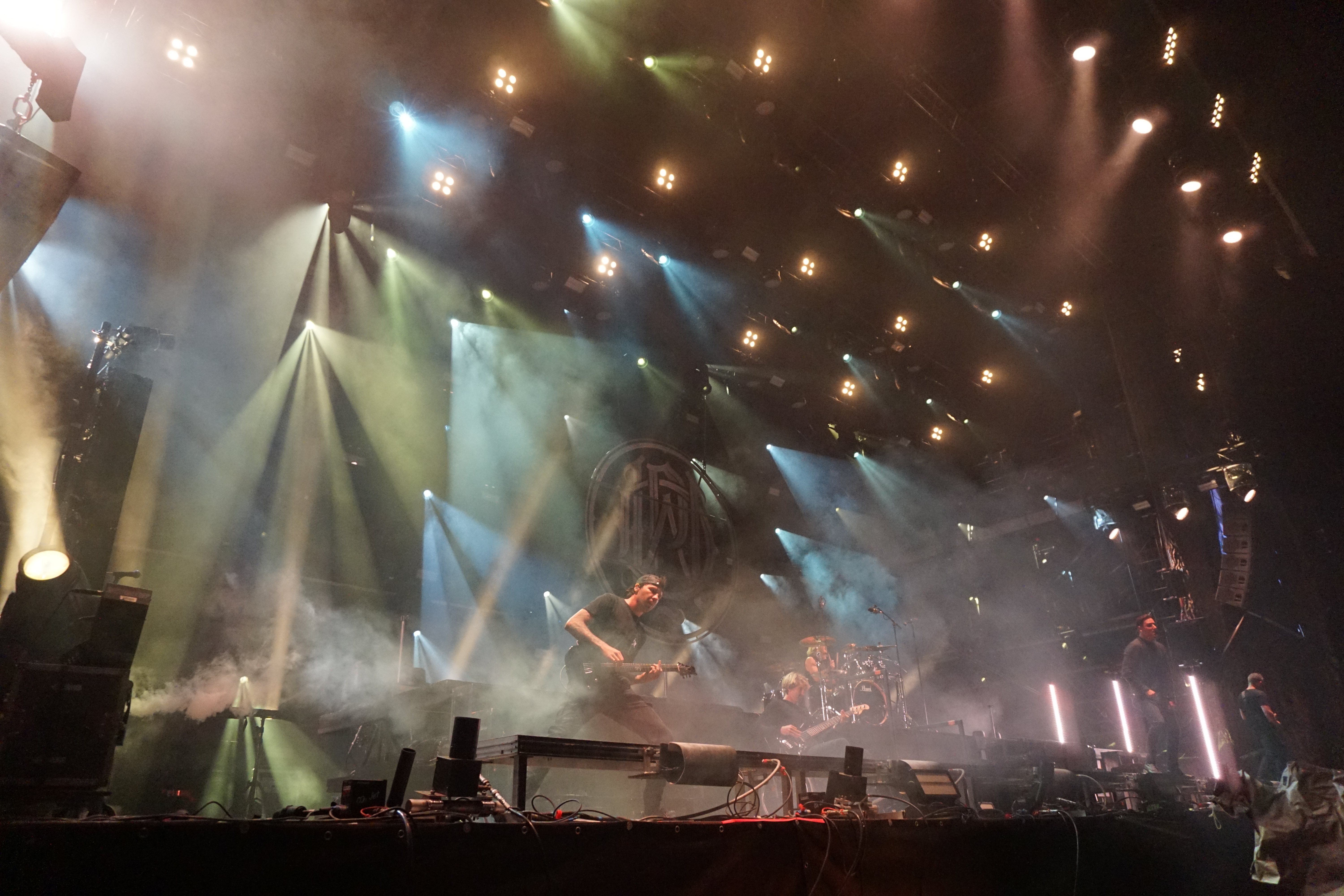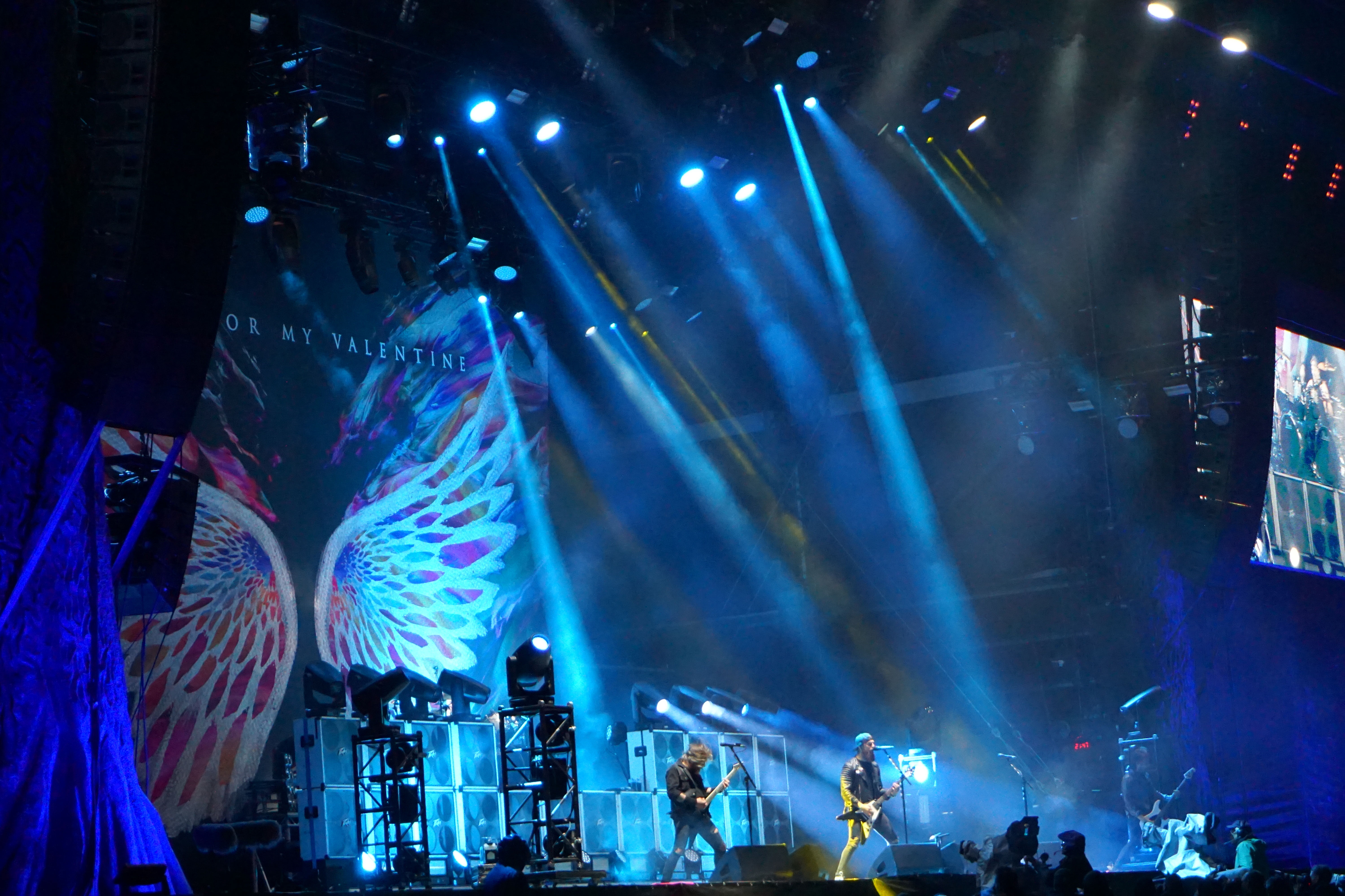Mit BULLET FOR MY VALENTINE wartete nun unser letzter Gig des Festivals auf uns. Alleine dafür hatten wir uns entschlossen, nicht schon mittags nach Hause zu fahren. Die Waliser hatten zwar zuletzt mit “Gravity“ eine eher schwache Scheibe auf dem Markt, bei der Hitdichte, die die Band aber im Backkatalog hat, störte das wohl Niemanden. Gut man hätte jetzt nicht direkt mit zwei Tracks aus diesem Werk anfangen müssen, aber so hatte der ordentliche Auftritt der Jungs wenigstens Steigerungspotential. Als dann „Your Betrayal“ angestimmt wurde sprang dann zügig der Funke auf das Publikum, das sehr Mädelslastig war, über. Die Bewegung, die den Protagonisten auf der Bühne ein wenig fehlte, machte die nun überaus aktive Menge laut mitsingend wieder wett. Ich hatte die in ihren Anfangstagen mal gesehen, als sie noch keinen Bartwuchs hatten, da gingen die ab, wie Schmitz Katze! Jetzt trägt Matthew Tuck Bart und das Ganze wirkt ziemlich statisch...ist aber jammern auf hohem Niveau. Wie bereits erwähnt , war der Sound bisher perfekt, jedoch kam es uns heute ein wenig leise vor, störte uns aber nicht weiter, da wir weit genug vorne waren, ging aber gut ohne Ohrstöpsel. Die Lightshow wirkte überaus stimmig und war einfach schön anzuschauen. Im letzten Drittel der Show wurde dann nochmal alles raus gehauen. Die Venomtracks: “You Want a Battle? (Here's a War)“ und “No Way Out“ gefolgt vom Oberkracher “Tears Don't Fall“ brachten dann sogar Lahme zum Gehen. Mit dem IMAGINE DRAGONS Cover “Radioactive“ (vom Band) entließ man alle Anwesenden zufrieden in die Nacht. Es hat sich doch noch für uns gelohnt zu bleiben.