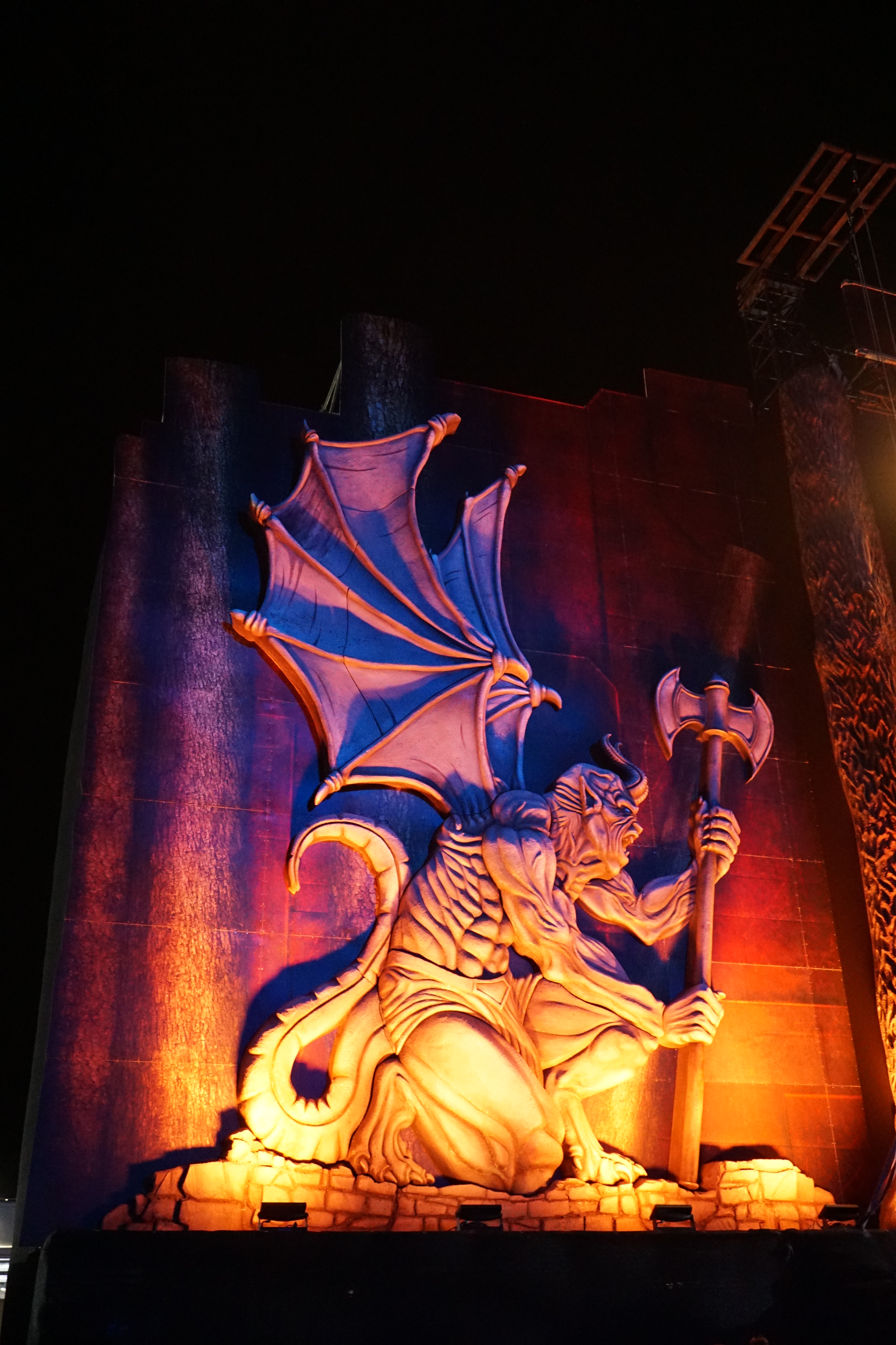 Als ich mich gerade so weg gebeamt in meiner 80er-Jahre-Welt in Nostalgie suhlte, erschienen vor mir zwei überdimensionierte Arcade Spielautomaten, auf denen Pac Man, Donky Kong oder ähnliches lief. War da jetzt der Äppler schuld, den ich schon reichlich genossen hatte? Nein, die Dinger standen wirklich da, auf der DRAGONFORCE Bühne, und in der Mitte grinste mir ein stählerner Drache aus einem Feuerball entgegen. Es ertönte kurz danach das Intro “Reaching Into Infinity“ und auf jedem der beiden Automaten tauchten die Gitarristen Herman Li und Sam Totman auf, die mit "Ashes Of Dawn“ loslegten wie die Feuerwehr. Was jetzt hier gespielt wurde, war wohl so etwas wie Space Invaders, bei dem Marc Hudson (Sänger) das Verteidigungsbollwerk mimte und die beiden Gitarristen ihre Salven abfeuerten. Gnadenlos wurde alles niedergemacht, was sich am Horizont zeigte...Level für Level. Zweistimmig gefuddelte Gitarrensolos mit 200 BpM rissen große Löcher in die feindlichen Ufo-Reihen. Der tapfere Marc pendelte zwischen den Konsolen und erhielt Unterstützung durch die, über die Crowd zahlreich surfenden Komparsen. Nun galt es dem Gegner den Gar aus zu machen, deshalb wurde zum finalen Schlag “Through The Fire And Flames“ ausgepackt. Jeder, der das Ding auf Guitar Hero mal probiert hat, weiß was dann folgte: GAME OVER!
