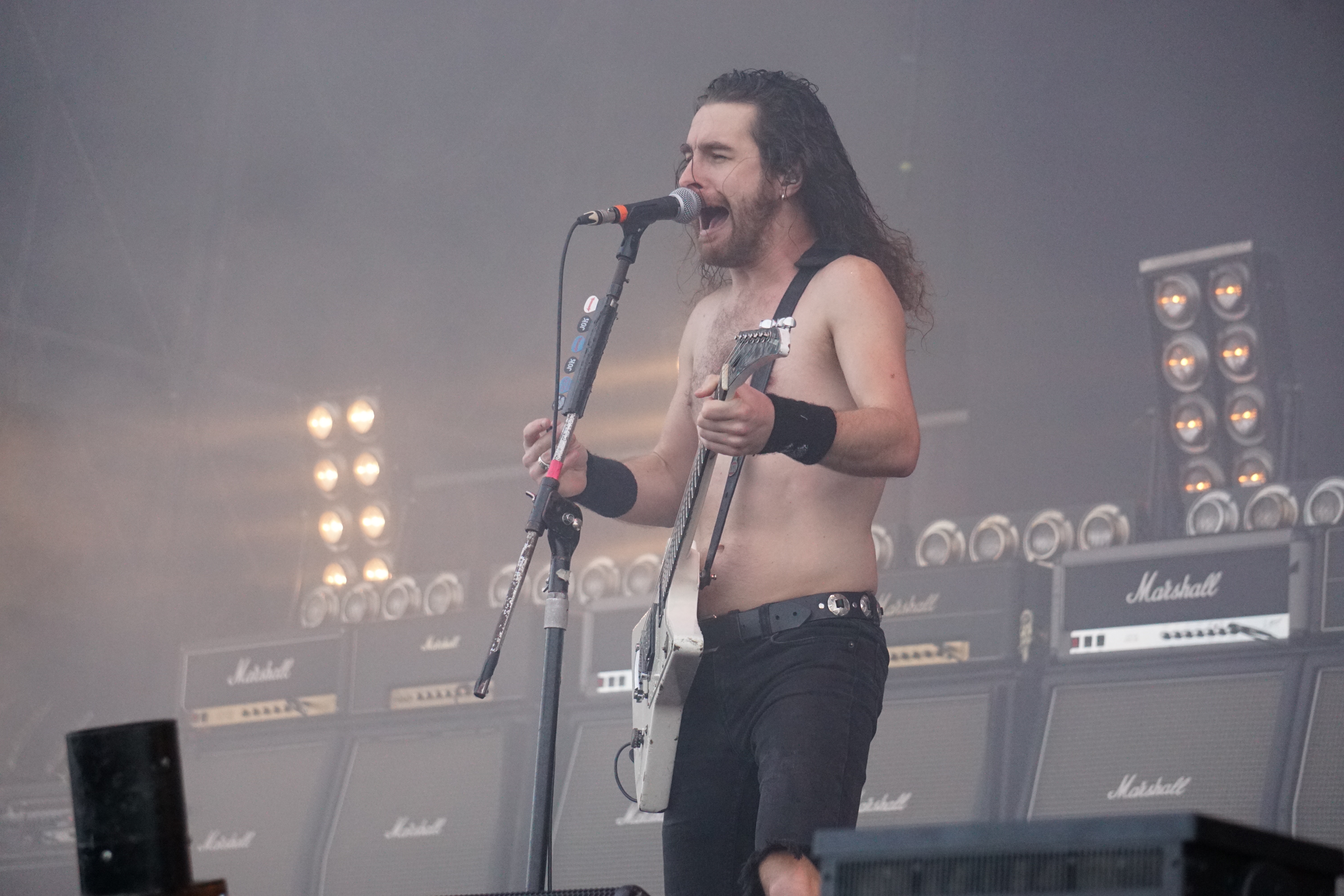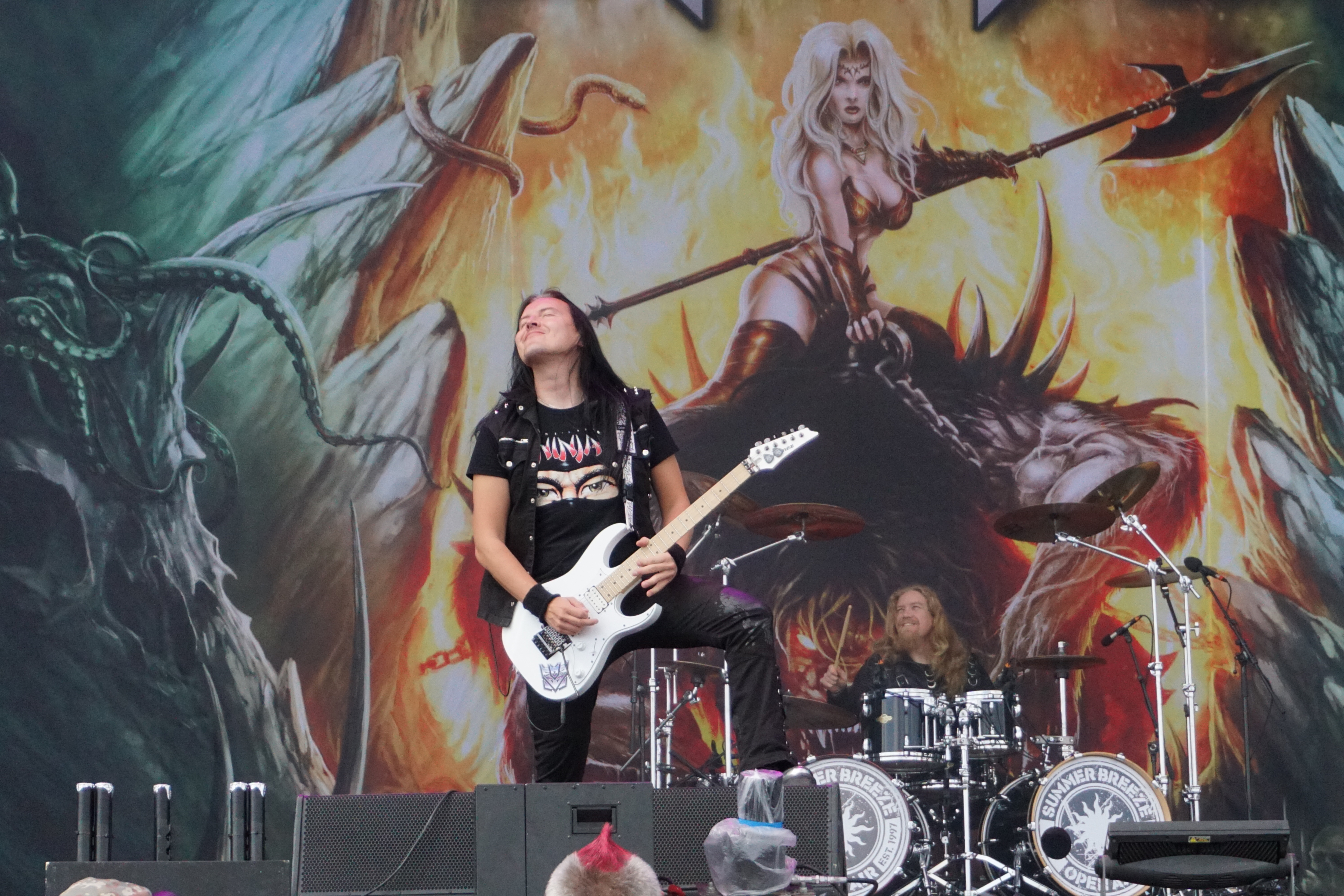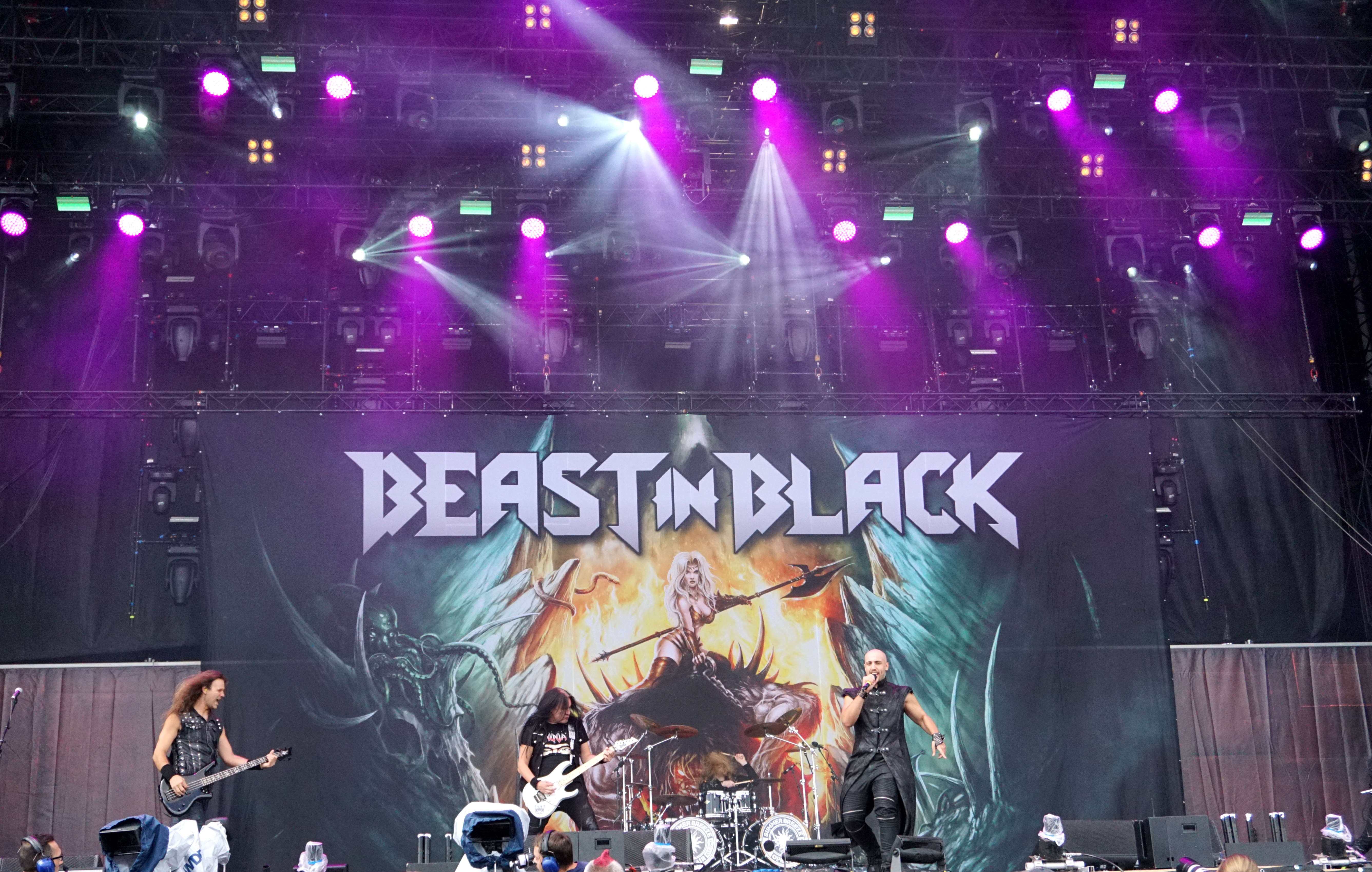 Der normale Ablauf nach dem Aufstehen um 11:00 Uhr war zunächst die Nahrungsaufnahme, Katzenwäsche, Zähneputzen und dann gemütlich mit Bier und/oder Äppler im Kreise der Nachbarn auf den kommenden Tag einstimmen. Heute musste aber letzteres leider nach hinten verschoben werden. Die AOR-Power Rocker von BEAST IN BLACK starteten bereits um fünf vor eins. Nach dem ganzen Knüppel aus dem Sack der letzten Tage waren die Jungs aus Finnland eine willkommene Abwechslung. Mit ihrer Abba goes Metal Mucke begaben sie sich zwar auf eine Gratwanderung, brachten dennoch irgendwie so was Frisches mit. Das aktuelle Werk “From Hell With Love“ ist ein Ohrwurmmonster, das ich lange auf dem Dreher liegen hatte, somit konnte ich aus Herzenslust fast alles mitsingen, wie alle Anderen an diesem sonnigen Mittag auch. Es ist immer was besonderes, wenn eine junge Band nur mit 2 Scheiben im Gepäck den kompletten Gig quasi mit dem Besten aus Beiden bestreitet. Den Start legten die Skandinavier natürlich mit “Cry Out For A Hero“ hin und schickten das begeisterte Publikum im Anschluss mit dem epischen “Unlimited Sin“ direkt ins Gänsehautzimmer. Immer wieder legte das Keyboard einen Teppich, der dann jäh von den Gitarren in klassischem Metal-Riffing zerrissen wurde, um sich alsdann zu einer Symbiose zu vereinen. Über all dem schwebte der perfekte, äußerst vielseitige Gesang von Yannis Papadopoulos...und alle grölten zumindest den Refrain mit! “Eternal Fire“ und das gefühlvolle “Blind And Frozen“ (mit Discointro) wirkten aufpoliert, mitreißend und fügten sich nahtlos zwischen das neue Material. Als im Abspann nach einer knappen Stunde der Robert Tepper Hit "No Easy Way Out" in der Version von BEAST IN BLACK lief, sah ich ringsum glückliche Gesichter und fühlte mich selbst mental wie frisch geduscht.