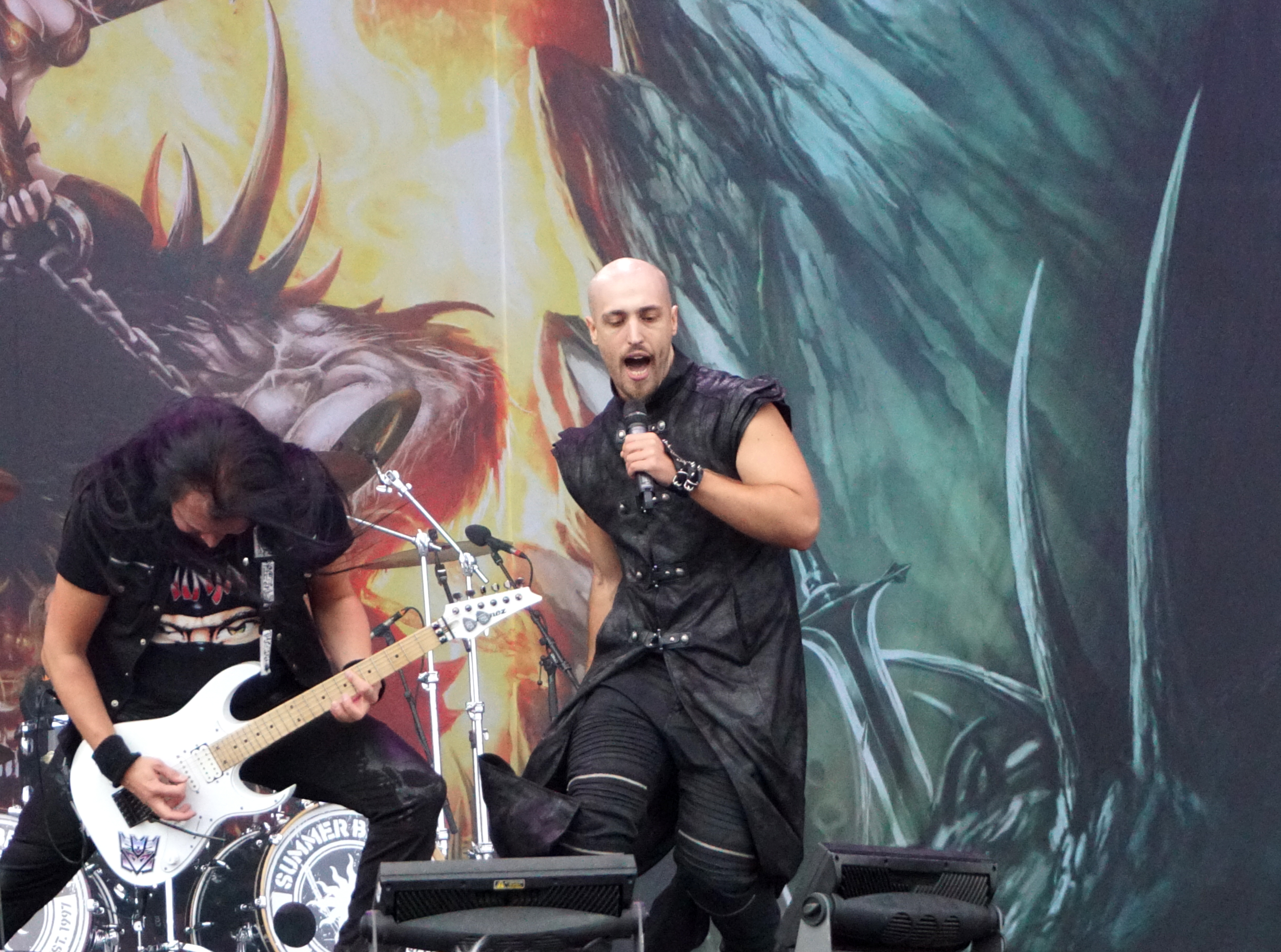 Die Füße meldeten sich wieder und verlangten nach Entlastung, mental waren wir aber noch so geflasht, dass uns noch der Sinn nach einem musikalischen Absacker stand. Vor der obligatorischen Nachtmahlzeit, genossen wir noch eine gute halbe Stunde vom HAMMERFALL Set, die ihre Sache im übrigen sehr gut machten.