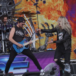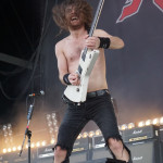 Ich komme aus der Generation, in der man sich zwischen KISS und AC/DC entscheiden musste. Meine Entscheidung ging zu Gunsten der Australier, da ist es nur logisch, dass mir AIRBOURNE besonders liegt. Aus unerklärlichen Gründen hatte ich es aber noch nicht geschafft, einem Auftritt der Combo beizuwohnen, deswegen freute ich mich auch schon tierisch darauf, diese Bildungslücke endlich zu schließen. Vom ersten Ton an war klar, was jetzt hier Sache war. Die Luft vibrierte vor Energie, Adrenalin, Testosteron und roch schon beim Zusehen nach Schweiß. In den folgenden 75 Minuten wurde eine richtig schön schmutzige Rock´N´Roll Party gefeiert und wer jetzt noch still stehen konnte, war entweder stocktaub oder gelähmt. Als ich jedoch neben den unzähligen Crowdsurfern, die sich auf die Bühne zubewegten, wie Haie auf eine blutende Beute, einen Rollstuhl über das ausgelassene Volk gleiten sah, musste ich das letzte Argument streichen. “Ready To Rock“ startete die wilde Sause (hatte ich mal als Klingelton :-)) und nach “Too Much, Too Young, Too Fast“ gab´s auch mit “Boneshaker“ direkt was Neues. Aber was ist schon so ne richtige Party, ohne Getränke. Diese Musik geniest man am besten mit einem Bier oder einem Whiskey. Das dachte sich Joel O’Keeffe (Sänger und Gitarrist) auch und gab dann gleich den Barkeeper. Er nutzte die Gelegenheit einen der ganz Großen des Rock zu ehren. Zu diesem Zweck wurde ein Flightcase mit dem Konterfei des Snaggletooth und der Aufschrift “Lemmy's Bar“ herein geschoben. An diesem Tresen mixte Joel dann ein paar Jacky-Cola (Lemmy´s Lieblingsdrink) und warf diese Plastikbecher so geschickt in die Zuschauer, dass nahezu nichts der köstlichen Flüssigkeit den Becher verließ. Leider konnten wir nicht sehen, was beim Adressaten passierte. Das Becherwerfen machte ihm so viel Spass, dass er immer wieder, diesmal mit Bier gefüllte Gefäße verteilte. Seltsamer Weise zierte das “Black Dog Barking“- Cover die Bühne als Backdrop (Hintergrundbild), gefeiert wurde aber großteils mit den Tracks der ersten Scheibe. Irgendwie werde ich das Gefühl nicht los, dass man solch energetische Veranstaltungen nur mit Bands aus Down Under erlebt, warum auch immer.