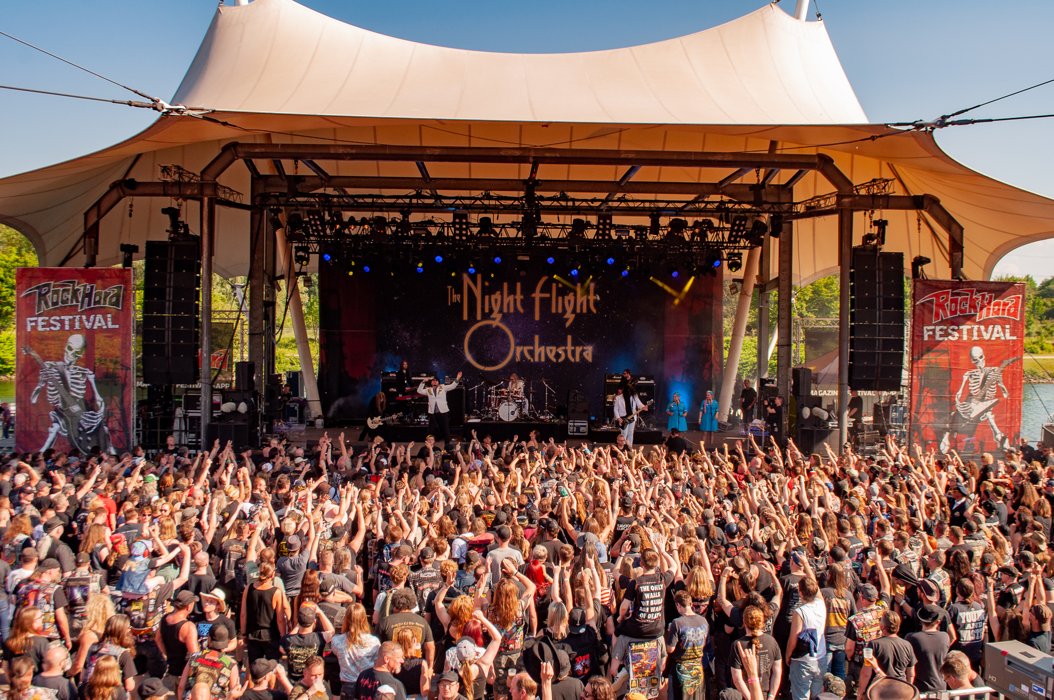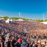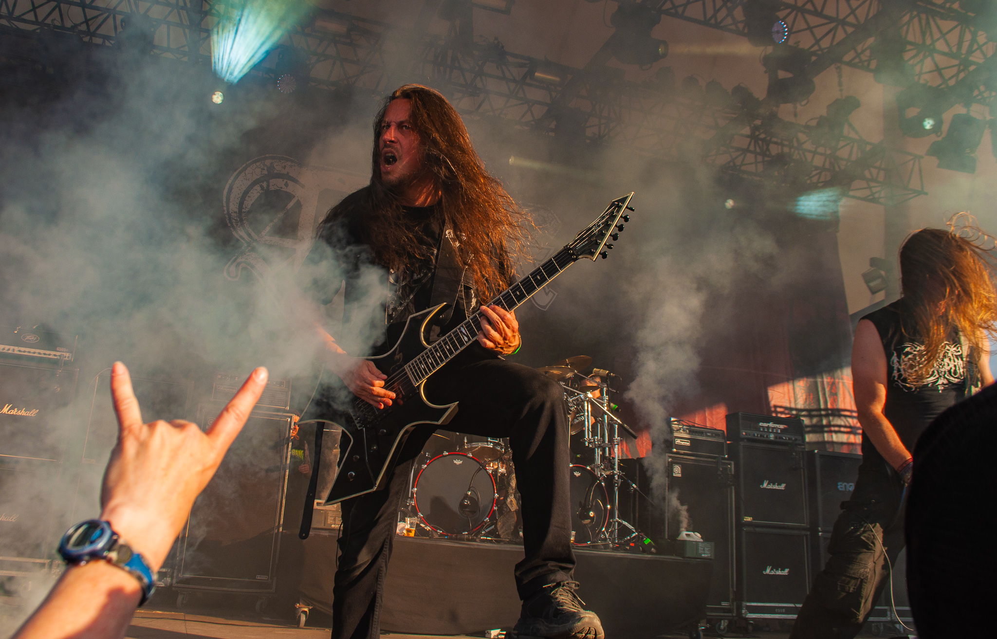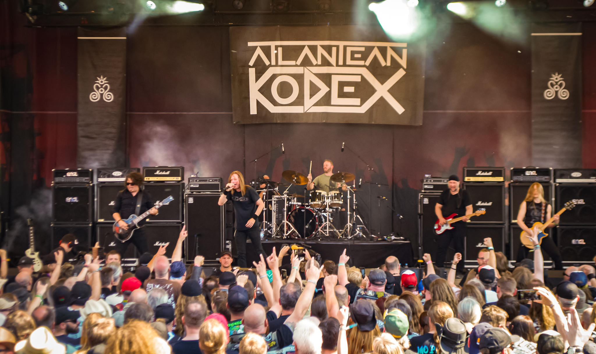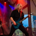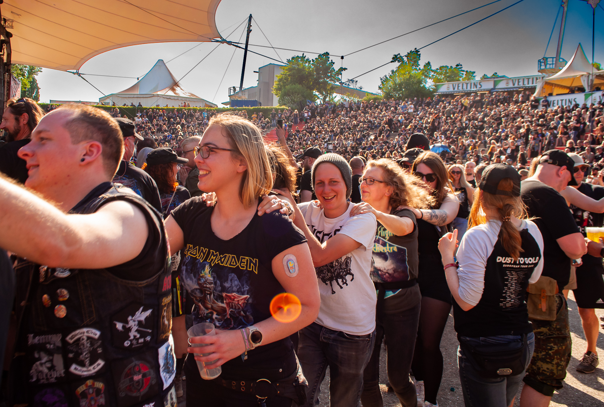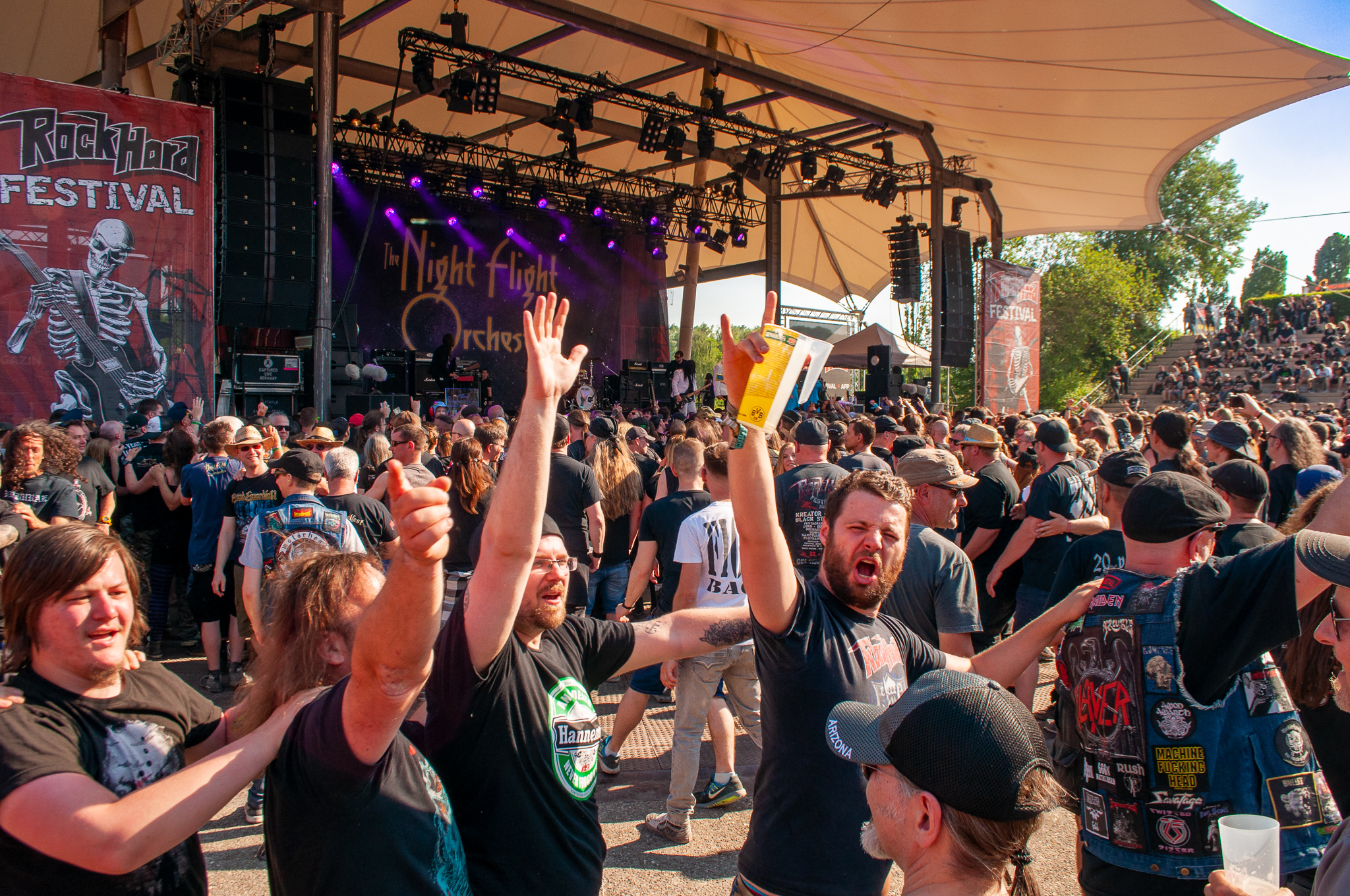 Fernab von Ballermann-Junggesellenabschieds-Tourismus gibt’s hier die für einen Rauschzustand ausreichende Dosis Heavy Metal. Ich reise Samstag an und werde auf dem Campingplatz entsprechend begrüßt: „hey du bist spät, du hast schon voll viel verpasst“. Die Festivalbesucher konnten sich am Vortag die Gehörgange bereits von Kapellen wie NIFELHEIM, AXXIS, HEATHEN und SACRED REICH freipusten lassen. Den Zeltaufbau versüßt mir der griechische Psychedelic Folk Rock von VILAGERS OF lOANNINA CITY, welcher vom mit gegrilltem Fleischgut verfeinerte Sommerwind über den Platz getragen wird. Höchste Zeit für ein kühles Pils und es geht, vorbei an dem reichhaltigen Angebot der Merch-Stände, ins Amphitheater, wo ATLANTEAN KODEX loslegen. Die Bayern klingen ein wenig nach ICED EARTH und können das Publikum mit klassischen Heavy Metal-Songs wie „Twelve Stars and an Azure Gown“ und „The Atlantean Kodex“ begeistern. Die Sonne scheint, die Stimmung ist gut und nach nur kurzem Umbau laden THE NIGHT FLIGHT ORCHESTRA ein, die verstaubten Stiefel aufzuziehen und in die Tanzschühchen zu schlüpfen. Die Truppe um den schwedischen SOILWORK-Fronter Björn Strid hat Arena Rock und zuckersüße Wohlfühlhymnen am Start. Das Projekt begann als spontane Schnapsidee und inzwischen veröffentlichte die Band ihr sechstes Studioalbum „Aeromantic 2“. Songs wie „White Jeans“ und „West Ruth Ave“ machen Laune, die Mucke ist aber auch ziemlich kurzweilig und seicht mit poppigen Disko-Einflüssen. Das Amphitheater ist in Bierlaune, das Tanzbein wird geschwungen und die Polenese ist auf dem Weg nach Blankenese.