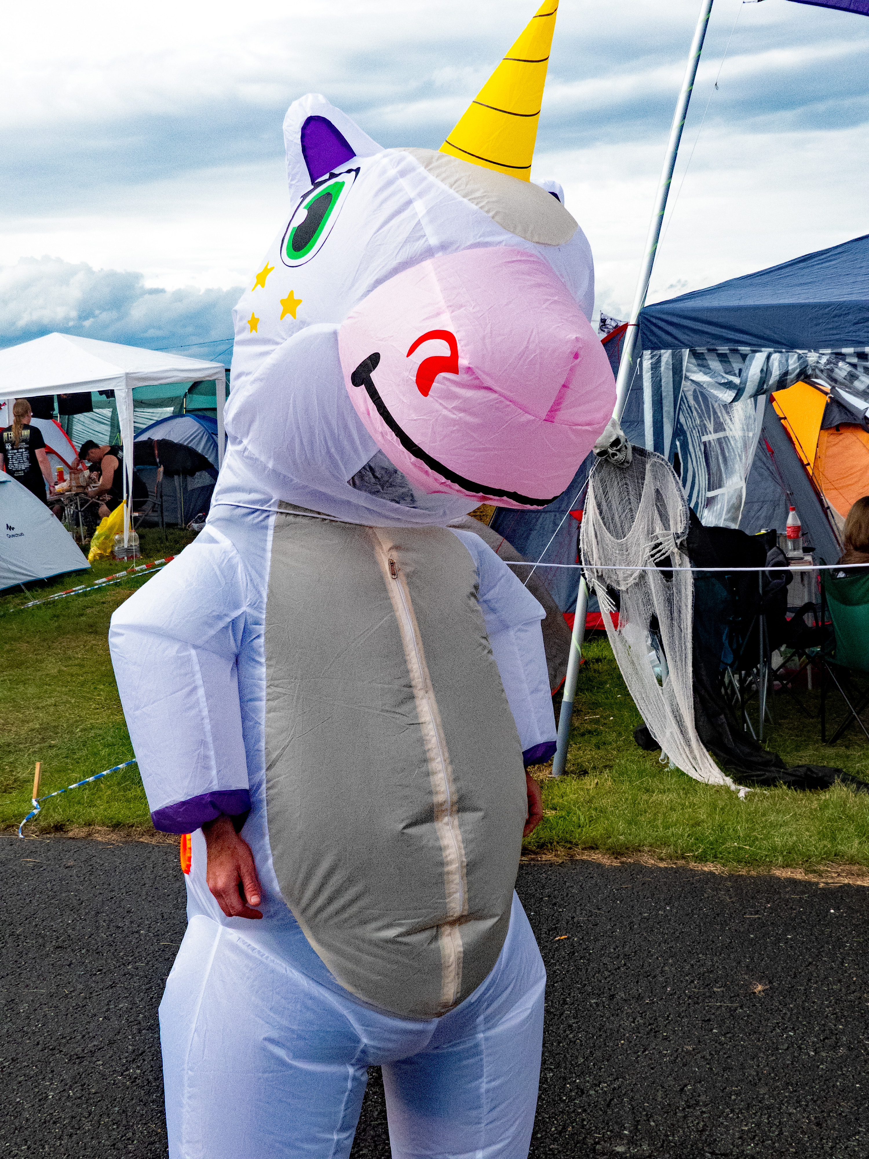 Sonntagvormittag auf dem M ´era Luna. Während manch einer nach durchfeierter Nacht noch im Zelt oder (die Bessergestellten unter uns) im Bett lag, saßen andere schon im Make Up-Zelt (welches andere Festival hat so etwas schon?), um sich dem Anlass entsprechend in Form zu bringen. Immerhin war für heute durchgehend trockenes Wetter gemeldet, es mussten also weniger Zugeständnisse an die Witterungstauglichkeit des Outfits gemacht werden und auch der Regenschirm durfte zuhause bleiben. Den Anfang auf der Bühne machten diesmal DRAGOL, die mit atmosphärischem Pagan Folk auf sich aufmerksam machten. Während auf der Club Stage MANNTRA mit einem Mix aus Metal, Mittelalter, Pyrotechnik und Partystimmung trotz noch früher Stunde für gute Laune sorgten, nahm der eine oder andere das noch relativ ruhige Festivalgeschehen zum Anlass für einen ausgedehnten Shoppingbummel entlang der verschiedenen Stände. Nur am Festival-Merch-Stand herrschte gähnende Leere in jeder Hinsicht: das diesjährige Angebot war praktisch restlos ausverkauft, was die Verantwortlichen schließlich dazu veranlasste, noch übriggebliebene Restbestände aus früheren Jahren feilzubieten, um wenigstens nicht ganz ohne Ware dazustehen. Übrigens gab es ganz stilecht sogar schwarzes Eis: in verschiedenen Sorten und unterschiedlicher Abtönung, im Großen und Ganzen aber definitiv schwarz. Der Spaß hatte seinen Preis, aber man gönnt sich ja sonst nichts. Mittendrin war auch wieder das (L)Einhorn, dass sich von seinem gutgelaunten „Besitzer“ fröhlich tanzend über das Gelände führen ließ und trotz der zweifelsohne tropischen Temperaturen, die ihm Inneren des Kostüms herrschen mussten, unverdrossen Modell für Fotos stand und auf Wunsch bereitwillig (L)Einhorn-Umarmungen verteilte.