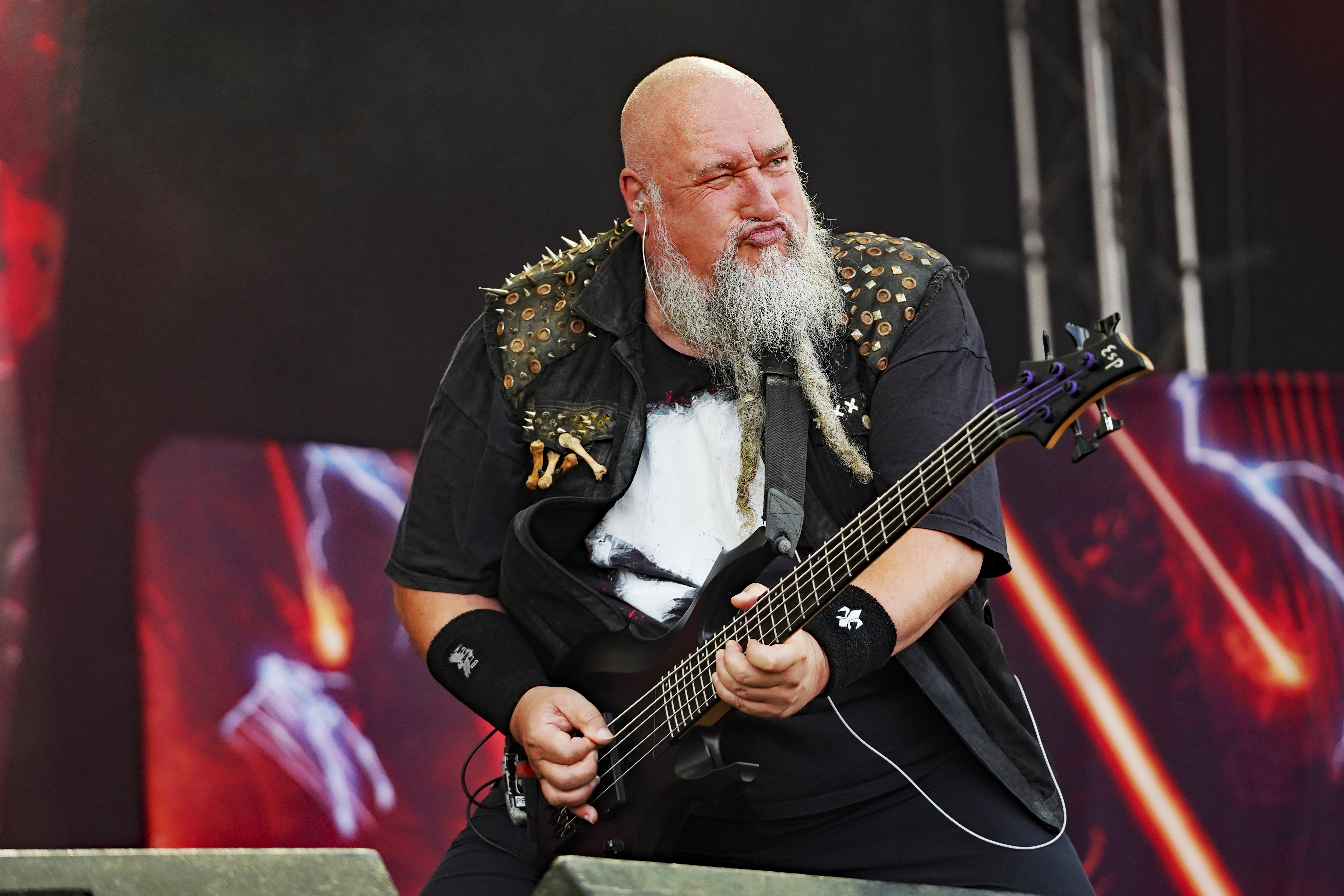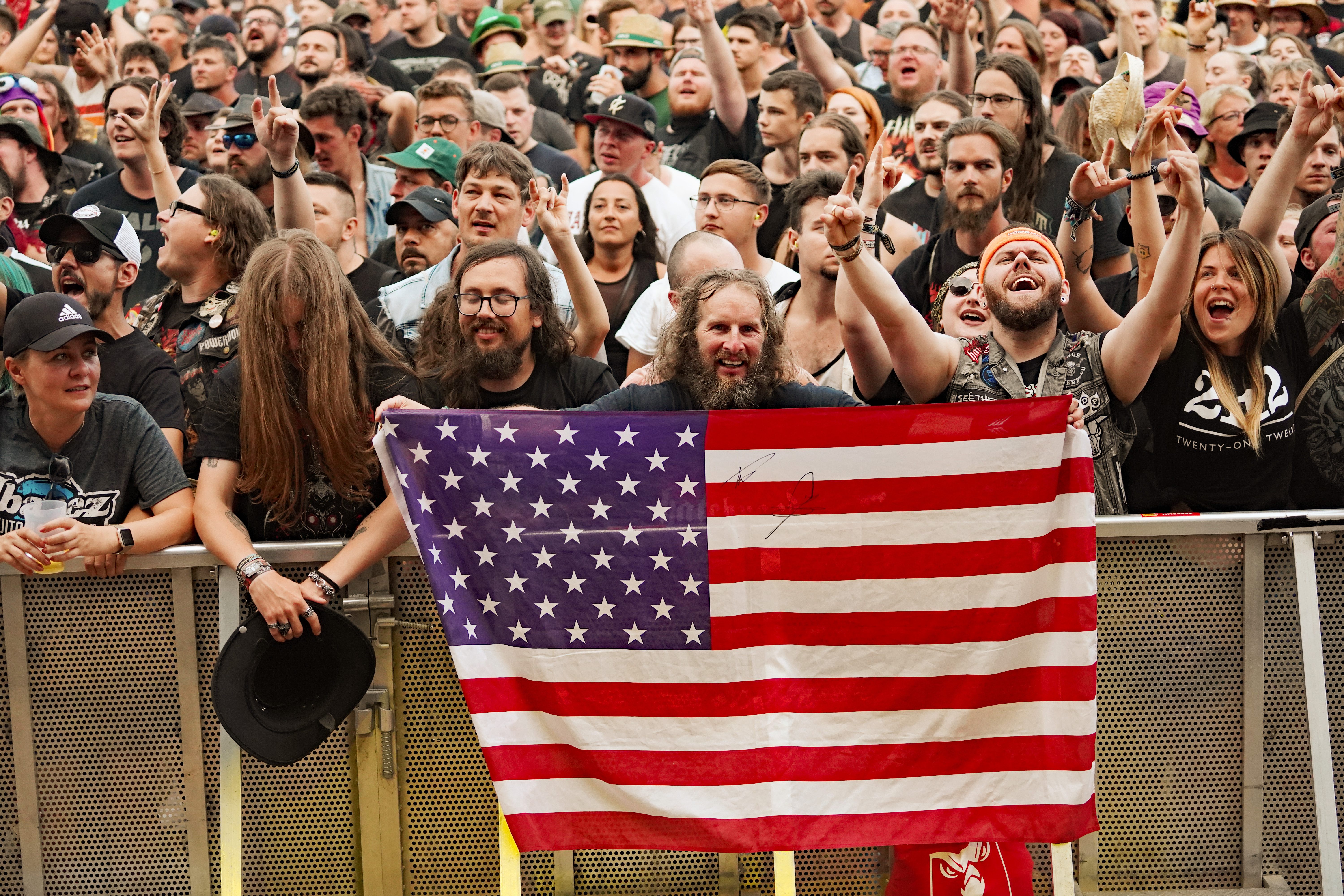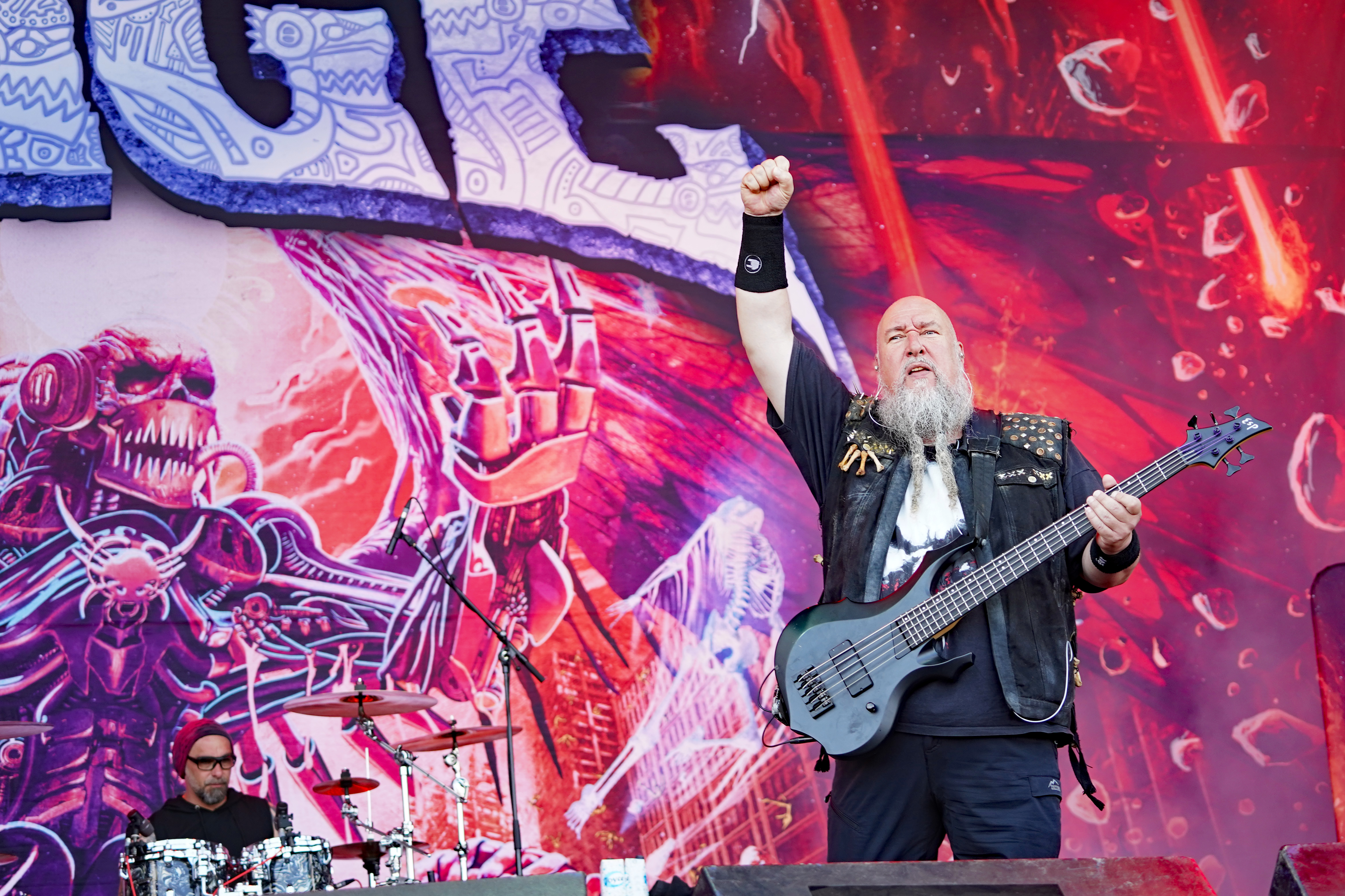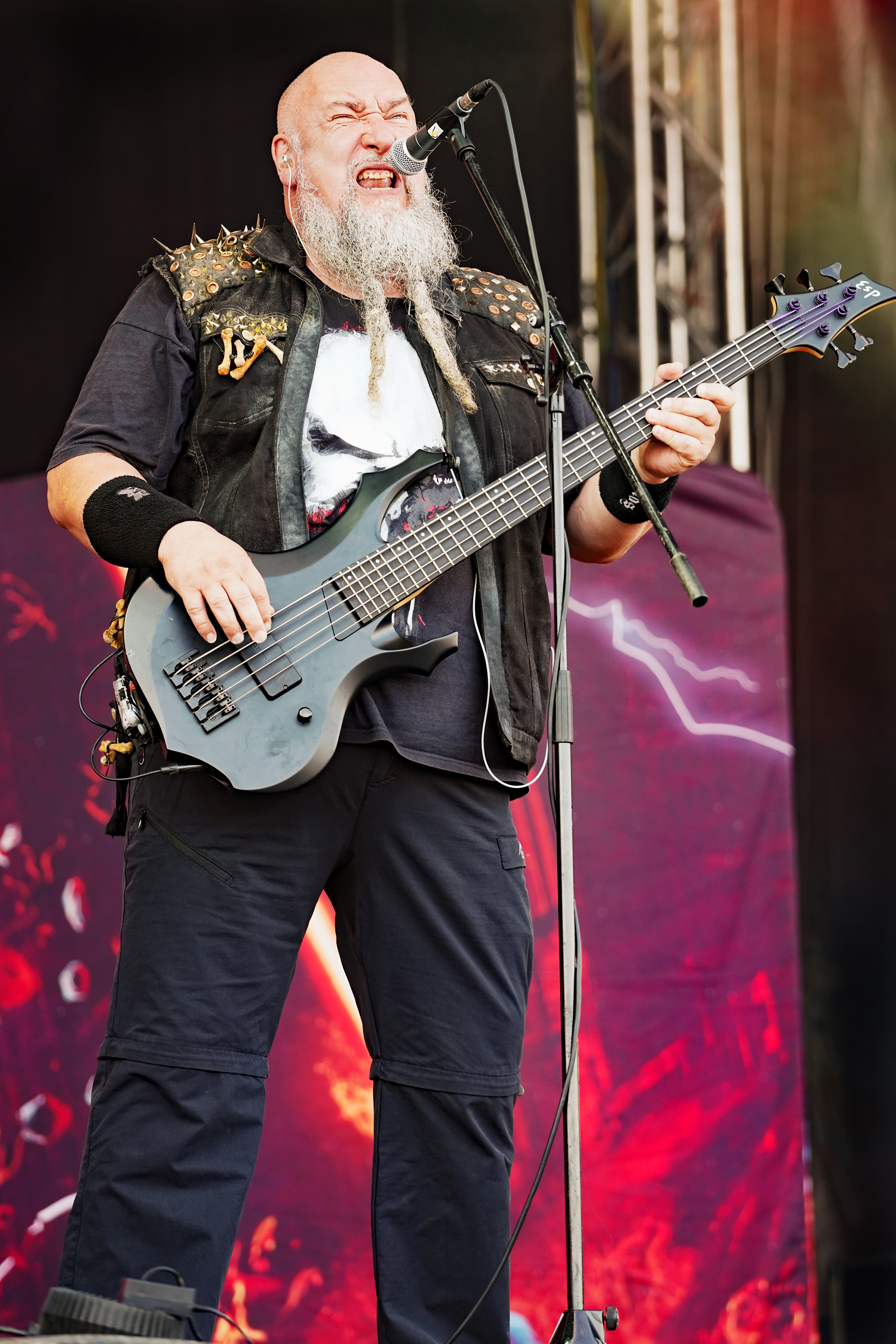 Für uns starteten RAGE auf der T-Stage den samstäglichen Konzertreigen mit einem Sack voll altem Zeug. Ich hatte mich darauf gefreut, die Rabauken aus Herne endlich mal wieder live zu erleben. Gerade die letzten beiden Longplayer hatten es mir angetan. Obwohl ich ein Fan der ersten Stunde war, spricht mich aktuell der nicht mehr ganz so hohe Gesang von „Peavy“ enorm an. Wie auf der eigenen Homepage angekündigt, rocken die Jungs gegenwärtig wieder als Trio, da sich Stefan Weber (Gitarre seit 2020) eine Auszeit aus persönlichen Gründen auf unbestimmte Zeit genommen hat. “Resurrection Day“ leitete das Set erwartungsgemäß mit Vollgas ein. Es sollte allerdings der einzige Song aus den neueren Veröffentlichungen bleiben. Gemäß dem klassischen Dreier-Line-Up wurde der Rest der Show überwiegend mit Material aus den 90ern bestritten. Sowohl die Musikanten, die fast unentwegt grinsten, als auch das Publikum, das u.a. allerlei bizarres Getier mit sich führte (z.B. einen präparierten Dachs!!!), waren mit ordentlich Begeisterung bei der Sache, so daß der Platz vor der Bühne zeitweise in einer Staubwolke verschwand. Gerade zum Ende hin ging mit “Straight To Hell“, der Nummer aus “Der Schuh des Manitu“, “Don't Fear The Winter“, meinem persönlichen Lieblingstrack (...ja die 80er waren auch vertreten) und “Higher Than The Sky“ so richtig die Post ab. Meister Grimbart wäre vor Freude sicher auch umhergesprungen, wäre er noch lebendig gewesen.