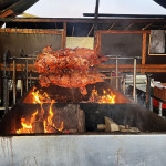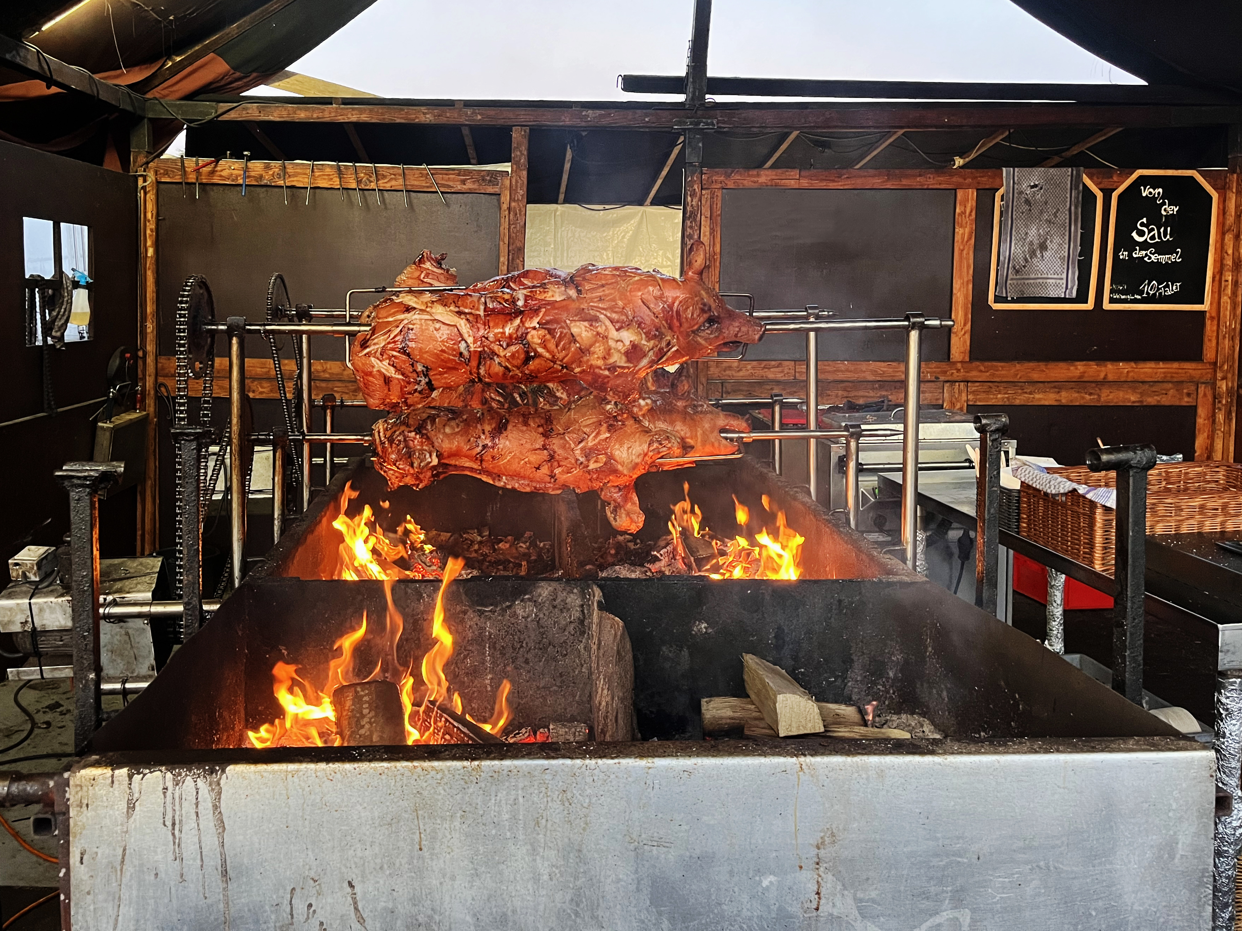 Zu guter Letzt schlenderten wir ausgedehnt an den Essensständen entlang, da wir uns vor der Heimfahrt noch einen Snack gönnen wollten. Im Vergleich zum Vorjahr, waren allerorts die bereits überhöhten Preise für die Speisen nochmals angehoben worden. Gleichzeitig waren an dem eine oder anderen Stand die Portionen kleiner geworden. Die Qualität der Speisen hatte obendrein bei einigen Anbietern nachgelassen. Den Vogel schoß der Döner Stand ab, an dem das Wort „Döner“ mit einem einem Tape überklebte war auf dem „Fleischspieß“ stand. Wir waren uns aber nicht sicher, ob diese schleimige rose Masse, die da auf dem Spieß hing, wirklich Fleisch war.