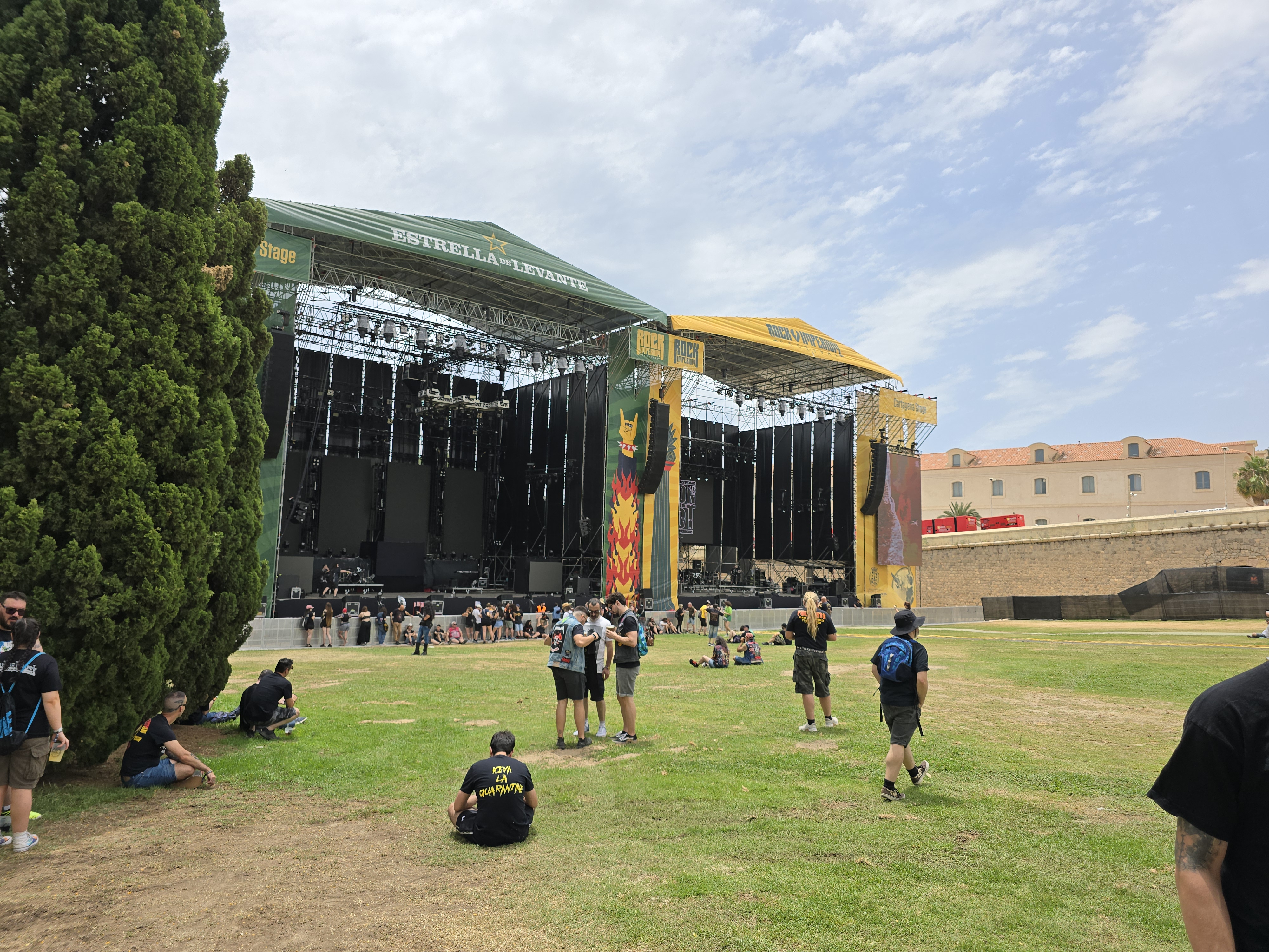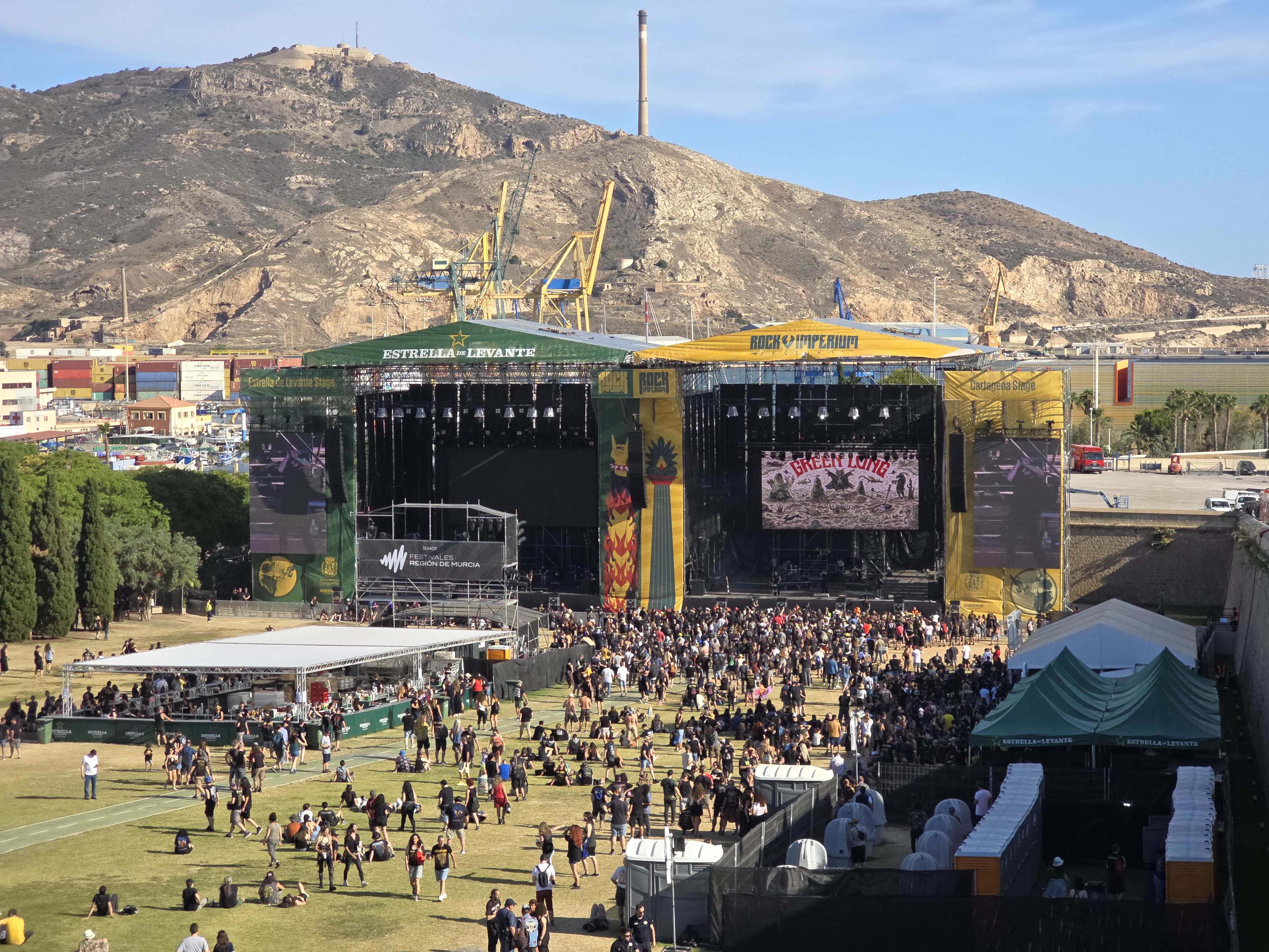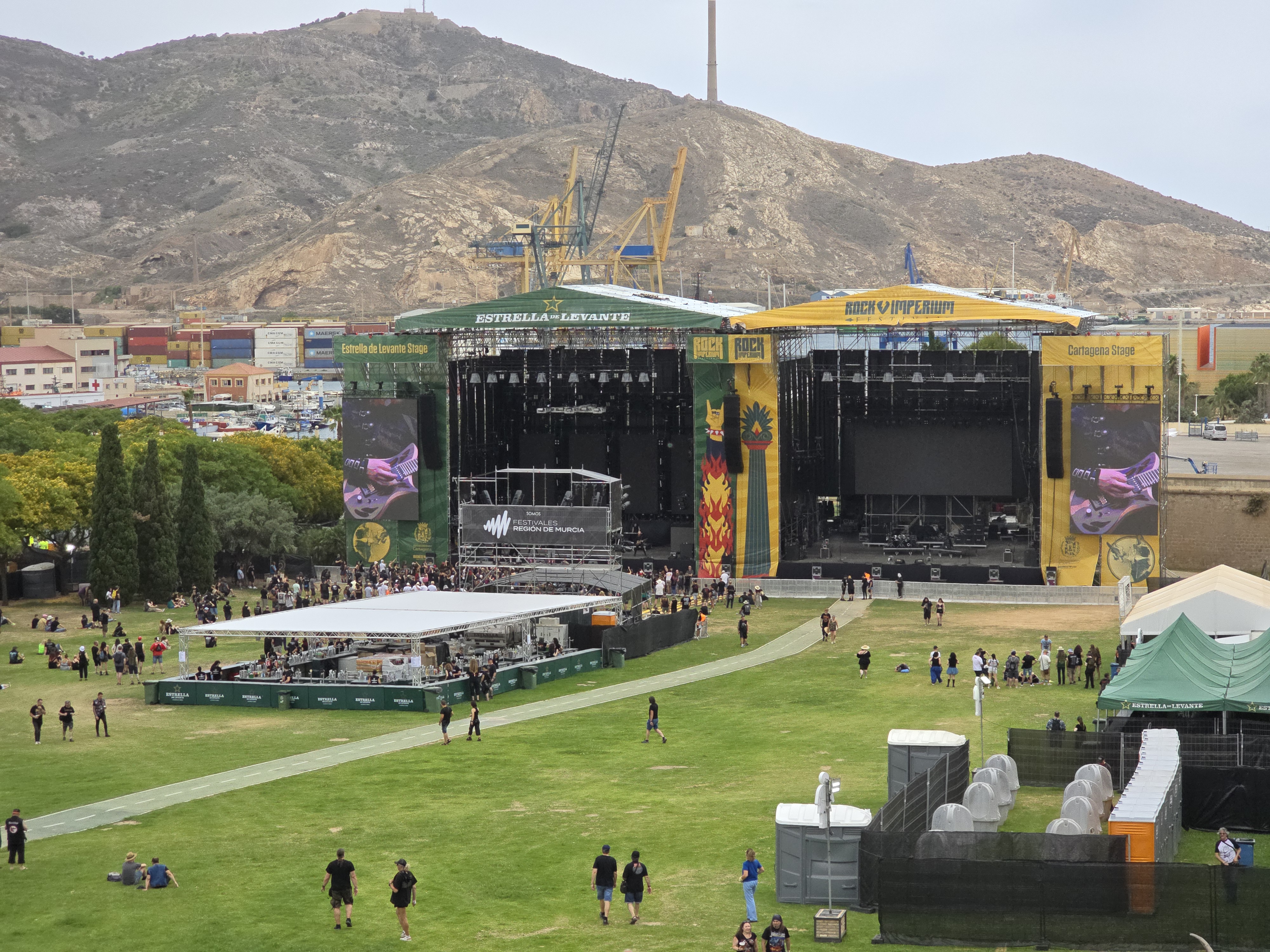 Die Wegzeit von Murcia nach Cartagena beträgt ca. 45 Minuten. Der Parkplatz (welcher umsonst ist) teilt man sich mit einem Einkaufszentrum und bietet mehr als genug Platz. Der Shuttlebus steht schon bereit und für 2 € bringt dieser uns jeden Tag in einer knappen Viertelstunde zum Festivalgelände und zurück und das jedes Mal ohne nennenswerte Schlangen oder Wartezeiten. Das gilt übrigens für das ganze Festival: Alles geht ruckzuck und ist super durchorganisiert. Keine Wartezeiten beim Eingang, saubere Toiletten und keine Wartezeiten an den vielen Getränkeständen. So macht Festival Spaß. Das Festival selbst ist wunderschön gelegen zwischen Hafen, alten Befestigungsanlagen und der Universität.