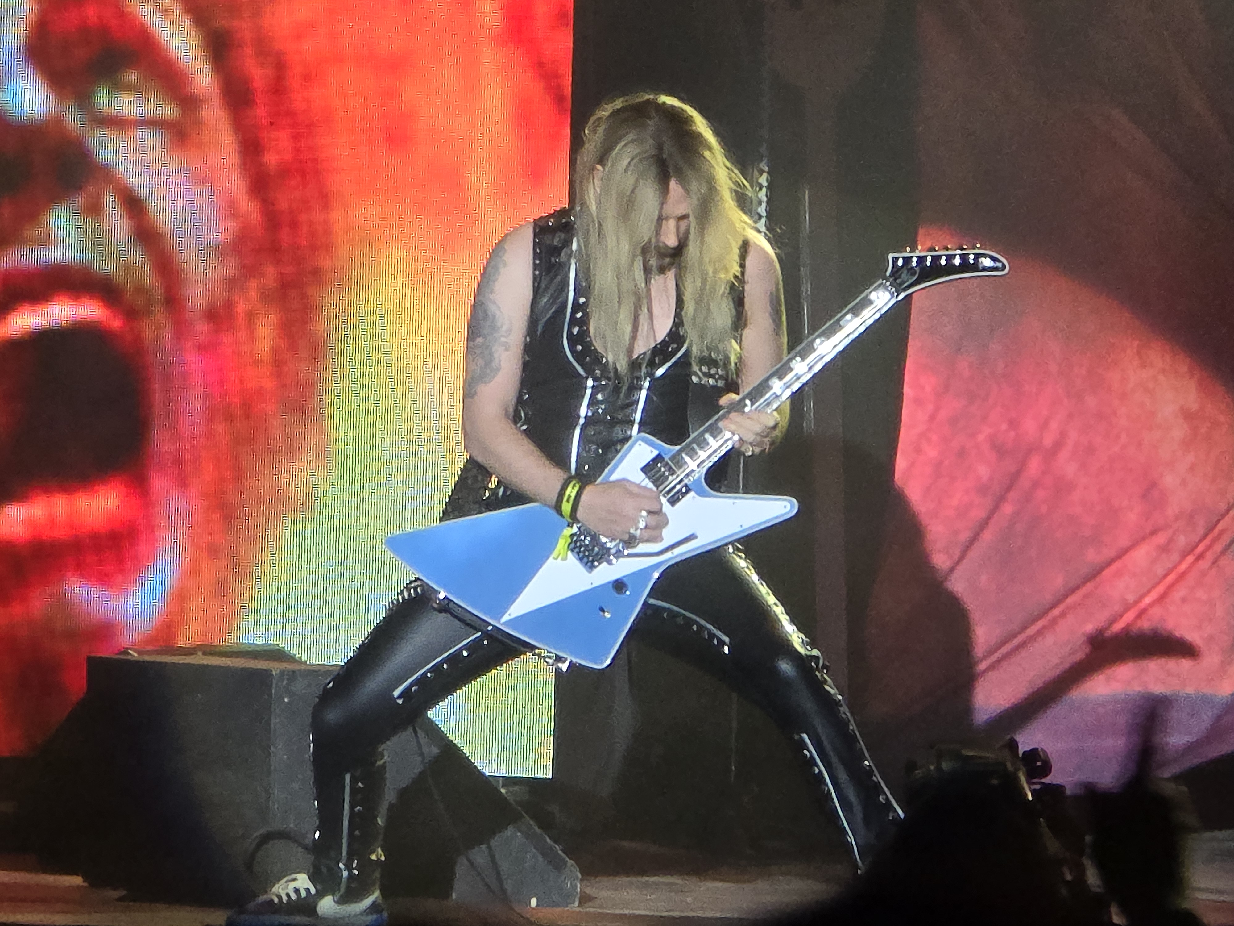 Auch wenn BEAST IN BLACK schon mit elegantem Synchronposing punkten konnten, erfunden haben es andere: ACCEPT. Phil Shouse fill-in Joel Hoekstra wirkt wie ein vollwertiges Bandmitglied und macht von den ersten Klängen an mächtig Alarm. ACCEPT starten mit dem neuen „The Reckoning“ und irgendwie werde ich das Gefühl nicht los, dass es sich aktuell viel mehr nach Band anfühlt als die Jahre zuvor. Klar, ist Wolf der Chef aber immerhin haben alle drei Gitarristen in den ersten drei Songs schon ihre Solospots und neben Joel und Wolf kommt auch Uwe immer mal wieder an den Bühnenrand. Es ist schön zu sehen, dass die Verantwortlichkeiten wohl besser aufgeteilt werden. Auch Mark Tornillo ist gut drauf und kreischt sich kompetent durch neu und alt. Ich bin zwar kein großer Freund von Medleys, aber bei einem solch langen Backkatalog ist das wohl die einzige Chance und so gibt es „Demon’s Night / Starlight / Losers And Winners / Flash Rockin‘ Man“ heute in der Kurzversion. Mit „Shadow Soldiers“ oder „Dying Breed“ beweisen ACCEPT dass sie aber auch im aktuellen Drittel ihrer Karriere noch tolle Songs schreiben können. Dennoch sind es natürlich „Princess Of The Dawn“, „Balls To The Wall“ und „Fast As A Shark”, welche die besten Reaktionen hervorrufen. Ein starker und eigentlich headlinerwürdiger Gig, wenn da nicht noch…