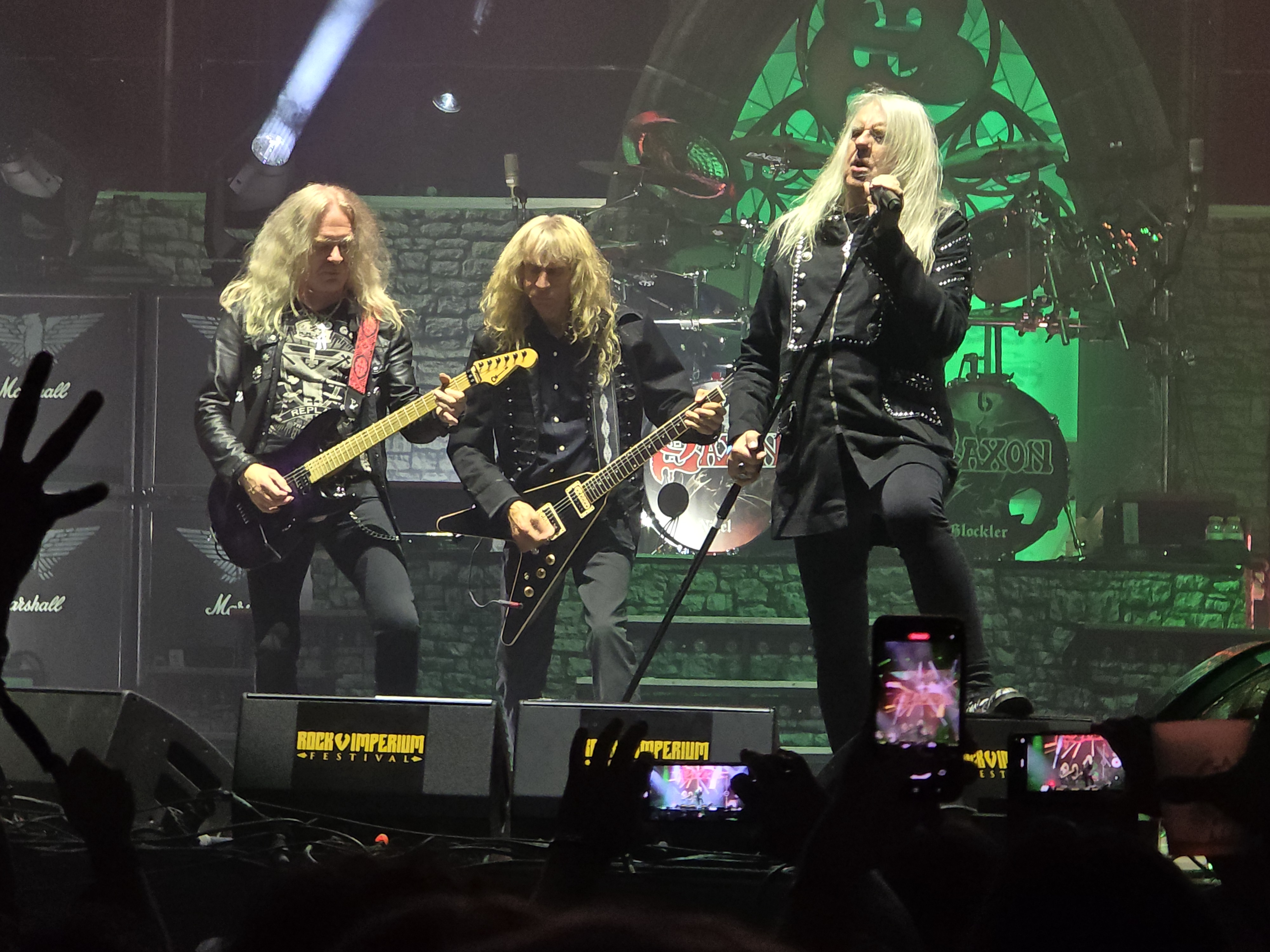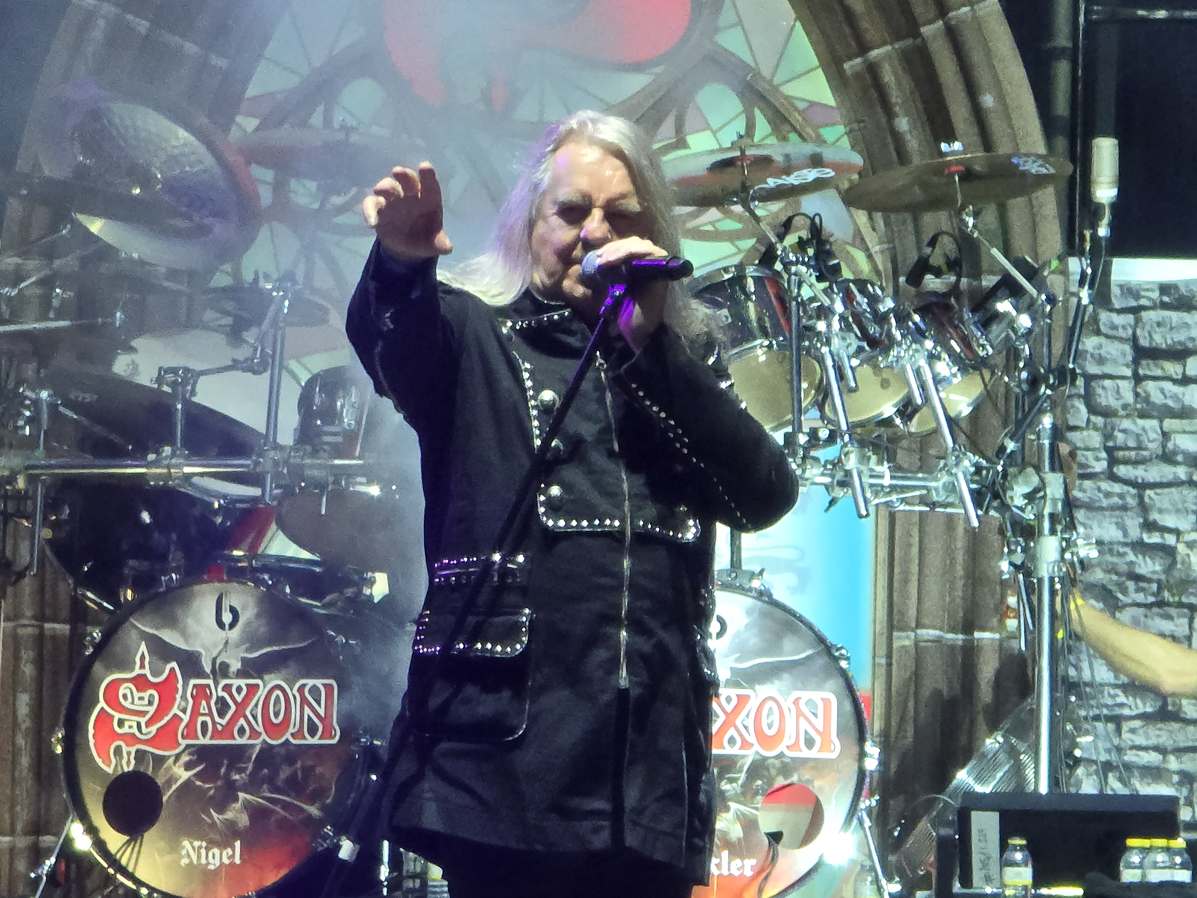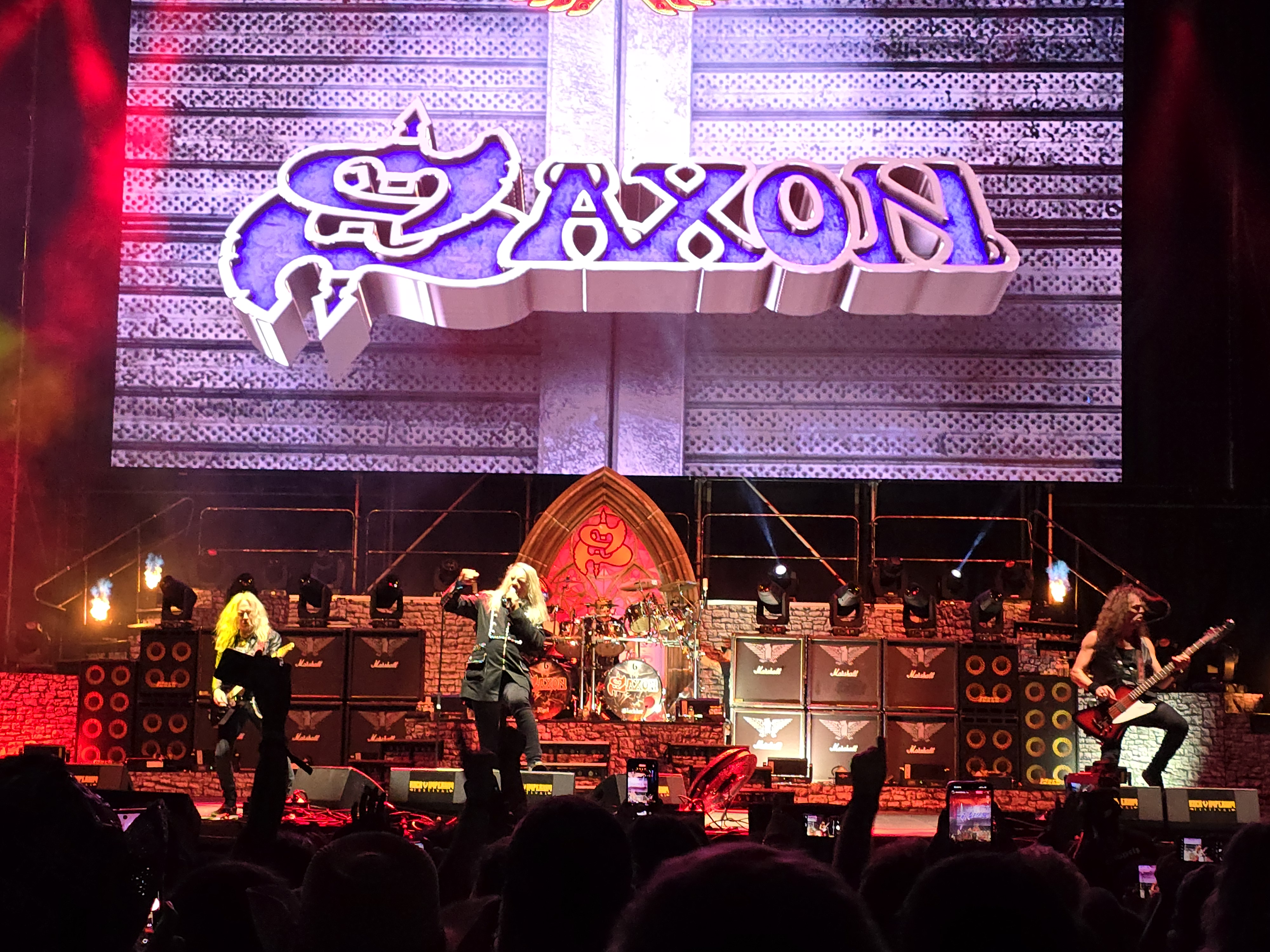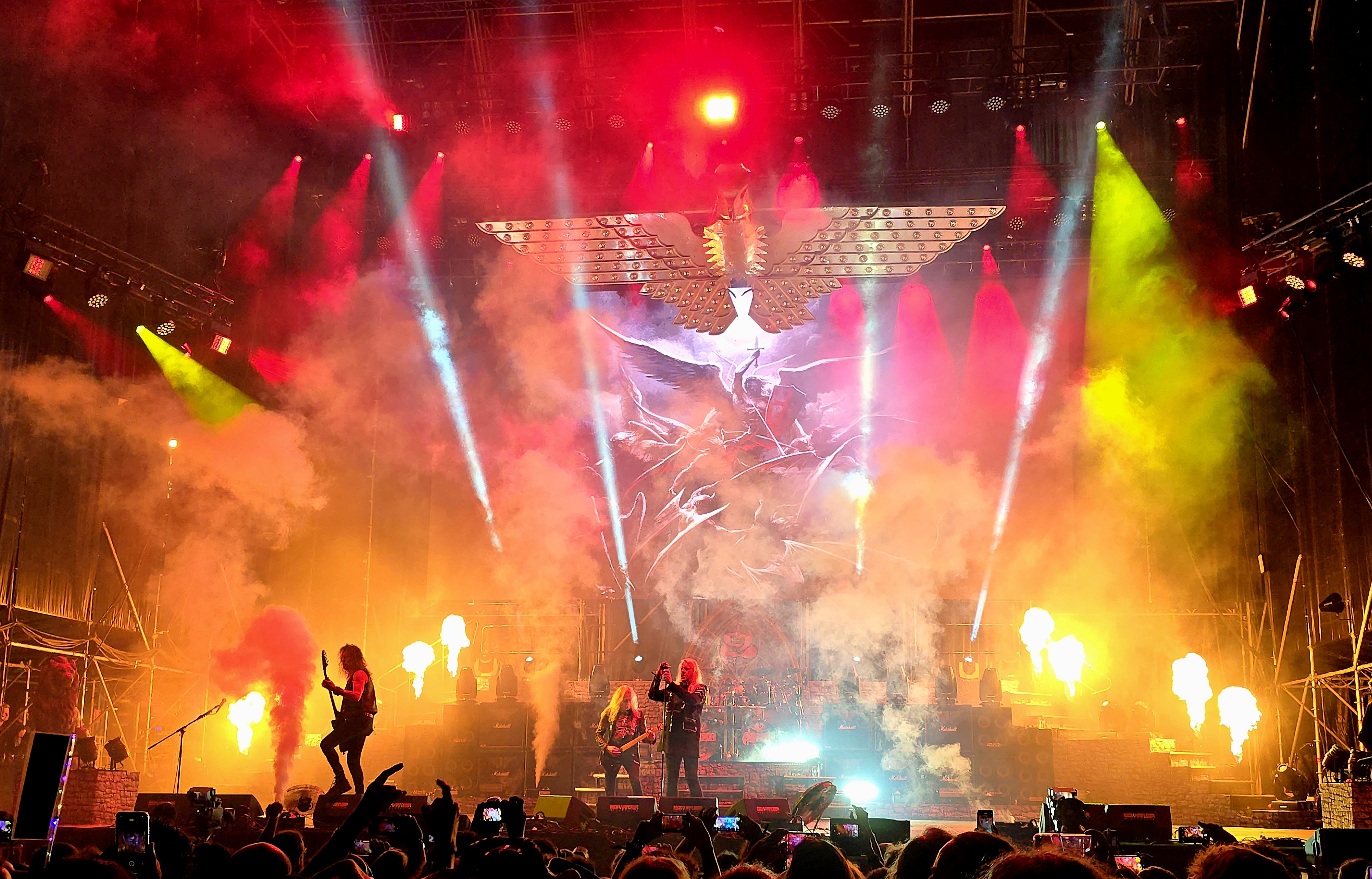 Mighty SAXON auf dem Plan stehen würden. Ich müsste Biff und seine Männer nun schon über 30-Mal gesehen haben und es wird einfach nie langweilig. Die Power und die Spielfreude der alten Recken sind bewundernswert. Traditionsgemäß startet man mit dem Titelstück der aktuellen Scheibe. In diesem Fall „Hell, Fire & Damnation“. Bei tollem Licht, knalligen Pyros und perfektem Sound leitet ein gut aufgelegter Biff sodann in „Motorcycle Man“ über und es kann keiner mehr stillstehen. Am wenigsten Nibbs Carter, welcher immer noch headbangend über die Bühne rennt, als wäre er 25. „Power And Glory“ wird viel umjubelt und als bei „The Eagle Has Landed“ alle Lichter des legendären Saxon-Adlers angehen, wird es in Cartagena noch einige Grad heißer als ohnehin schon. Brian Tatler ist mittlerweile nicht mehr wegzudenken und auch Doug Scarratt bringt sich mehr ein als früher. Zeremonienmeister Biff Byford, dem man seine 72 Jahre zu keiner Sekunde anhört, leitet souverän durch den Abend und zieht mit seinem Charisma jeden in den Bann. Nach „Princess Of The Night“ sieht man nur glückliche Gesichter.