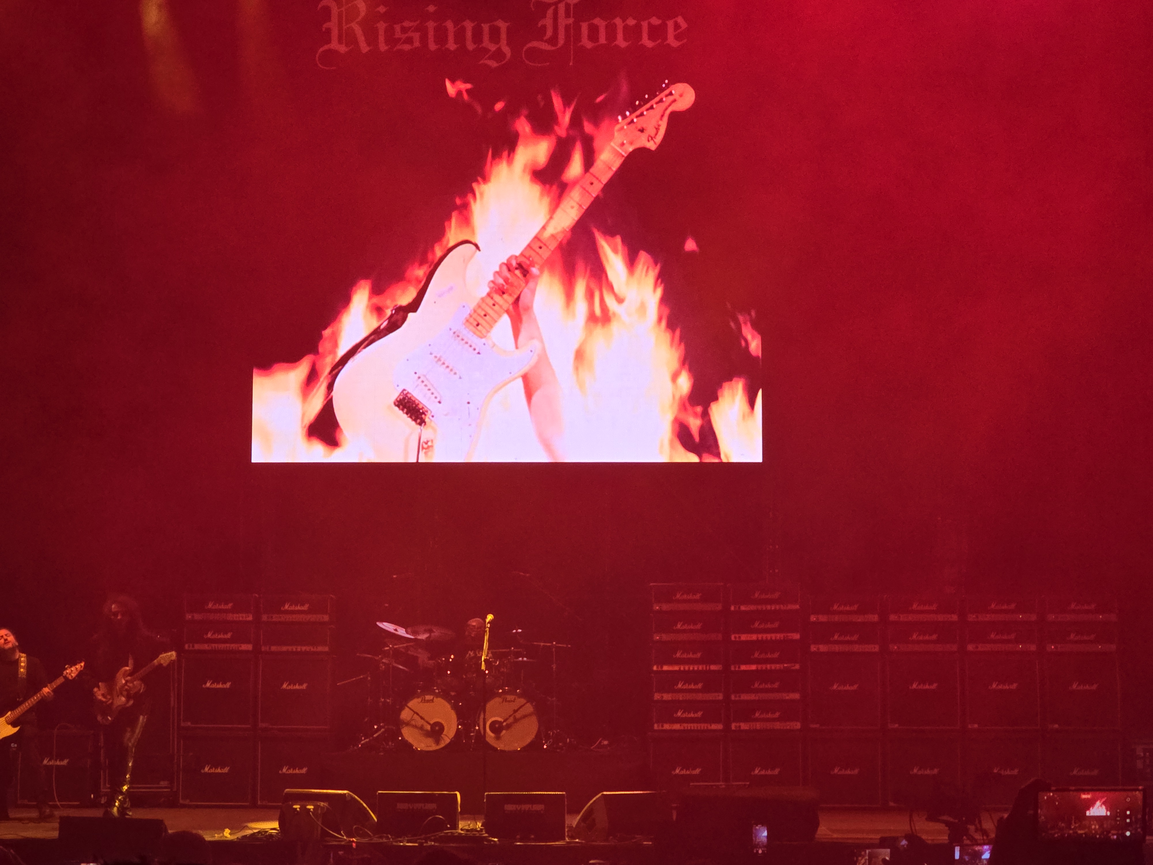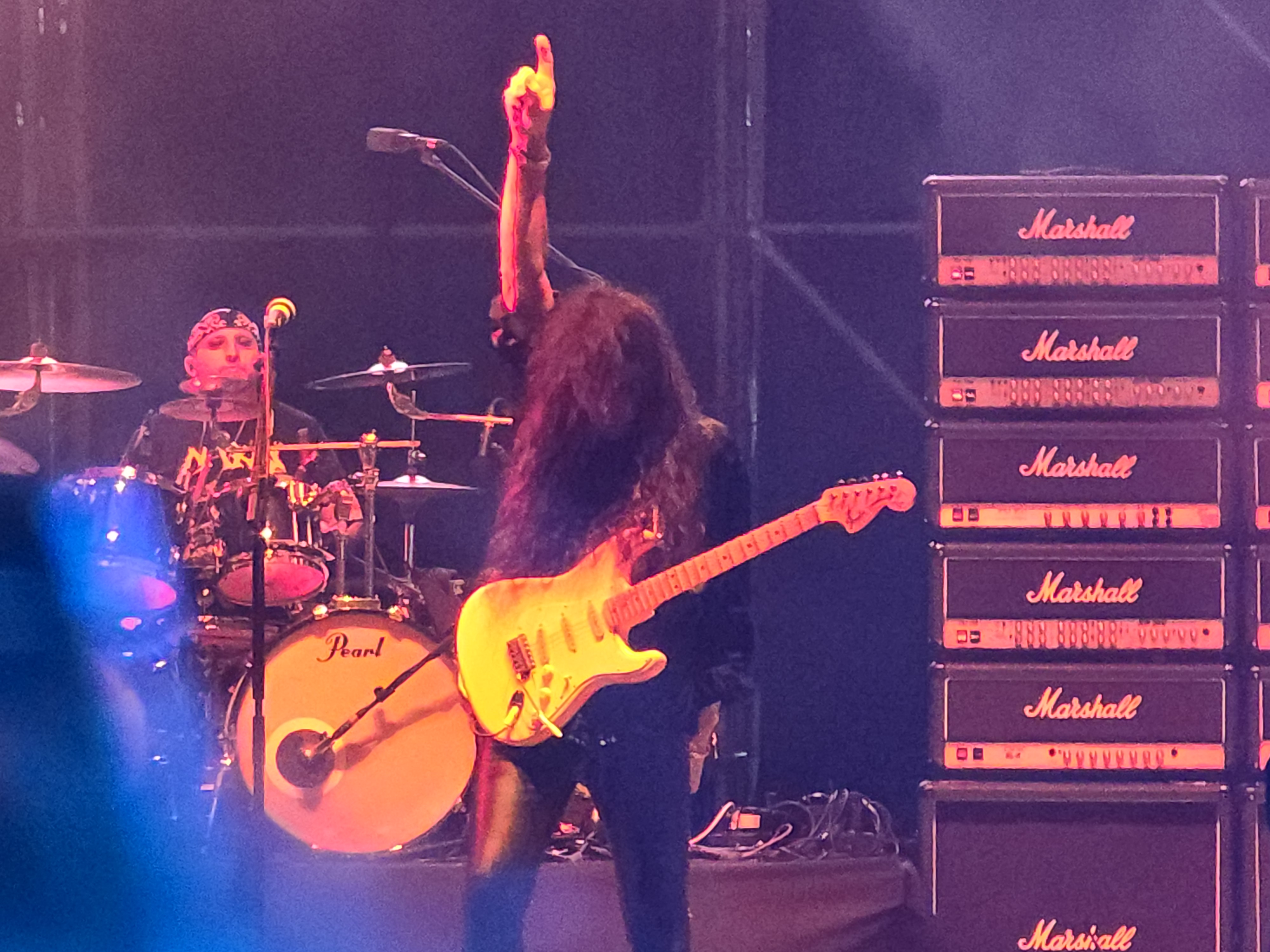 Und nun wurde es Zeit für den Meister. Und YNGWIE MALMSTEEN tut das, was YNGWIE MALMSTEEN nun mal tut und das reichlich: Er spielt sehr schnell sehr viele Noten, wirft oft Plektren (diese allerdings eher auf seine Mitmusiker und selten ins Publikum) und tausch noch öfter seine weiße Stratocaster gegen eine andere weiße Stratocaster. Meine Begleitung machte mich darauf aufmerksam, dass ein Gitarrenwechsel, einen Songwechsel ankündigt. Nicht falsch verstehen: Yngwies Gitarrenspiel ist nach wie vor beeindruckend und nicht von dieser Welt. Schnell, virtuos, einzigartig. Dennoch hätte ich mir zwischen den Soli einfach mehr echte Songs gewünscht, denn die gibt es in der Vita des Meisters zuhauf. So gleicht das ganze eher einem klassischen Orchesterstück mit E-Gitarre und weniger einem Rockkonzert. Ich bin trotzdem froh ihn mal in voller Pracht erlebt zu haben.