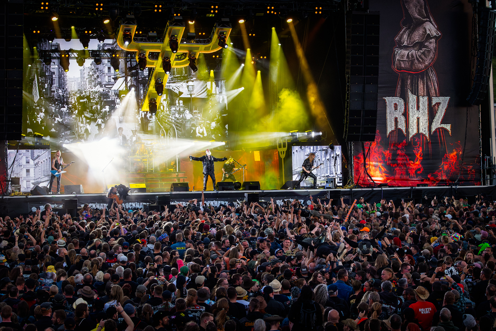 Die Legende ruft – und alle kommen! Auf JUDAS PRIEST können sich alle Anwesenden einigen und auf dem gesamten Gelände wartet die Menge auf den Metal God! „War Pigs“ von BLACK SABBATH lässt eine Gänsehaut entstehen und nach dem Intro beginnt die musikalische Reise mit„Panic Attack“ aus dem aktuellen Album. Nach „You´ve Got Another Thing Comin´“ ist klar, dass PRIEST einen denkwürdigen Abend vorbereitet haben und mit „Rapid Fire“ und „Breaking The Law“ bekommt das Publikum genau die Dosis Heavy Metal, die sie verdient. Die riesige Videoleinwand verstärkt visuell das Erlebnis, wobei der Blickfang natürlich Rob Halford ist, der die Bühne für sich einnimmt und regelmäßig mit den begeisterten Fans kommuniziert. Der Meister erreicht ungeahnte Tonhöhen und sogar der extrem anspruchsvolle „Painkiller“ kommt ohne stimmliche Schwächen aus den Boxen. Ob hier nachgeholfen wurde oder ob Rob wirklich gut bei Stimme ist, kann ich nicht beurteilen, aber im Endeffekt ist dies auch egal, da sensationell angeliefert wurde. Nach einer Stunde verlässt die Band die Bühne, um mit „Hellion/Electric Eye“ auf die Bühne zurückzukehren und der Menge das zu geben, was sie verlangt. Natürlich lässt sich Halford nicht lumpen und Motorengeräusche kündigen den Auftritt der obligatorischen Harley an, die auf der Bühne geparkt wird. „Hell Bent For Leather“ und „Living After Midnight“ beenden den großartigen Auftritt und die letzten Worte sind hoffentlich ein Versprechen: „We are fucking JUDAS PRIEST – we will be back“!!!