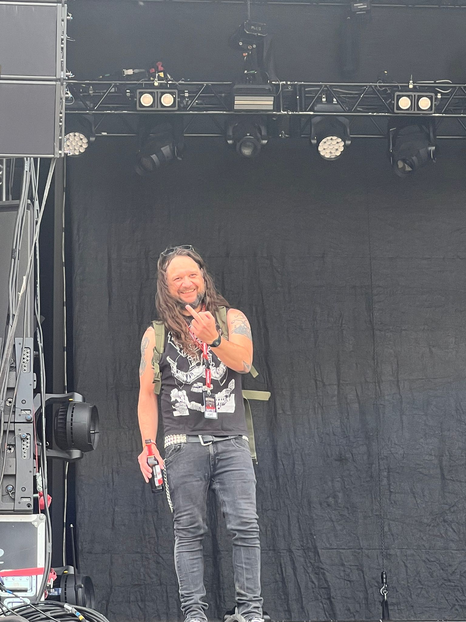 Der Festivalsamstag war eine spannende Erfahrung und organisatorisch eine Kraftprobe für die Veranstalter. Der Grund dafür war das unsichere Wetter und viele Zuschauer kontrollierten regelmäßig ihre Wetterapp, um den bevorstehenden Wetterumschwung einschätzen zu können. Bis um halb Vier spielte der Wettergott mit, aber dann wurde von den Veranstaltern gebeten, das Infield zügig zu verlassen, da eine Unwetterwarnung ausgegeben wurde. Eine völlig richtige Entscheidung, das Wohl der Zuschauer und Bands abzusichern! Die Evakuierung verlief problemlos und auf dem Campinglatz wurden freundschaftlich freie Sitzplätze in den Autos geteilt, um das Unwetter gemeinsam durchzustehen. Zum Glück regnete und blitze es zwar ordentlich, aber das befürchtete Chaos blieb aus. An dieser Stelle und großes Lob an die Veranstalter und das Publikum – es gab seitens des Publikums keine Beschwerden, die Kommunikation über die bereitgestellten Kanäle lief problemlos und die Sicherheit war zu keinem Zeitpunkt gefährdet.