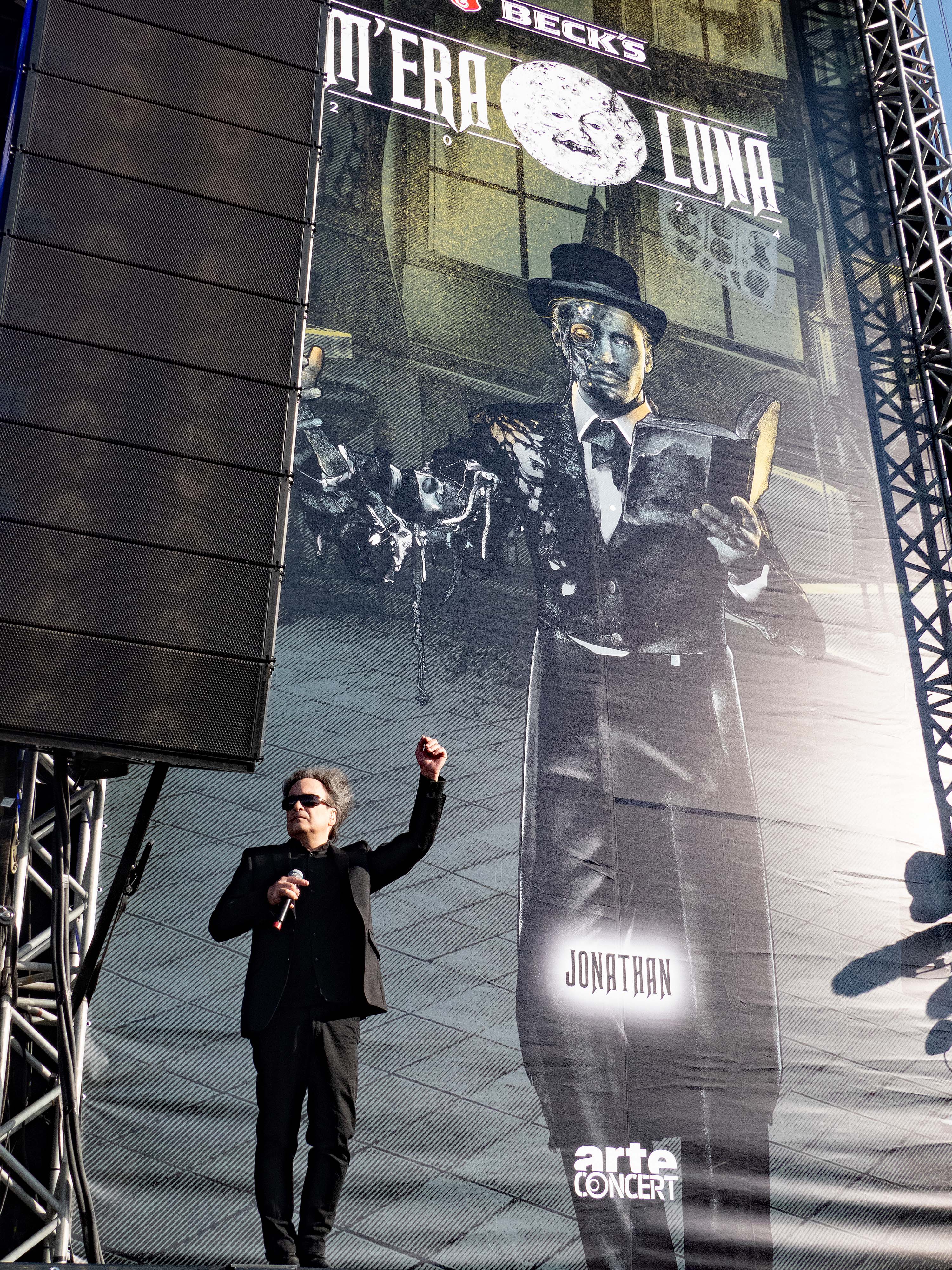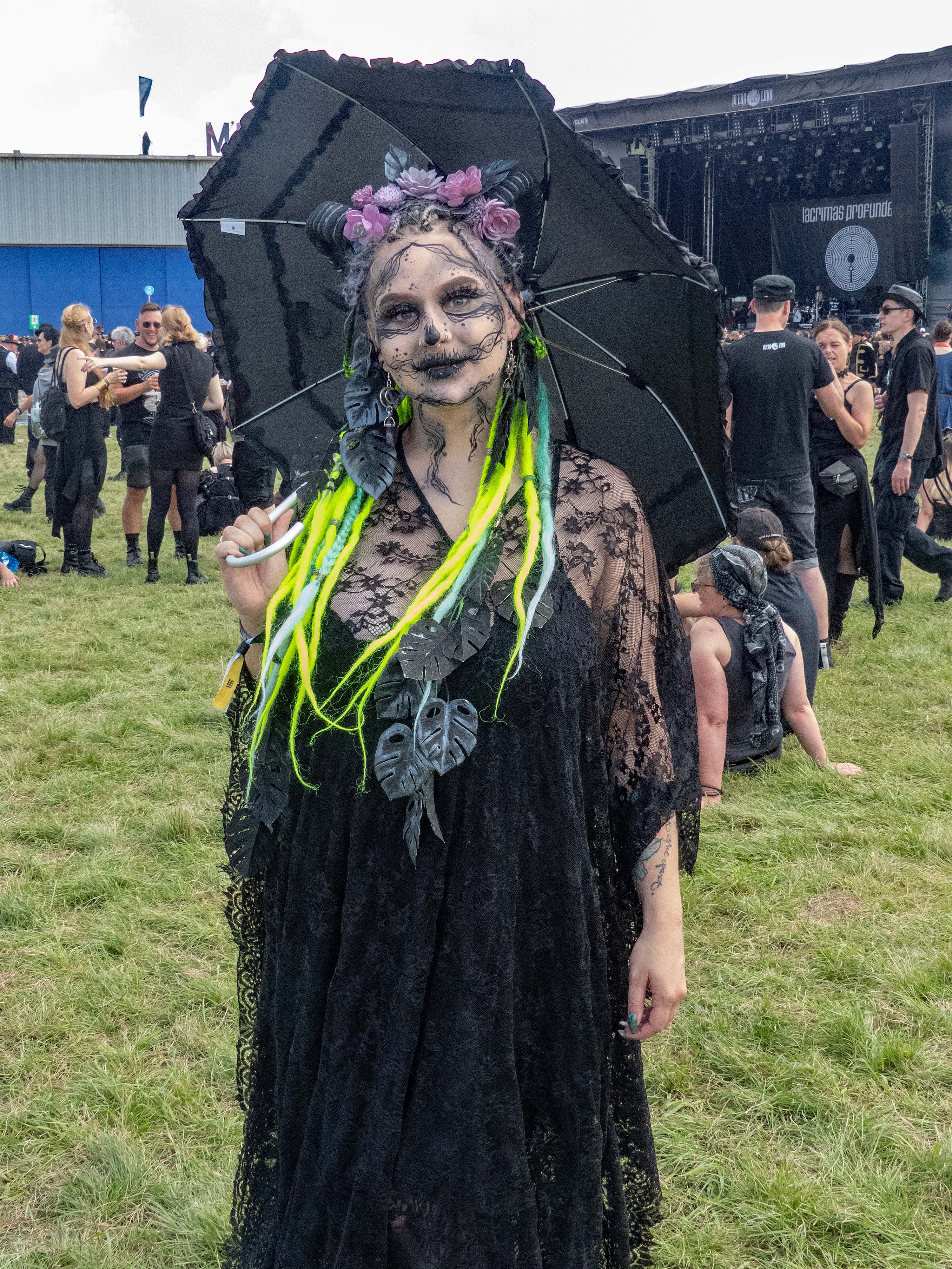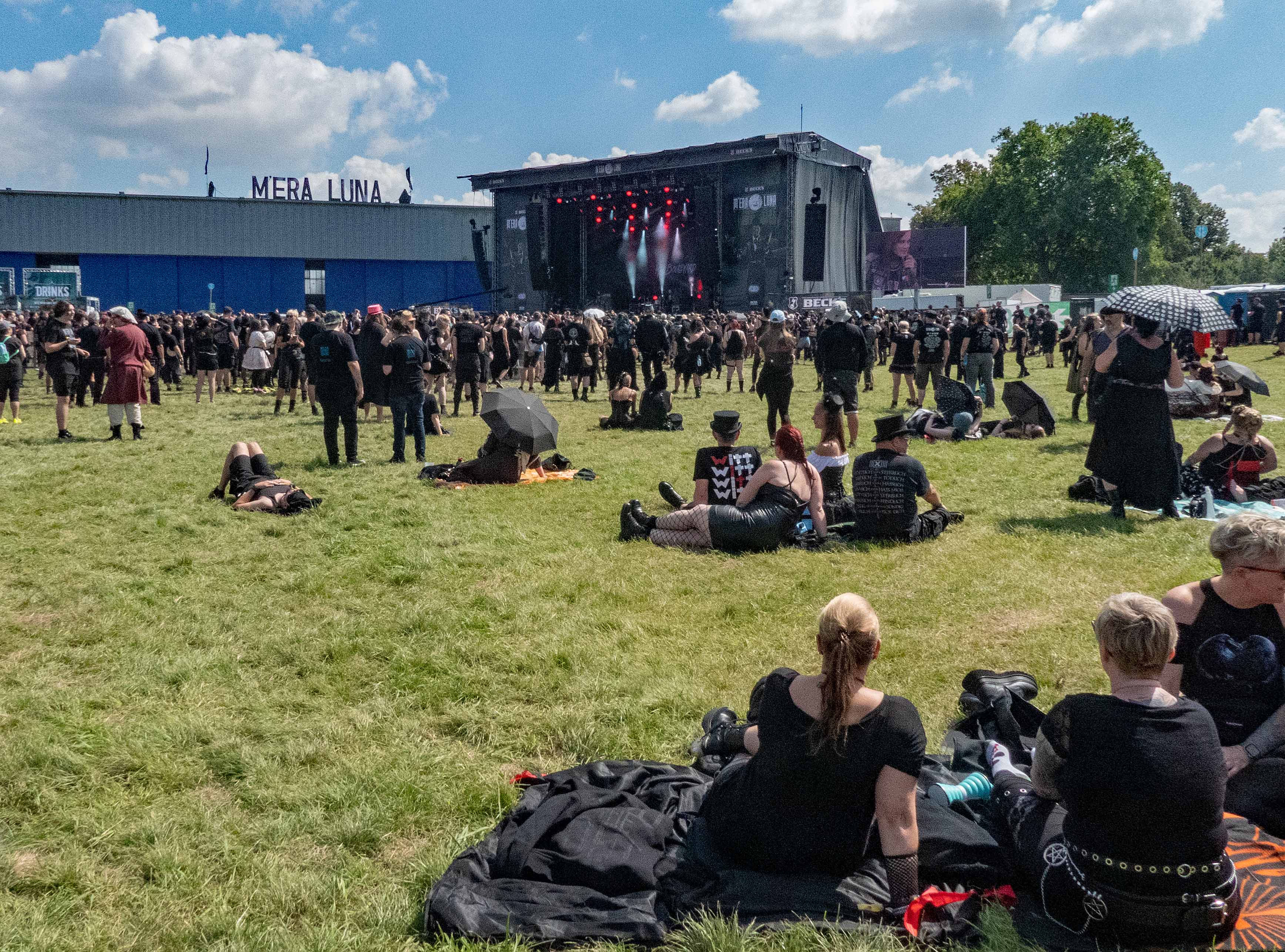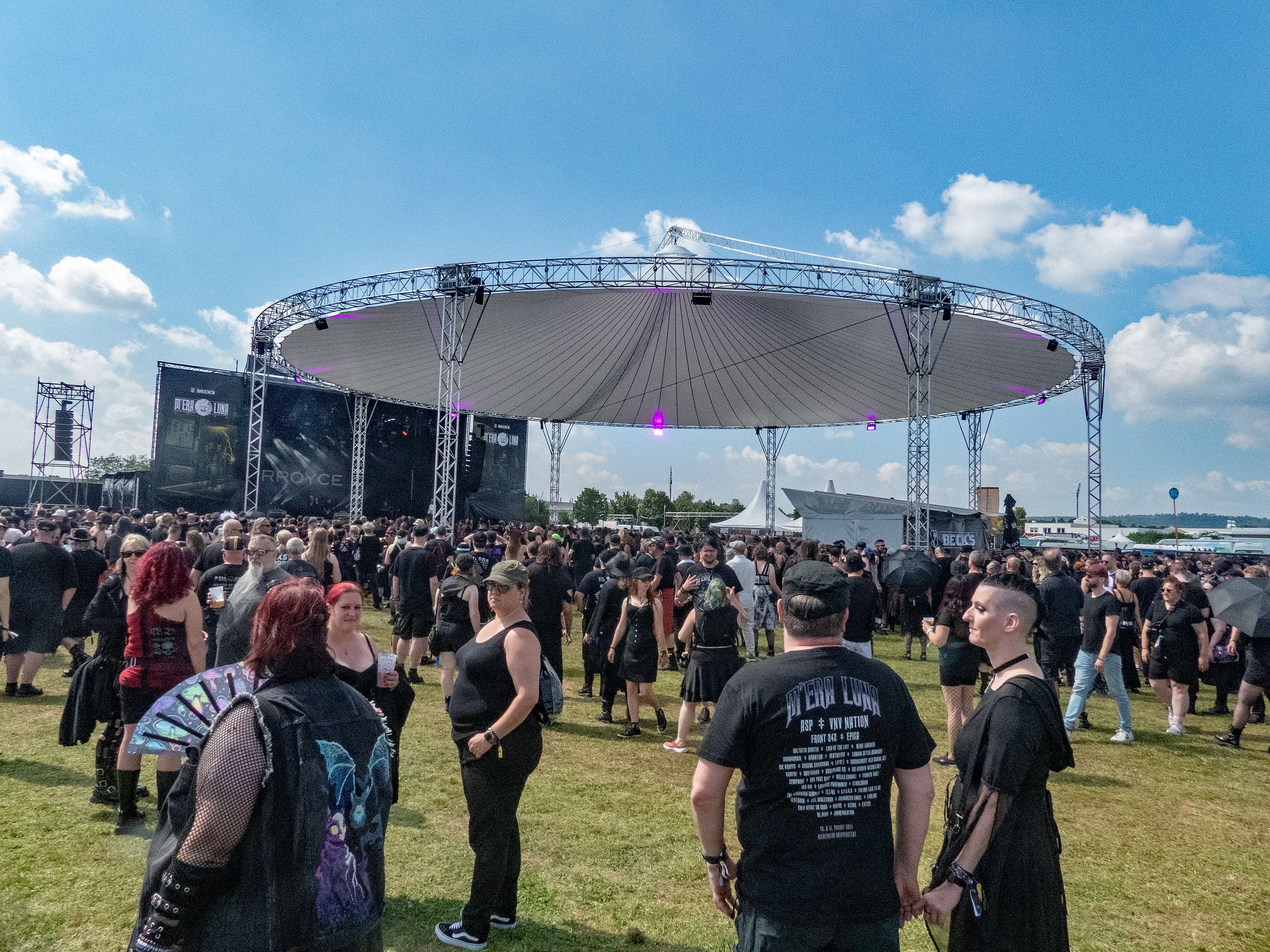 Pünktlich zum offiziellen Beginn am Samstag war das Regengebiet endgültig abgezogen und über dem Hildesheimer Flugplatz lachte die Sonne – so wie sich das gehörte. Denn auch wenn es fast schon ein wenig ironisch anmutet: das M'era Luna, Gipfeltreffen der musikalischen Nachtschattengewächse, darf sich traditionell über relativ gutes bis sehr gutes Wetter freuen. Während man als Festivalgänger andernorts nur gar zu oft im Schlamm versinkt, lacht hier, von wenigen die Regel bestätigenden Ausnahmen abgesehen, regelmäßig die Sonne vom Himmel und droht, manch mühsam kultivierte noble Blässe in feuriges Rot zu verwandeln. Um 11 Uhr ging es offiziell mit dem Bühnenprogramm los und RE.MIND eröffneten auf der Main Stage das Festival. Bei HELL BOULEVARD schwächelte zunächst der Sound etwas, so dass der Gesang eher unterging, doch nachdem gegengesteuert wurde, kam der restliche Auftritt der Dark Rocker mit Songs wie „Dead Valentine“ und „Zera Fucks Given“ dann auch mit sattem Gesamtklang aus den Boxen. Danach hieß es für Freunde des Gothic-Rock /- Metal auch direkt dableiben, da es im Anschluss gleich mit LACRIMAS PROFUNDERE weiterging. Deren Sänger gab alles und erwies sich als wahre Rampensau, die mit schier unerschöpflicher Energie von einem Ende der Bühne zum anderen sprintete und auch nach vorne auf die Boxen kletterte, um die Nähe zum Publikum zu suchen, was dieses mit reichlich Applaus quittierte.