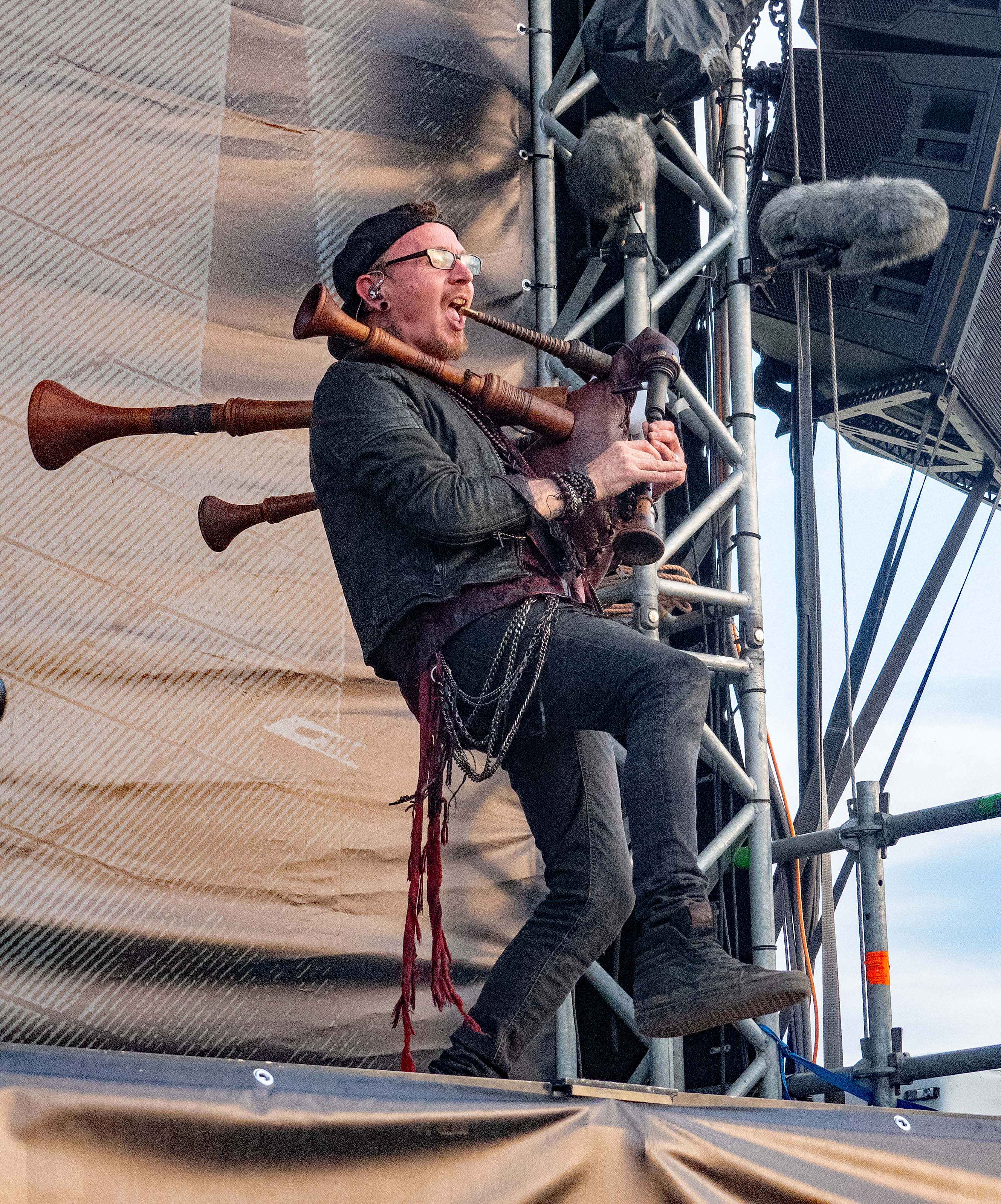 Während auf der Club Stage SHE PAST AWAY noch am musikalischen Vermächtnis von THE CURE feilten, gab sich auf der Main Stage ein waschechtes Szeneurgestein die Ehre: DEINE LAKAIEN spielten auf und präsentierten in getragenen Klängen altes und weniger altes Material von „Dark Star“ bis „Ulysses“. Wem das zu ruhig war, der kam hinterher bei SALTATIO MORTIS auf seine Kosten: the artists formerly known as Mittelalter-Rockband haben mittlerweile auch optisch jeden Hinweis auf ihr einstiges musikalisches Revier restlos getilgt: mit auf modern getrimmtem, schnörkellosem Schriftzug und vergleichsweise schlichten schwarzen Klamotten statt Gewandung wurde auch optisch unterstrichen, dass der Mittelalter-Rock endgültig Geschichte ist, was dem Set dann auch anzuhören war. Nicht einmal der alte Überhit "Prometheus" hatte es noch ins Set geschafft, einzig der "Spielmannsschwur" war noch übrig, wirkte aber ohne passende Spielleute und entsprechendes Drumherum nur noch wie ein blasser Abklatsch seiner selbst. Stattdessen trat man das Gaspedal voll durch und setzte auf hardrockige bis Metal-lastigere neue Songs wie „Finsterwacht“ und „We Might Be Giants“, bei denen der Dudelsack gefühlt nur noch als der Gewohnheit geschuldetes, sporadisch schmückendes Beiwerk fungierte. Der größere Teil des Publikums schien sich um die neue Ausrichtung nicht groß zu scheren und feierte die Band gewaltig- mangelnden Einsatz konnte man ihr auch wirklich nicht attestieren: Sänger Alea ließ sich selbst durch aus einer mutmaßlichen Platzwunde an der Schläfe rinnendes Blut nicht aus dem Konzept bringen, sondern zog sein Ding ohne Unterbrechung durch.