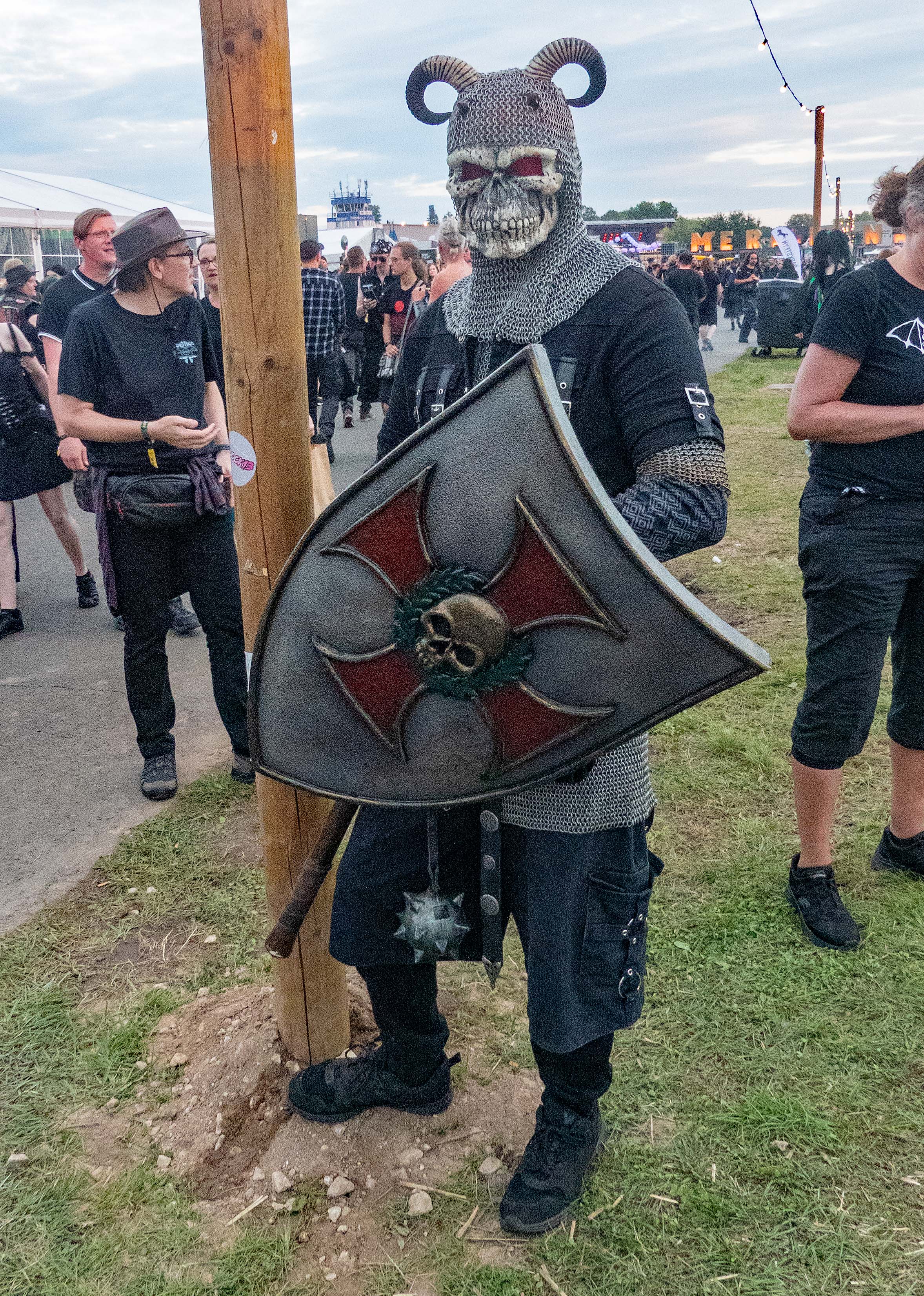 Es ist August, es ist Sommer, der Regen zieht ab- was fehlt da noch? Das M'era Luna natürlich! Und warum geht man da hin? Na, zum Festival-Merch-Kaufen! Diesen Eindruck konnte jedenfalls gewinnen, wer am Freitagabend, also eigentlich noch vor dem offiziellen Festivalbeginn, einen ersten Bummel über das Gelände unternahm. Der Campingplatz platzte schon nachmittags aus allen Nähten, die Zelte dicht an dicht gepackt wie Sardinen in der Dose, und wer es geschafft hatte, sich einen Platz und damit eine Bleibe für die Nacht zu sichern, der kannte offenbar nur ein Ziel: den offiziellen M'era Luna-Merch-Stand. Dabei sein ist eben doch nicht alles, man muss es hinterher ja auch zeigen können und will ein Souvenir haben - Zeit, sich zwischen den feilgebotenen Waren zu entscheiden gab es bei über einer Stunde Wartezeit in der Schlange jedenfalls reichlich. Wer weniger an Textil und mehr an Kulinarik interessiert war, konnte sich derweil auf dem Mittelaltermarkt und dem am späten Nachmittag eröffneten Festivalgelände den Magen mit einer Vielzahl verschiedener Speisen aus aller Herren Länder vollschlagen. Und um 17:30 fiel mit dem Tanz auf dem Markt ja auch der Startschuss für das Rahmenprogramm. Wer es weniger bewegungsintensiv bevorzugte, konnte sich ab 18:30h entspannt dem Crypt Talk mit Chris Harms oder den anschließenden Lesungen widmen, Feierwütige zog es die Nacht über in den Disco-Hangar oder auch an die Feuer und Schänken des Mittelaltermarktes. Kurzum: die Stimmung war schon vor dem eigentlichen Beginn am Samstag prächtig. Da taten auch gelegentliche leichte Schauer der Sache keinen Abbruch.