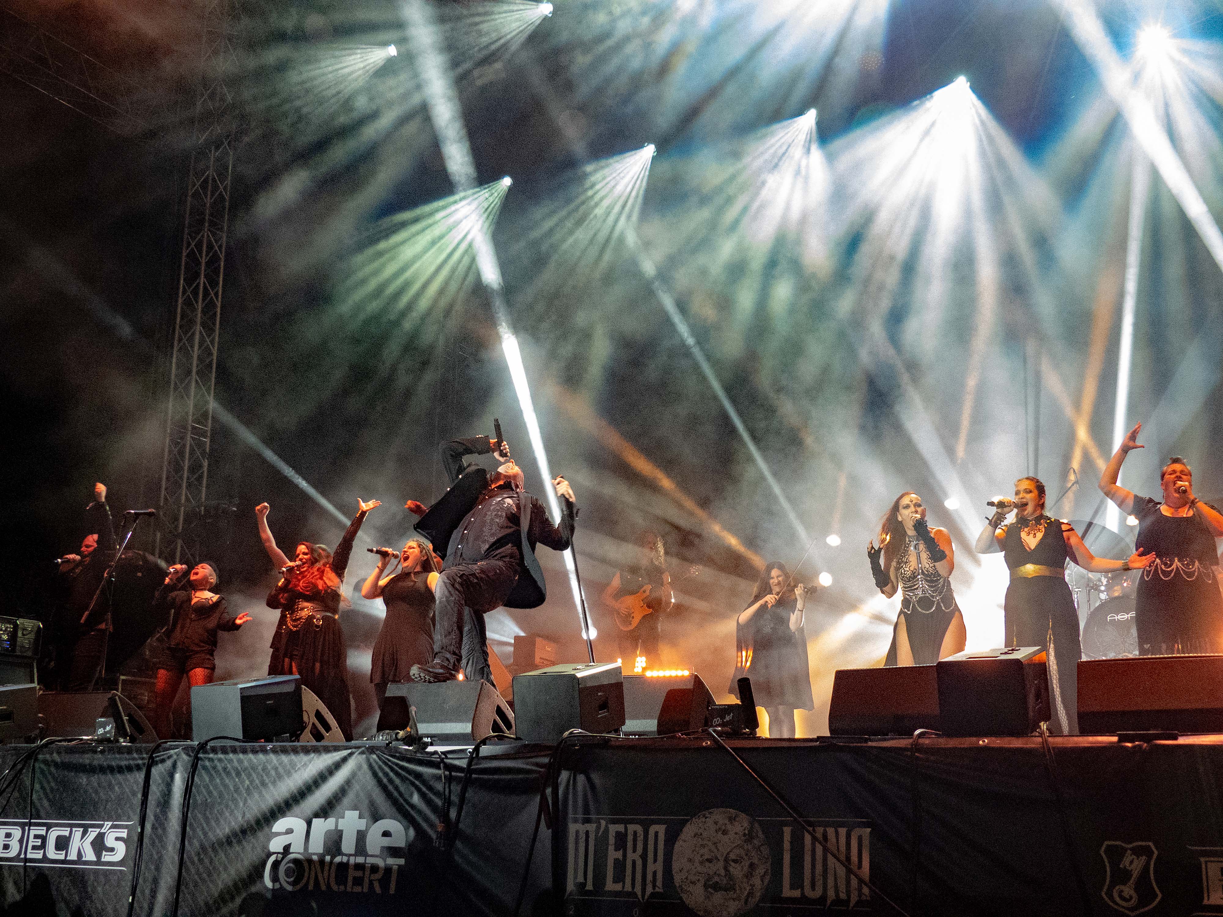 Freunde elektronischerer Klänge vergnügten sich unterdessen an den Club Stage bei SUICIDE COMMANDO, bevor mit dem Auftritt von FRONT 242 auf der Main Stage ein großer Abschied bevorstand: das Szene-Urgestein beendet dieses Jahr seine mehrere Jahrzehnte währende Live-Karriere. Bevor es aber soweit ist, wurde mit dem M´era Luna-Publikum zu den Klängen von „Body To Body“ und „Punish Your Machine“ noch einmal ordentlich gefeiert. Der anschließende Auftritt von LONDON AFTER MIDNIGHT startete leider mit einer Viertelstunde Verspätung, was den einen oder anderen in Zeitnot brachte, da so kaum noch Zeit bis zum Konzert von ASP, Headliner des Abends, blieb, die man schließlich auch nicht verpassen wollte. Die wiederum legten pünktlich los und zogen das Publikum mit stimmungsvollem Licht, Pyrotechnik und Hits wie „Werben“, „Krabat“, "Ungeschickte Liebesbriefe", "Schwarzes Blut" und "Ich Will Brennen" in ihren Bann, wobei sie sich sympathischerweise auch selbst auf die Schippe nahmen, wie vor „Schwarzes Blut“: „ Zu diesem Lied haben wir auch mal ein Video gedreht. Das sollte gruselig werden, so ein richtiges Horrorvideo. Im Endeffekt war aber das Einzige, bei dem es die Leute wirklich gegruselt hat, die Tatsache, dass ich dabei eine blaue Jeans anhatte…Dabei ist es doch egal, was wir anhaben, denn ich weiß genau: ihr habt … schwarzes Blut!“ Zum Ende hin legte man in Punkto Bombast noch eine Schippe drauf und holte sich für „Sing Child“ und „Raise Some Hell Now“ stimmliche Verstärkung in Form des Chors "Stimmgewalt" - ein würdig epischer Abschluss für einen gelungenen ersten Festival-Tag. Wer danach noch nicht genug hatte, für den konnte es aber auch noch weiter gehen: wahlweise im Disco Hangar oder auf dem Mittelaltermarkt boten sich genug Möglichkeiten, die Nacht komplett zum Tage zu machen.