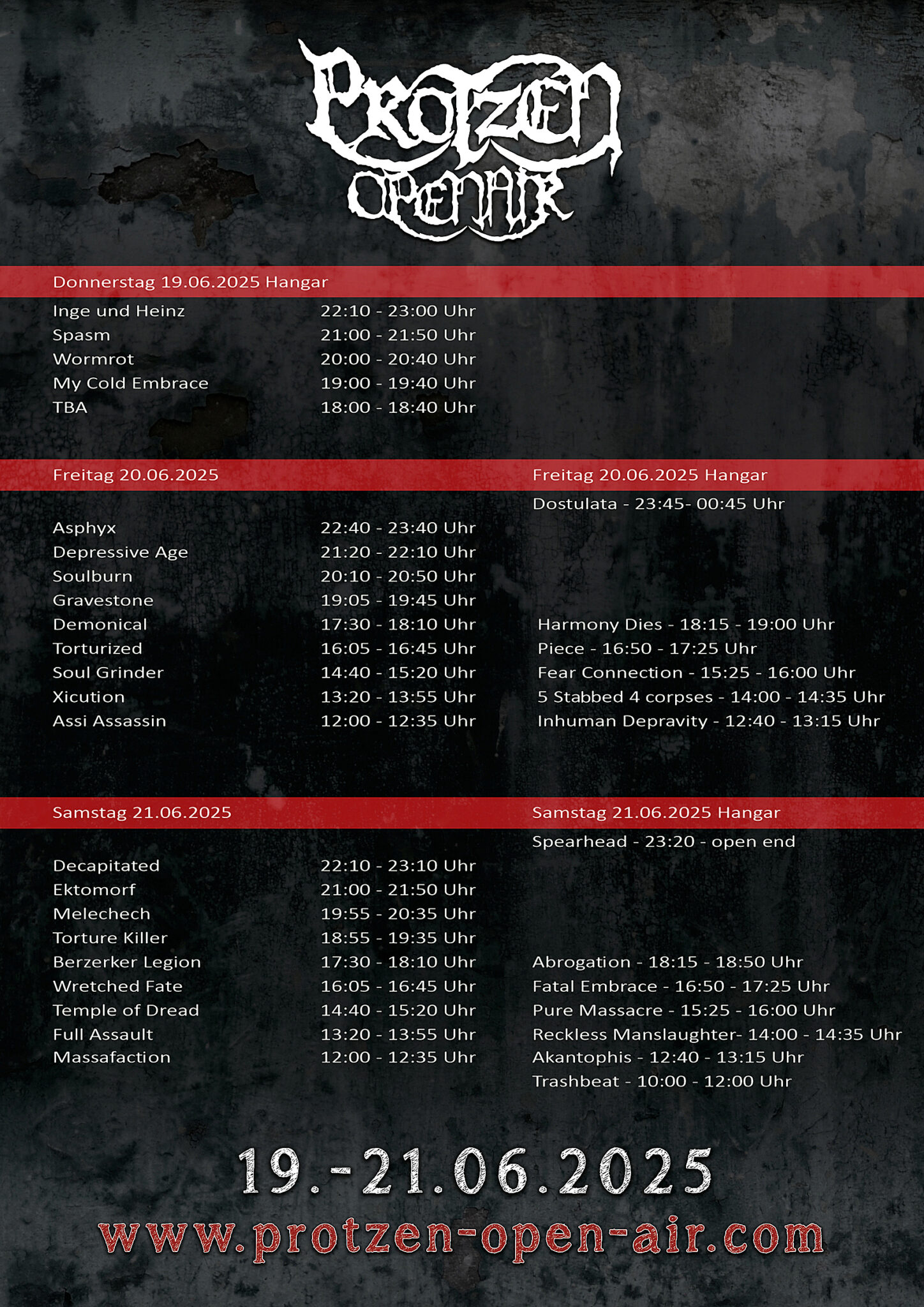 Hallo Prignitz! Moinsen Brandenburg! Wo gern die Störche ihr Quartier aufschlagen, kommen auch 2025 wieder viele Verrückte in die Gemeinde Fehrbellin am Nordrand des Rhinluches, südlich der Ruppiner Platte. Der Grund liegt auf der Hand: Andrea, Mario und das ganze „POA“-Team laden zum „Protzen Open Air 2025“. Neben einem Haufen lustiger Gäste im Publikum haben sich auch wieder echte Death-Metal-Experten an den Instrumenten angesagt. Es gibt natürlich nicht nur Death, auch Grindcore und technischen Death Metal und als und so. Und die wiederbelebte DDR-Legende DEPRESSIVE AGE. Und DOSTULATA, eine Art Coverband der guten, alten Zeit von DIE APOKALYPTISCHEN REITER mit dem Peitscheschwingenden Dr. Pest und dem verrückten Original-Drummer und Därmefresser Skeletton. Und die Super-Mario-Lieblinge EKTOMORF. Und Szene-Legenden wie das Schulmännchen von DEMONICAL oder "uns Martin", diesmal mit ASPHYX. Die Grindcore-Combo WORMROT kommt auf der „Scums“-Tour erstmalig seit zwölf Jahren in der Originalbesetzung mit Schlagzeuger Fitri nach Protzen. Und die Kasseler Death Metal-Band MY COLD EMBRACE präsentiert erstmals seit 2018 wieder Musik, spielt mit neuem Sänger Sasche die Single „Seppuku“ sicherlich live. Das 3-Tages-Ticket kostet keine 100 Euro, Tageskarten gibt es ausschließlich an der Abendkasse, die sich in der Mühlenbergstraße 1 in16833 Protzen befindet.