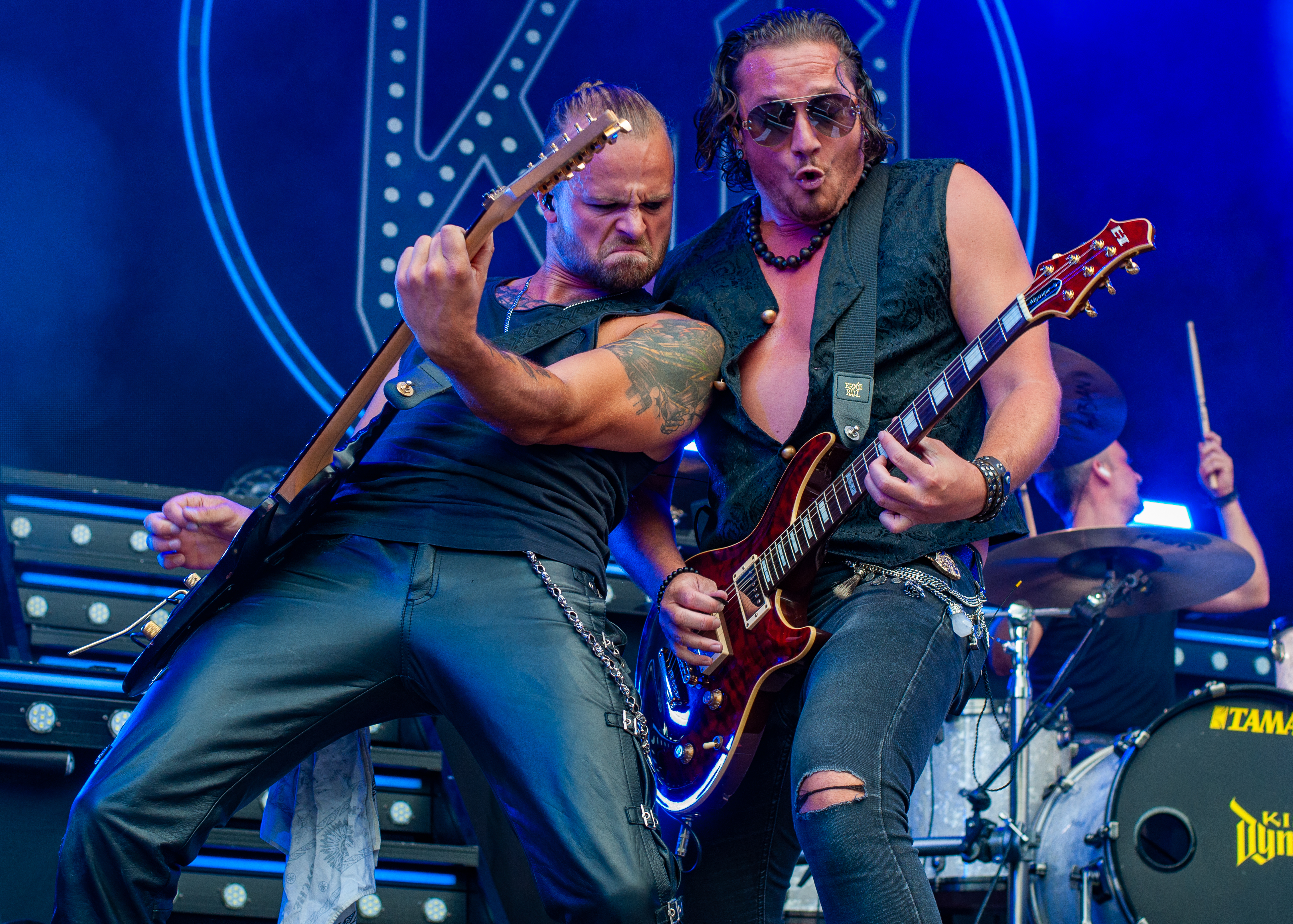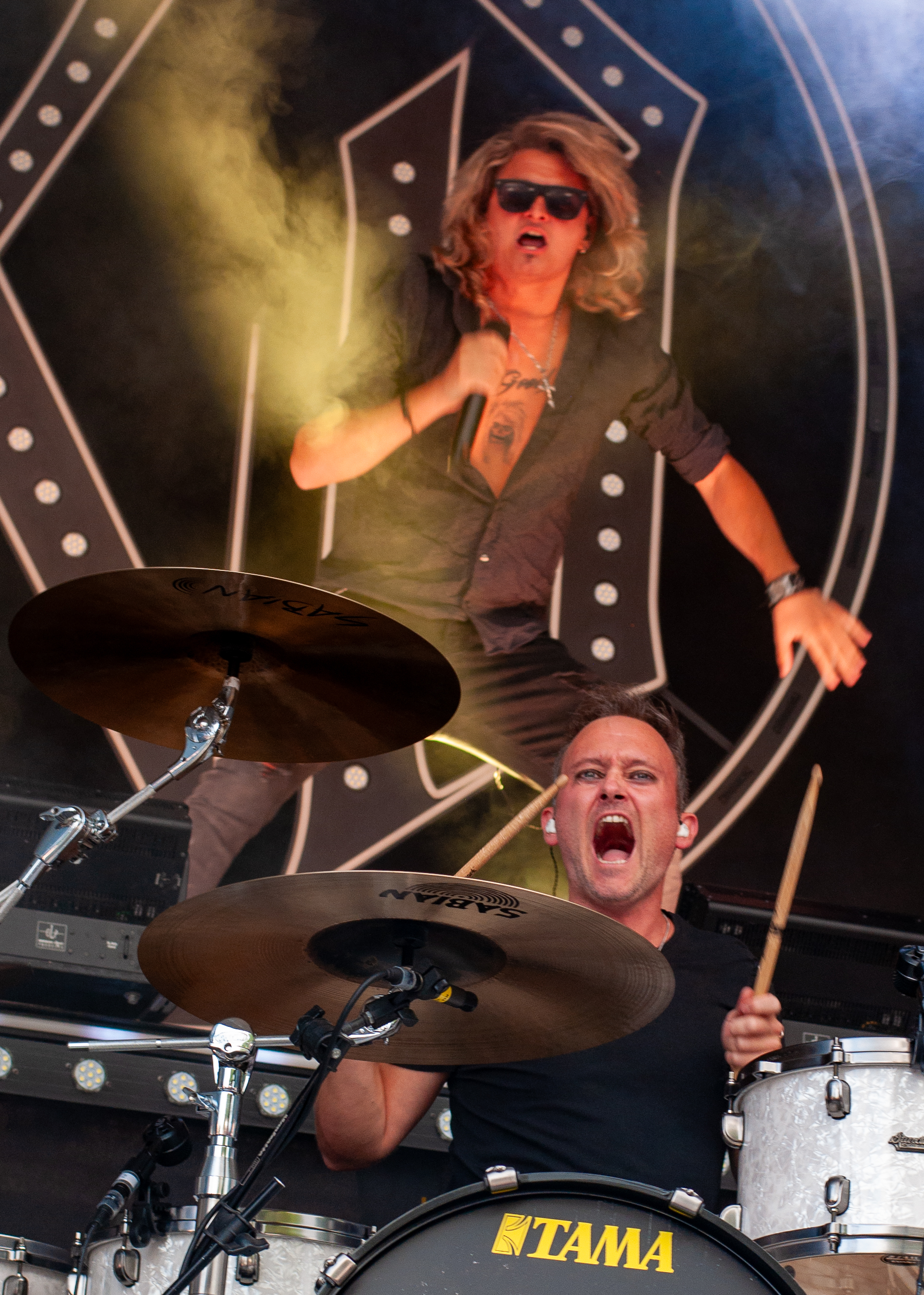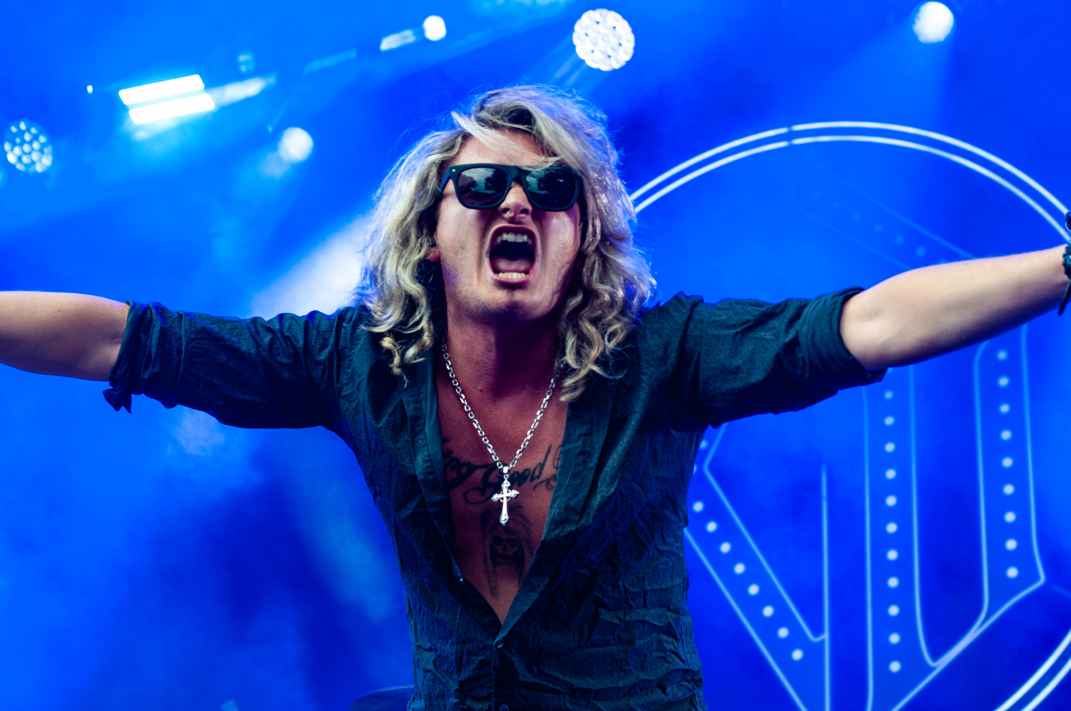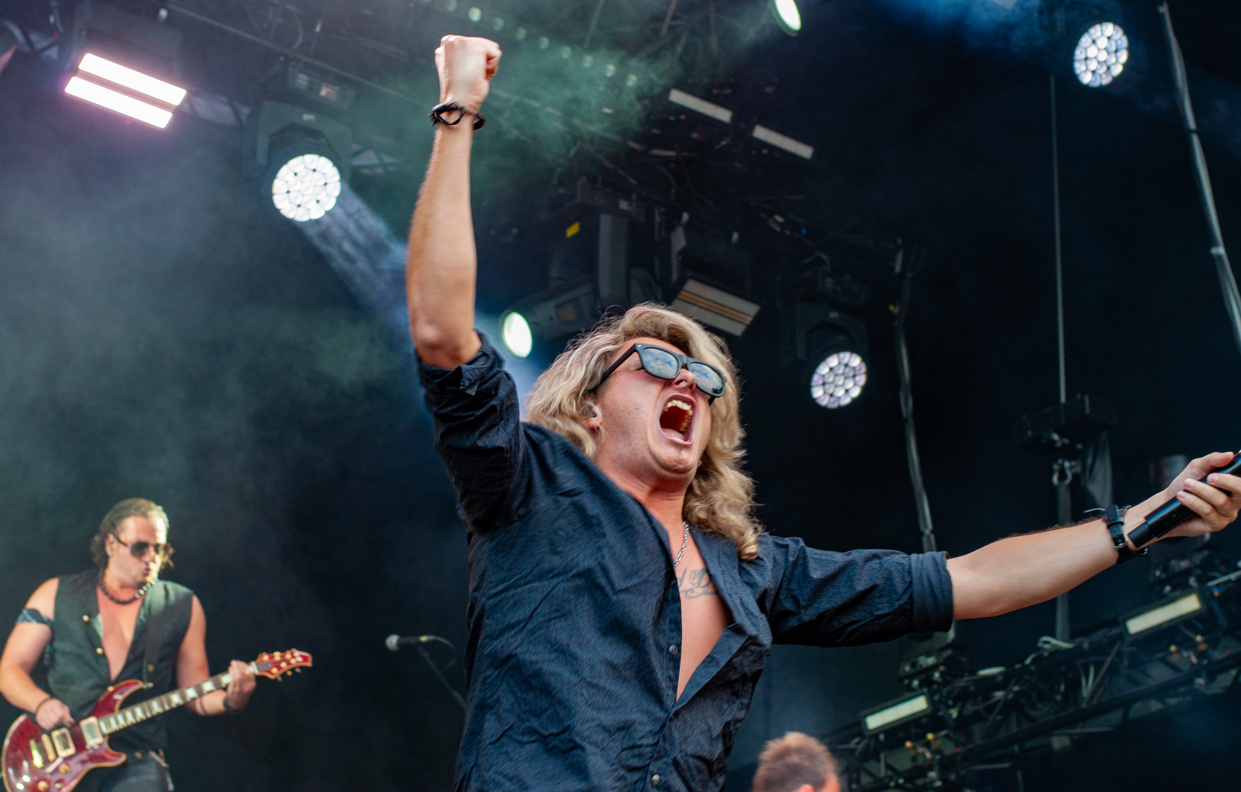 Der Abend bricht an und weiteres Festival-Highlight kündigt sich an: KISSIN’ DYNAMITE. Die Schwaben fahren mächtig auf, die Bühne wird mit beleuchteten Treppenstufen und dem glitzernden Bandemblem bestückt und gleich zu Beginn gibt es Konfetti-Regen: Breitbeiniger Glam Metal mit Stadionrock- und 80er-Jahre-Attitüde. Das Publikum feiert die Songs und die Truppe um die Brüder Hannes und Ande Braun sind gut aufgelegt. KISSIN`DYNAMITE karikieren den Glamrock nicht nur, sie nehmen ihn auch ernst. Voller Party-Pathos und schillernder Power werden „I've Got the Fire“, „The Devil Is a Woman“ und der 2012er Hit “Six Feet Under” dargeboten. Zu "You're Not Alone" lässt sich Sänger Hannes, der die blonden Haare in schönster Welle geföhnt hat, im Schlauchboot über die Köpfe der Zuschauer treiben. Im Fotograben macht das Ablichten dieser Kapelle besonderen Spaß: Es wird gepost was das Zeug hält. Mit eindringlicher Vitalität entern die DONOTS mit „Auf sie mit Gebrüll“ die Bühne. Und den Titel nimmt die Punkband wörtlich: explosiv mit großer Energie und Leidenschaft spielen sie auf. Ingo Knollmann und Co sorgen mit Gassenhauern wie “Stop the Clocks“ und „Calling“ für so manch einen wüsten Circle Pit. Das Moshpit wirbelt ordentlich Staub auf. Guido Knollmann schrammelt wild auf seine Gitarre ein. Das Publikum grölt “Whatever Happened to the 80s” so laut, dass sich der Wolf im Wald sicherlich am lecker Rothirsch verschluckt. Nach “We´re Not Gonna Take It” und “So long” ist Schicht im Schacht. Sänger Ingo ist hoch des Lobes für das Festival und den gemeinnützigen Verein, der es organisiert. Dem möchte ich mich gerne anschließen: Chapeau! Den Rausschmeißer machen die FIVE FINGER SKULL CRUSHERS, die FIVE FINGER DEATH PUNCH-Coverband aus Italien. Ein tolltes Festivalwochenende endet mit hart groovenden Gitarrenriffs.