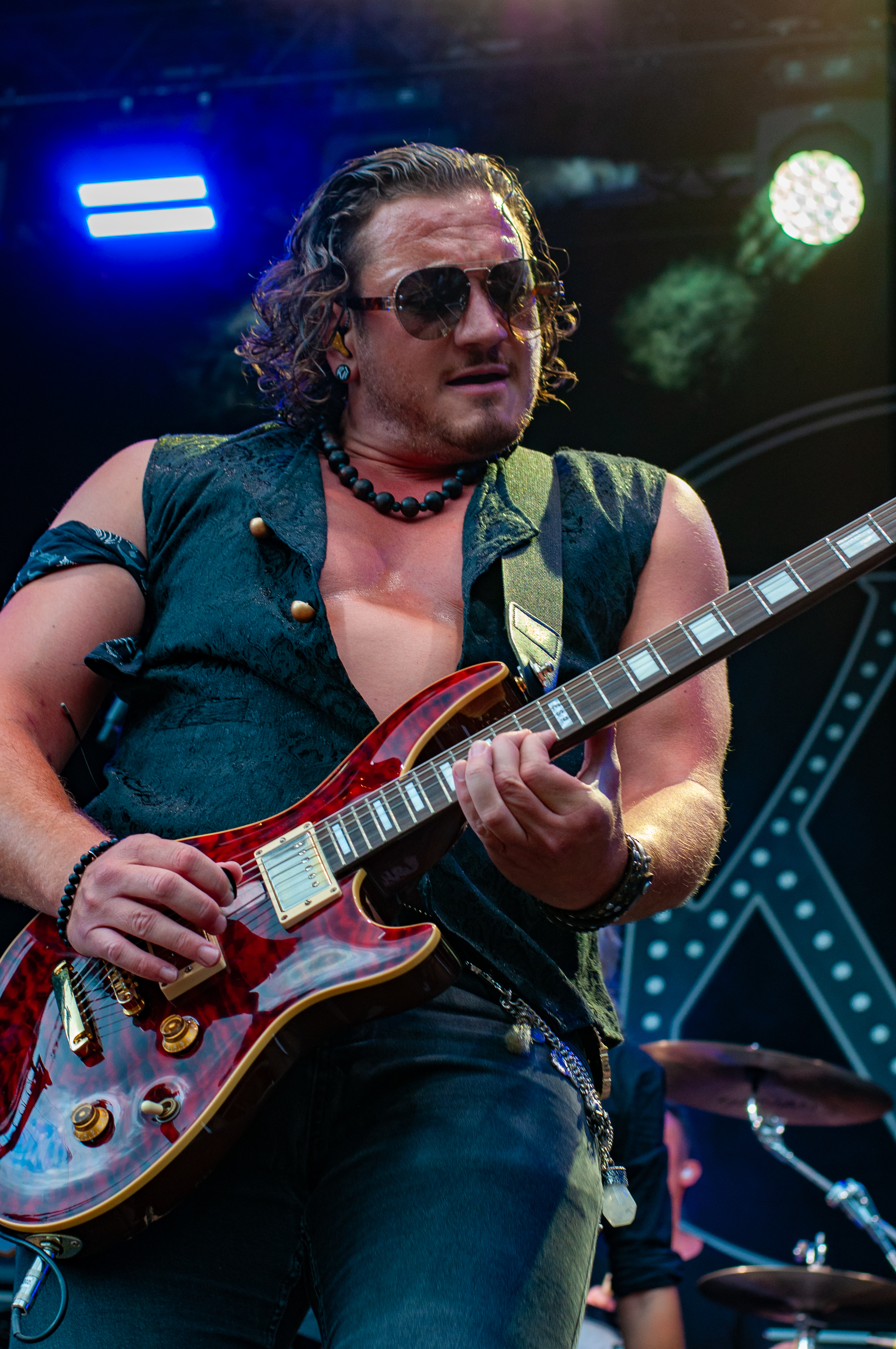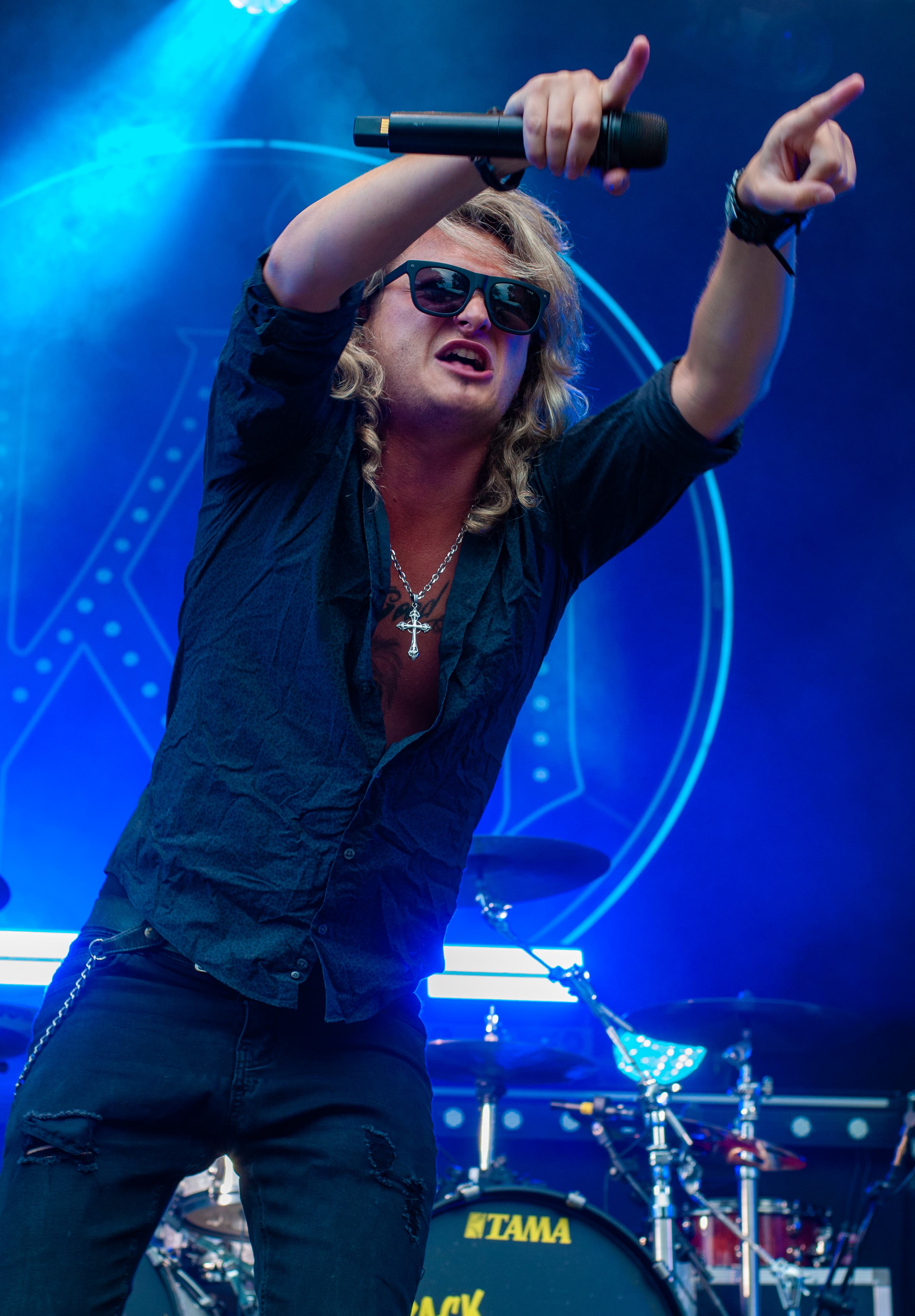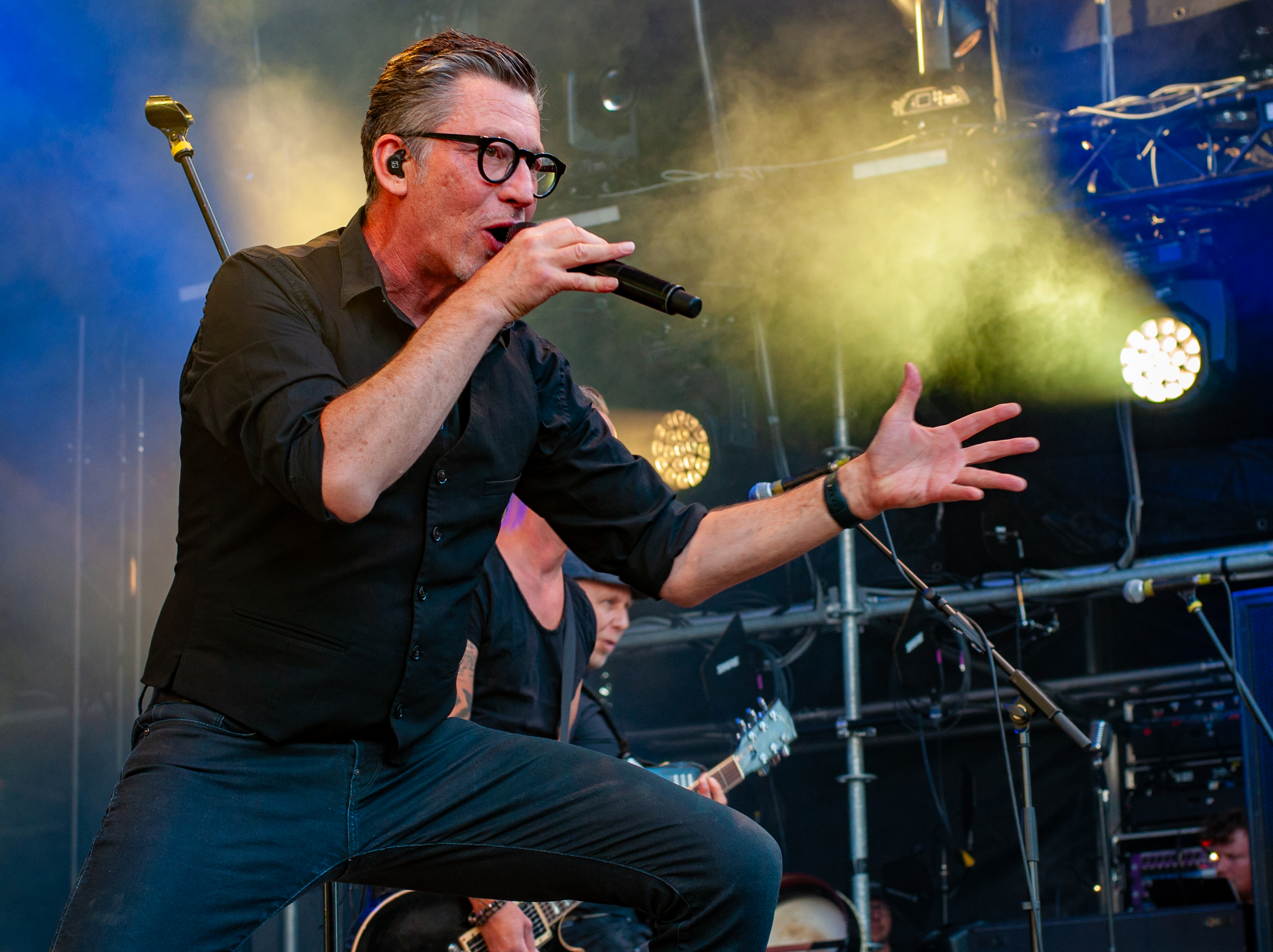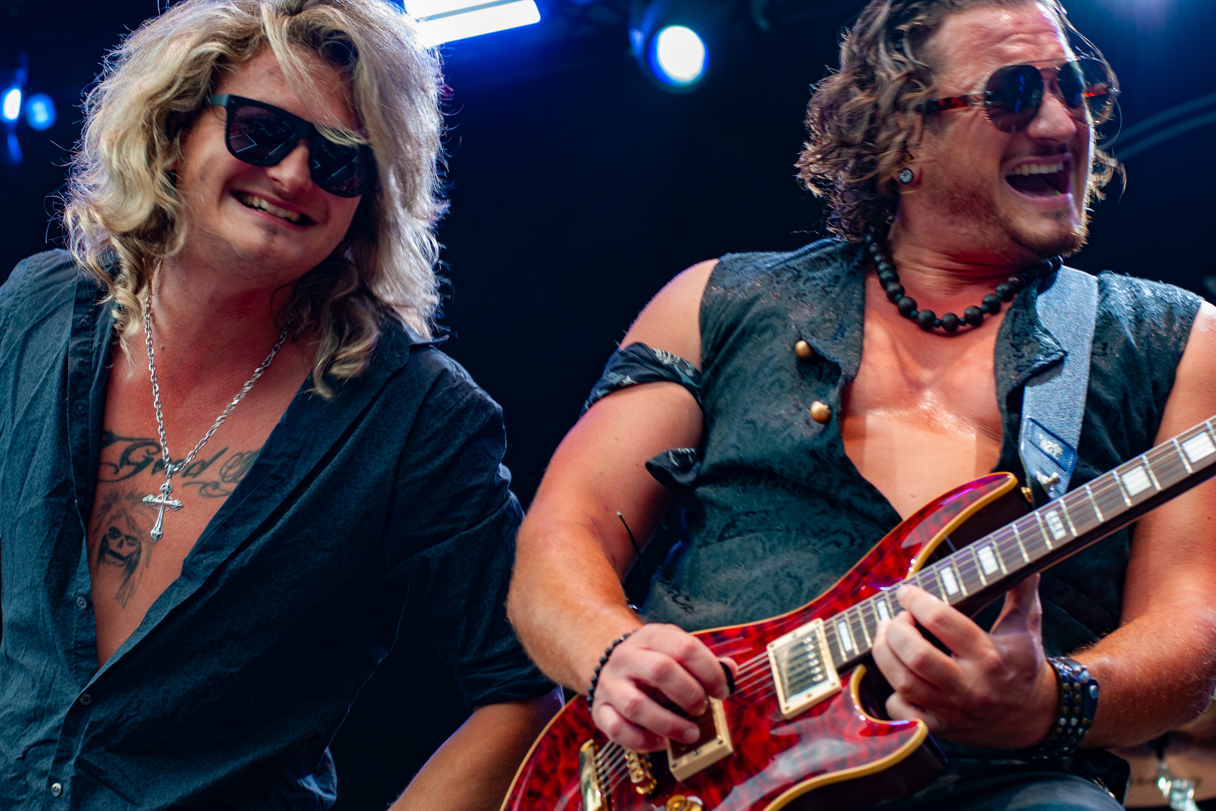 Der Abend bricht an und weiteres Festival-Highlight kündigt sich an: KISSIN’ DYNAMITE. Die Schwaben fahren mächtig auf, die Bühne wird mit beleuchteten Treppenstufen und dem glitzernden Bandemblem bestückt und gleich zu Beginn gibt es Konfetti-Regen: Breitbeiniger Glam Metal mit Stadionrock- und 80er-Jahre-Attitüde. Das Publikum feiert die Songs und die Truppe um die Brüder Hannes und Ande Braun sind gut aufgelegt. KISSIN`DYNAMITE karikieren den Glamrock nicht nur, sie nehmen ihn auch ernst. Voller Party-Pathos und schillernder Power werden „I've Got the Fire“, „The Devil Is a Woman“ und der 2012er Hit “Six Feet Under” dargeboten. Zu "You're Not Alone" lässt sich Sänger Hannes, der die blonden Haare in schönster Welle geföhnt hat, im Schlauchboot über die Köpfe der Zuschauer treiben. Im Fotograben macht das Ablichten dieser Kapelle besonderen Spaß: Es wird gepost was das Zeug hält. Mit eindringlicher Vitalität entern die DONOTS mit „Auf sie mit Gebrüll“ die Bühne. Und den Titel nimmt die Punkband wörtlich: explosiv mit großer Energie und Leidenschaft spielen sie auf. Ingo Knollmann und Co sorgen mit Gassenhauern wie “Stop the Clocks“ und „Calling“ für so manch einen wüsten Circle Pit. Das Moshpit wirbelt ordentlich Staub auf. Guido Knollmann schrammelt wild auf seine Gitarre ein. Das Publikum grölt “Whatever Happened to the 80s” so laut, dass sich der Wolf im Wald sicherlich am lecker Rothirsch verschluckt. Nach “We´re Not Gonna Take It” und “So long” ist Schicht im Schacht. Sänger Ingo ist hoch des Lobes für das Festival und den gemeinnützigen Verein, der es organisiert. Dem möchte ich mich gerne anschließen: Chapeau! Den Rausschmeißer machen die FIVE FINGER SKULL CRUSHERS, die FIVE FINGER DEATH PUNCH-Coverband aus Italien. Ein tolltes Festivalwochenende endet mit hart groovenden Gitarrenriffs.