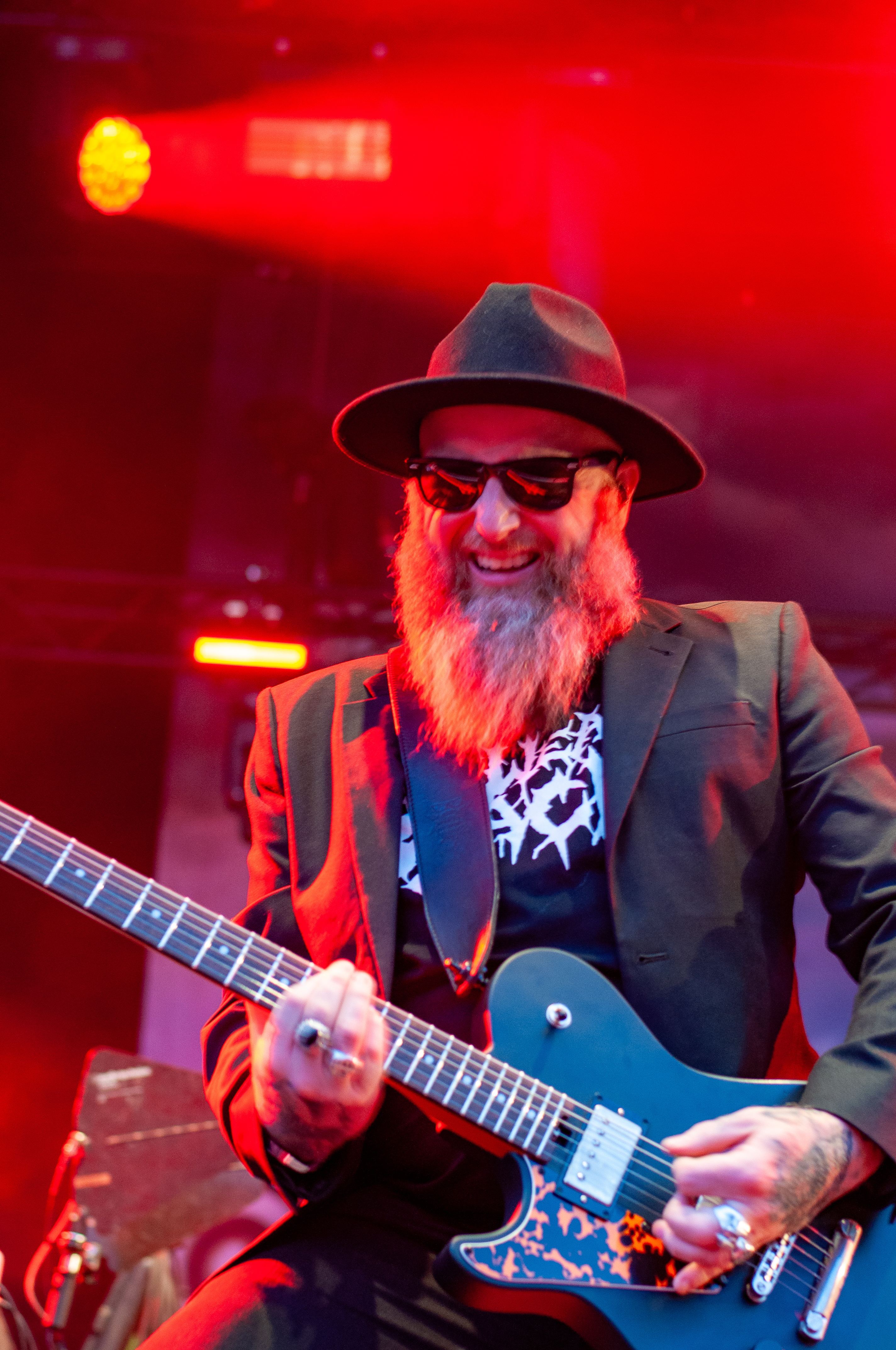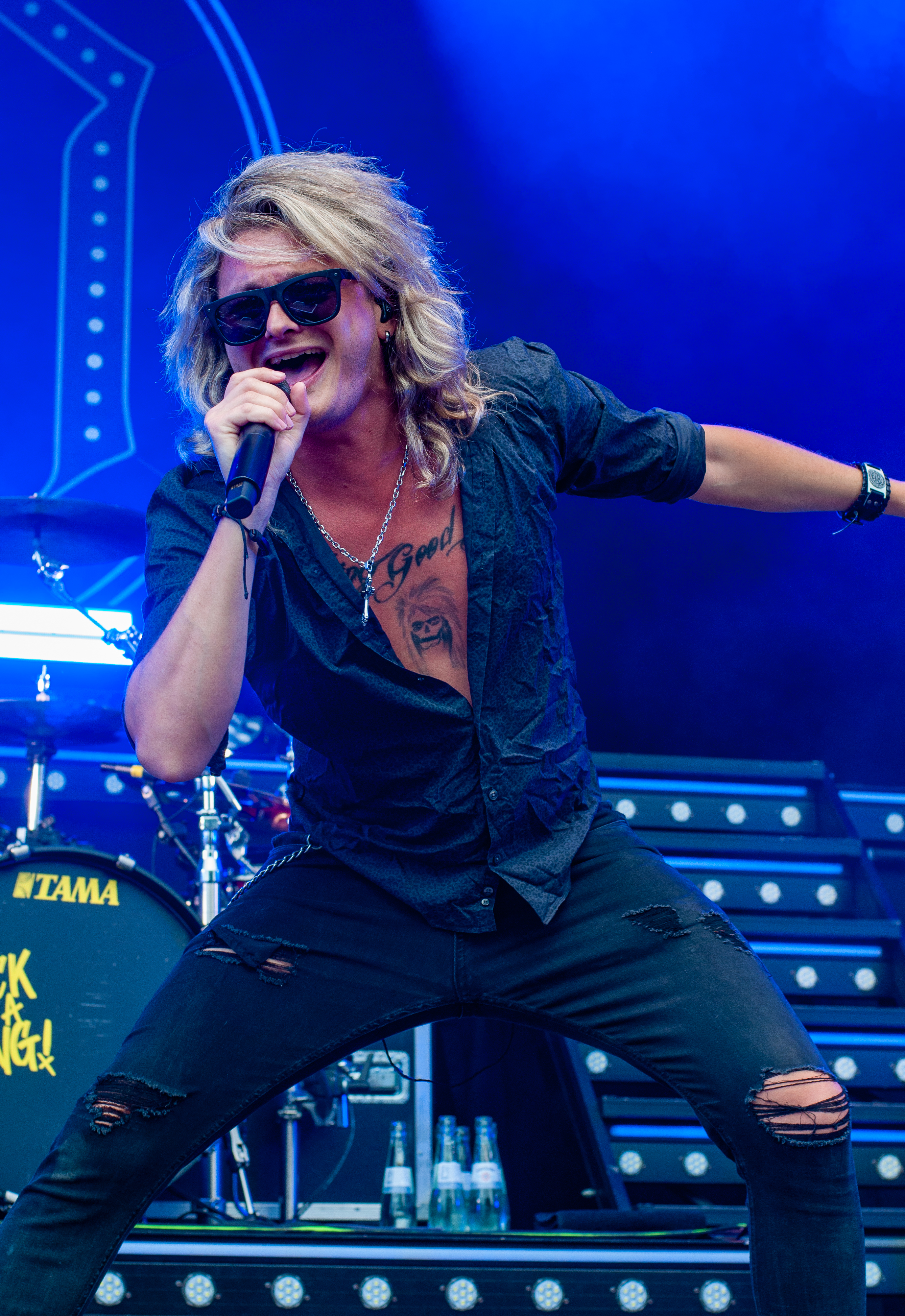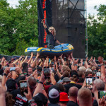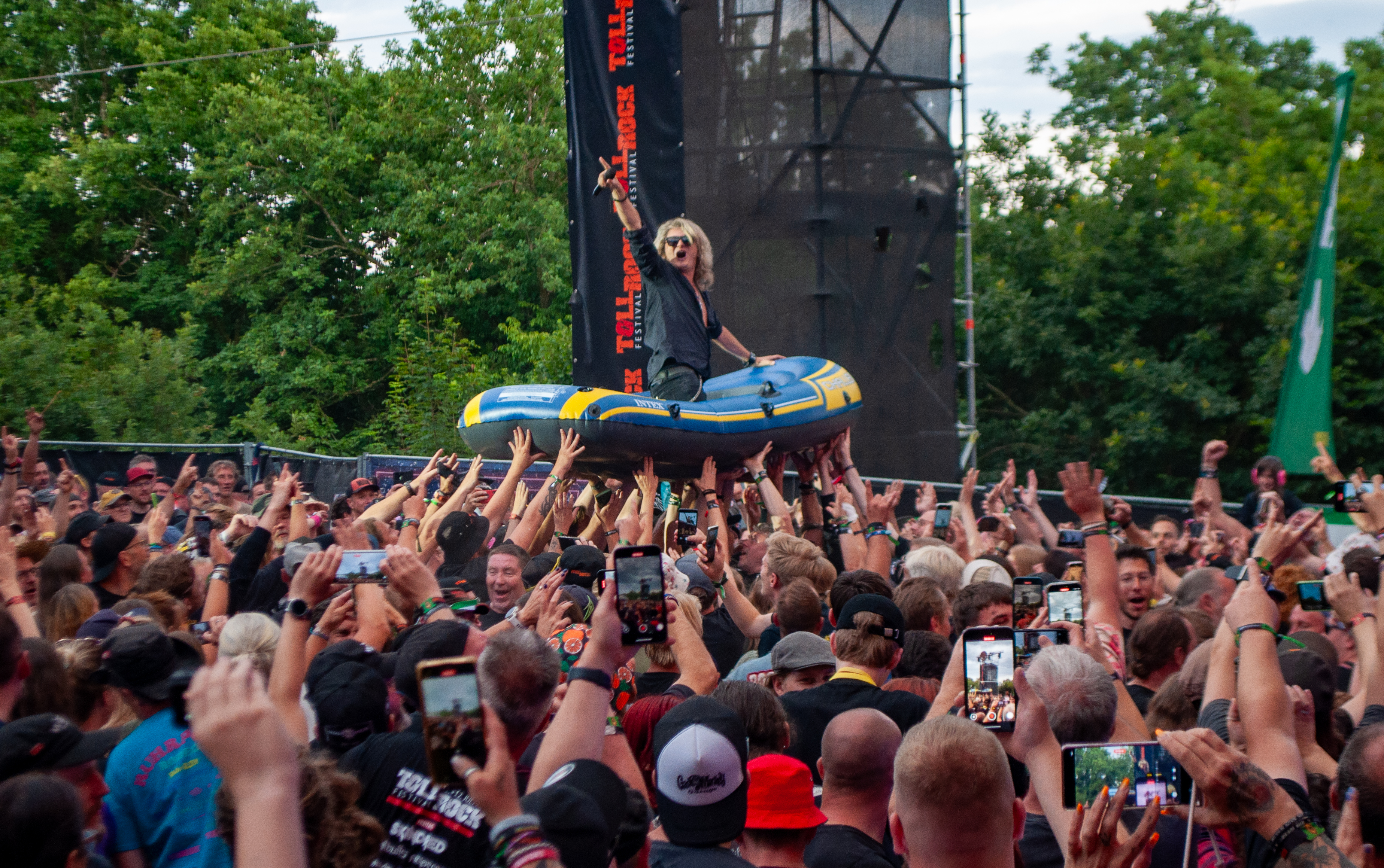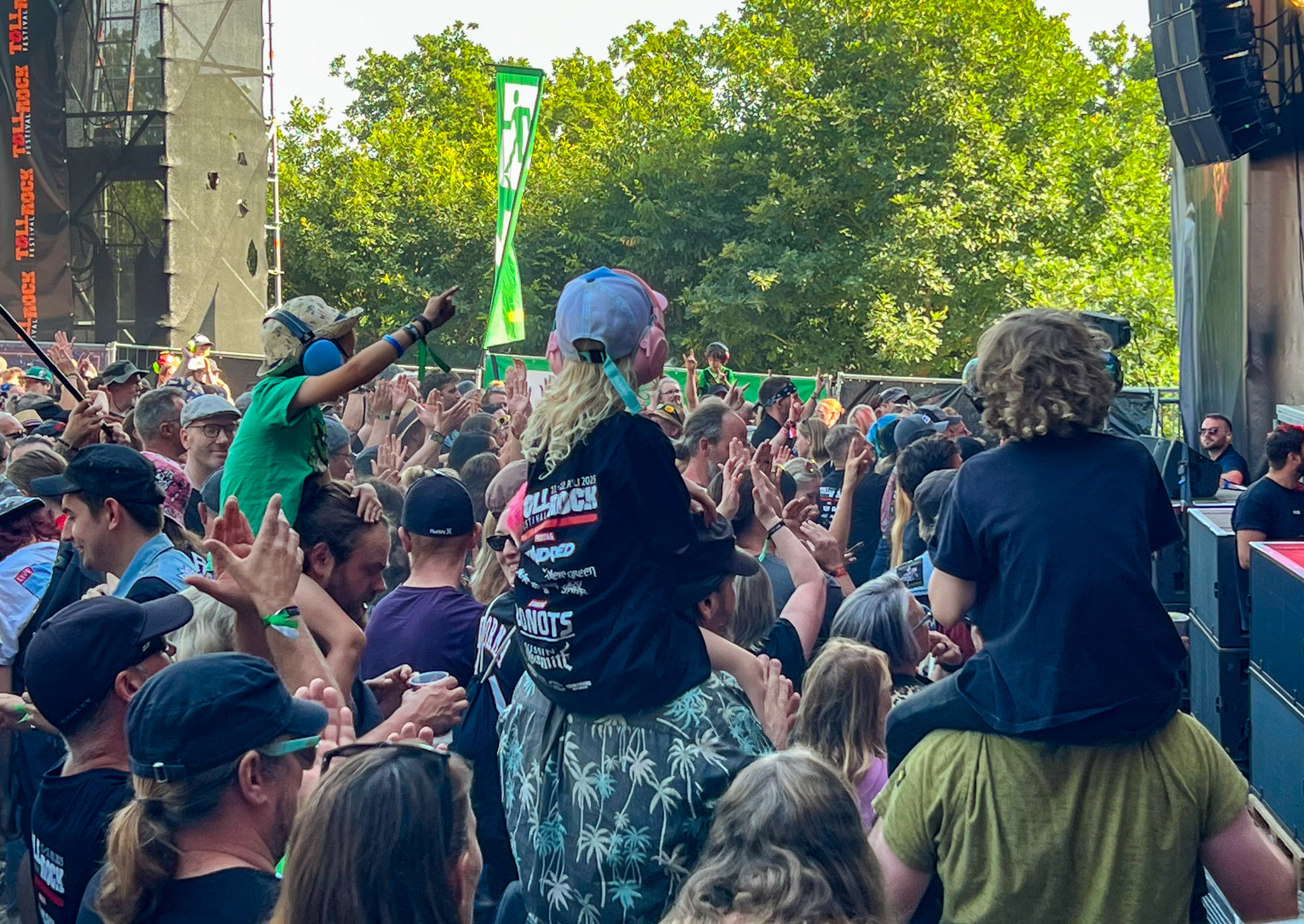 „Set Fazers“, „That's My Jam“: Die Menge springt und groovt. Webbe äußert gute Botschaften, spricht sich gegen Rassismus und für mehr Liebe aus und ermutigt die Leute Musik zu machen. Es folgen Songs wie „If i could”, „Kill the Power“ und selbstredend „Gimme That Boom“. Ich hab SKINDREAD schon mehrfach auf großer Bühne gesehen, aber hier vor circa 4000 Leuten in Schmidt funktioniert es besonders gut. Immer wieder werden Klassiker wie „Walk“ von PANTERA, „Thunderstruck“ von AC/DC oder „Out of Space“ von PRODIGY angespielt, gefolgt von elektronischen Alarm-Geräuschen und Hip Hop-Beats: das schafft eine angenehme Verwirrung. Ein würdiger Headliner! Um 23:30 Uhr gibt’s bei ROCK RISING Rockhymnen von Bands wie QUEEN, AC/DC, TOTO und PINK FLOYD auf die Ohren. Die vielen Coverbands führten in der Vergangenheit dazu, dass mich das TOLLROCK nicht so sehr interessierte. Inzwischen ist das anders und es spielen Bands verschiedener Rock- und Metal-Genres hier. Aber eine Cover-Band am späten Abend geht natürlich klar und nehm ich gerne mit! Jetzt aber ab in die Koje.