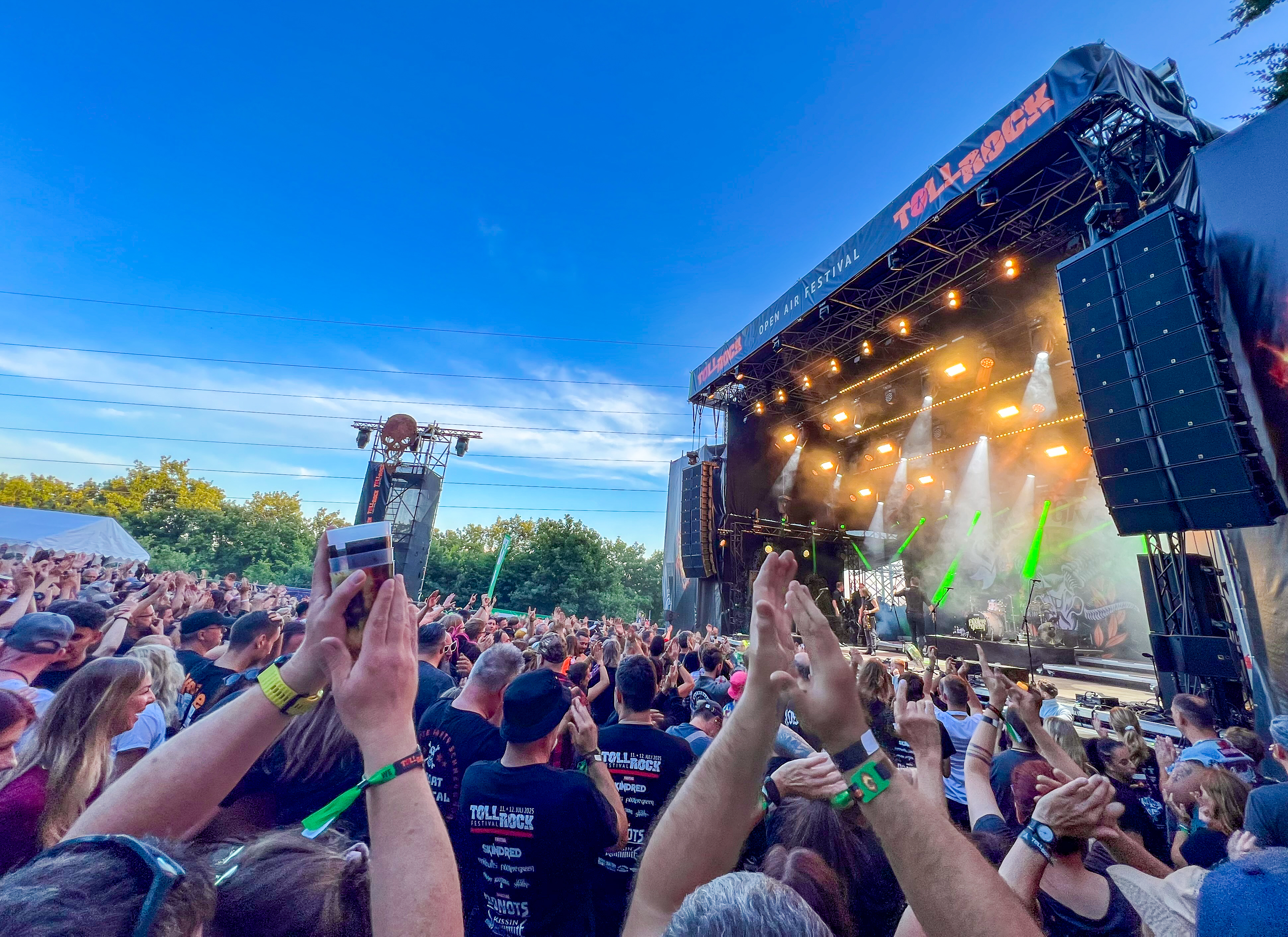 Am 11.7. machte ich mich auf den Weg nach Nideggen-Schmidt zum TOLLROCK-Festival, welches 2025 zum 21. Mal seine Pforten öffnete. Weite Anreise? Fehlanzeige! Als Eifler konnte ich schon nach 30 Minuten Fahrt mein Festivalbändchen entgegennehmen und auf dem von 2000 Campern behausten Zeltplatz, angenehmen Grillgeruch inhalieren. Das Wurfzelt auf den Acker geschmissen und ab ins bierseelige Getümmel!