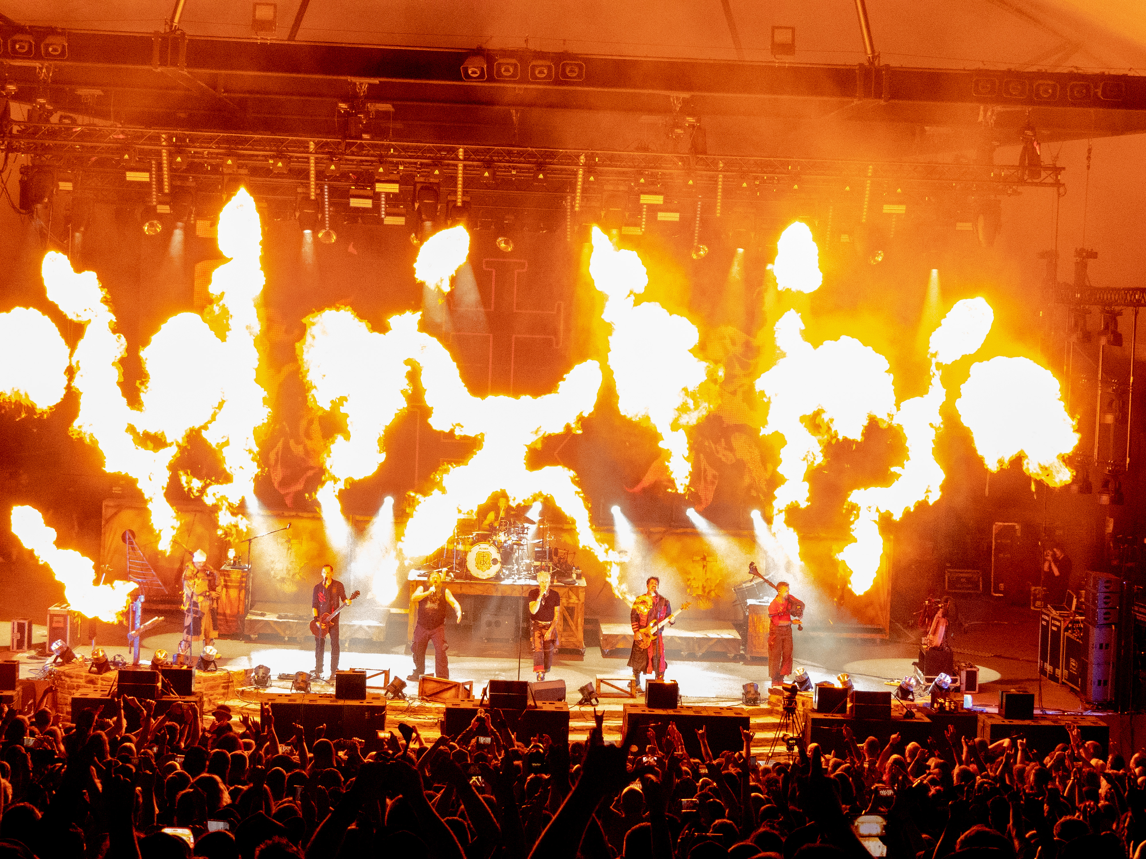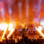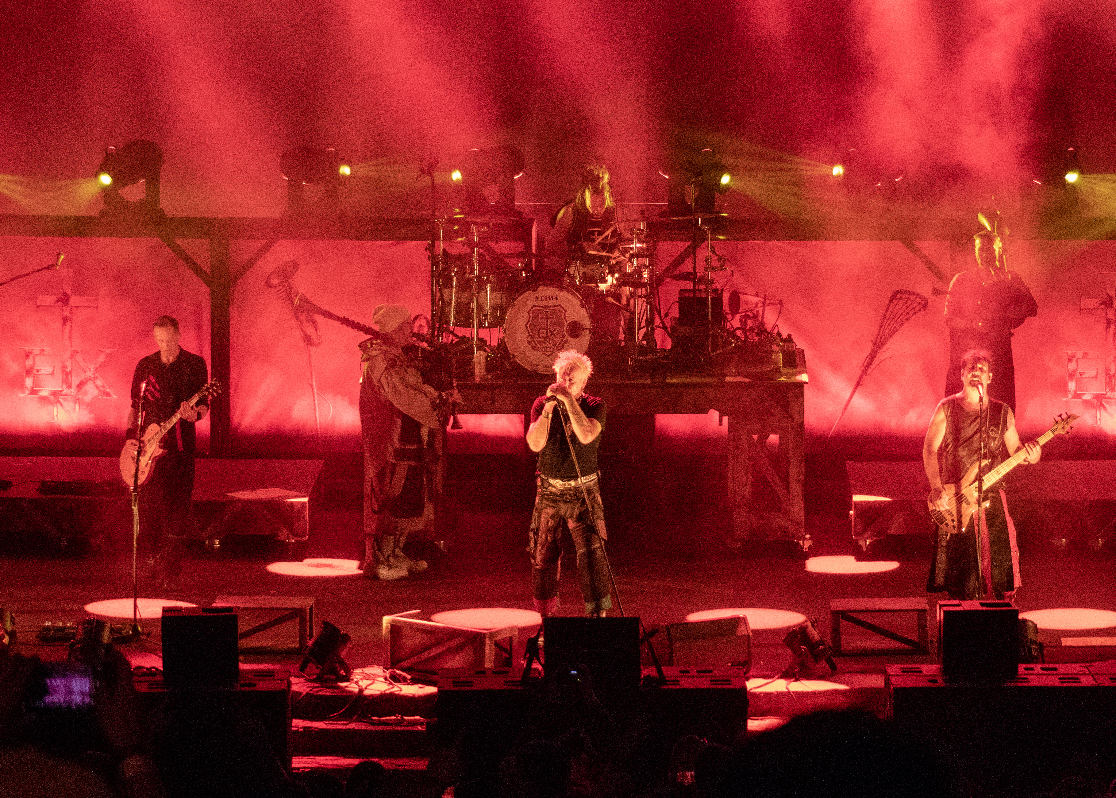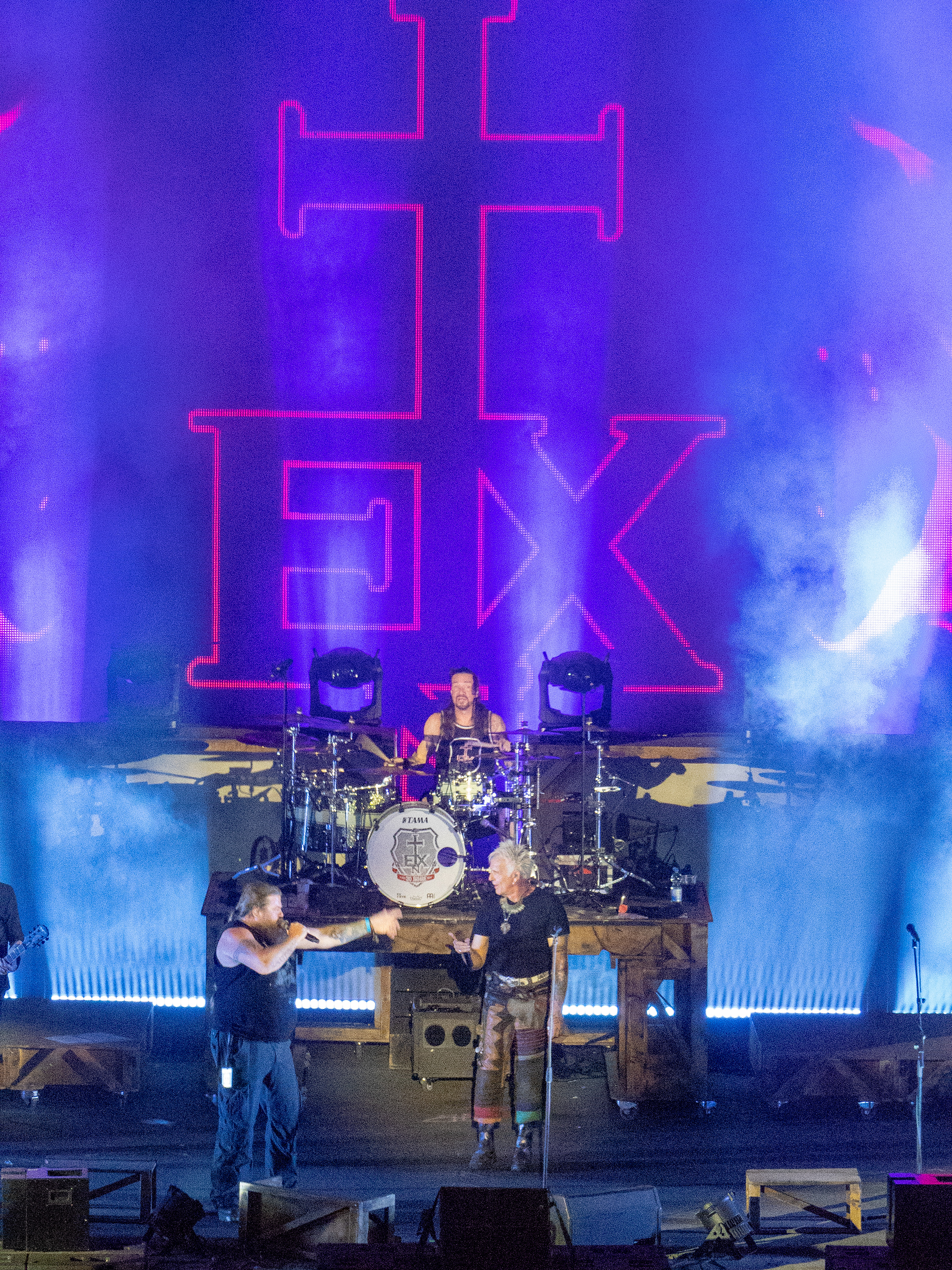 Schließlich nahte der Höhepunkt des Tages und obendrein der krönende Abschluss der Feierei auf der Loreley: der finale Auftritt von IN EXTREMO. Um 21:30 Uhr dreißig war es so weit und die Gastgeber des Festivals enterten die Bühne – buchstäblich mit einem Knall, denn die Spielleute sind bekanntlich der Pyrotechnik durchaus zugetan. Los ging es mit „Olafur“ als Intro, dem sich mit „Spielmannsfluch“ gleich ein absoluter Bandklassiker anschloss, der obendrein ordentlich aufs Gaspedal trat. Für „Weckt Die Toten“ holte man sich einmal mehr Henry Rauhbein von RAUHBEIN (laut IN EXTREMO-Sänger Micha Rhein ohnehin die heimlichen Headliner des Tages) als Gastsänger mit auf die Bühne, woran alle Beteiligten sichtlich Spaß hatten. Kurz danach wartete der erste Überraschungshit des Abends: das „Palästinalied“, das in den letzten Jahren nur äußerst selten im Set zu finden gewesen war und entsprechend für großen Jubel sorgte. Und wer sich darüber sehr gefreut hatte, freute sich dann gleich noch weiter, denn direkt im Anschluss folgte „Ave Maria“, ebenfalls ein gerne, aber nicht gar zu oft live gehörter Song. Und wo man nun eh schon in Schwung war was eher selten live vertretene Lieder anging, konnte man ja auch gleich noch „En Esta Noche“ dranhängen und sich dazu Joey Kelly auf die Bühne holen: „Joey Kelly und seine ganze Bande sind genauso alte verrückte Straßenhunde wie wir! Wir kennen uns seit 30 Jahren, damals noch aus Straßenmusikerzeiten. Damals sind wir uns gegenseitig an die Gurgel gegangen und daraus wurde dann eine richtige Freundschaft!“ Doch mit diesen beiden Gästen nicht genug: für „Wind“ bekamen die Spielleute noch einmal Gesellschaft, diesmal von ASPs Alexander Spreng. Das wäre eigentlich eine wunderbare Gelegenheit gewesen, auch „Wer Sonst“ live zu performen, aber dieser Wunsch wurde dann leider doch nicht erfüllt. Dafür gab es „Liam“, „Belladonna“, „Störtebeker“, „Sängerkrieg“ und „Mein Rasend Herz“, was ja nun auch nicht zu verachten war. Band und Publikum gaben ihr Bestes, letzteres skandierte in den Pausen immer wieder lautstark „In Extremo“ als Geburtstagsständchen und die Band war sichtlich gerührt. „Vielen, vielen Dank, Leute, ich glaube, wir haben die besten Fans der Welt! Seid ihr am 50. auch wieder dabei? Da brauchen wir dann nur etwas Hilfe und jemand, der uns auf die Bühne rollt… Naja, sagen wir lieber erstmal beim 40., das klingt besser!“