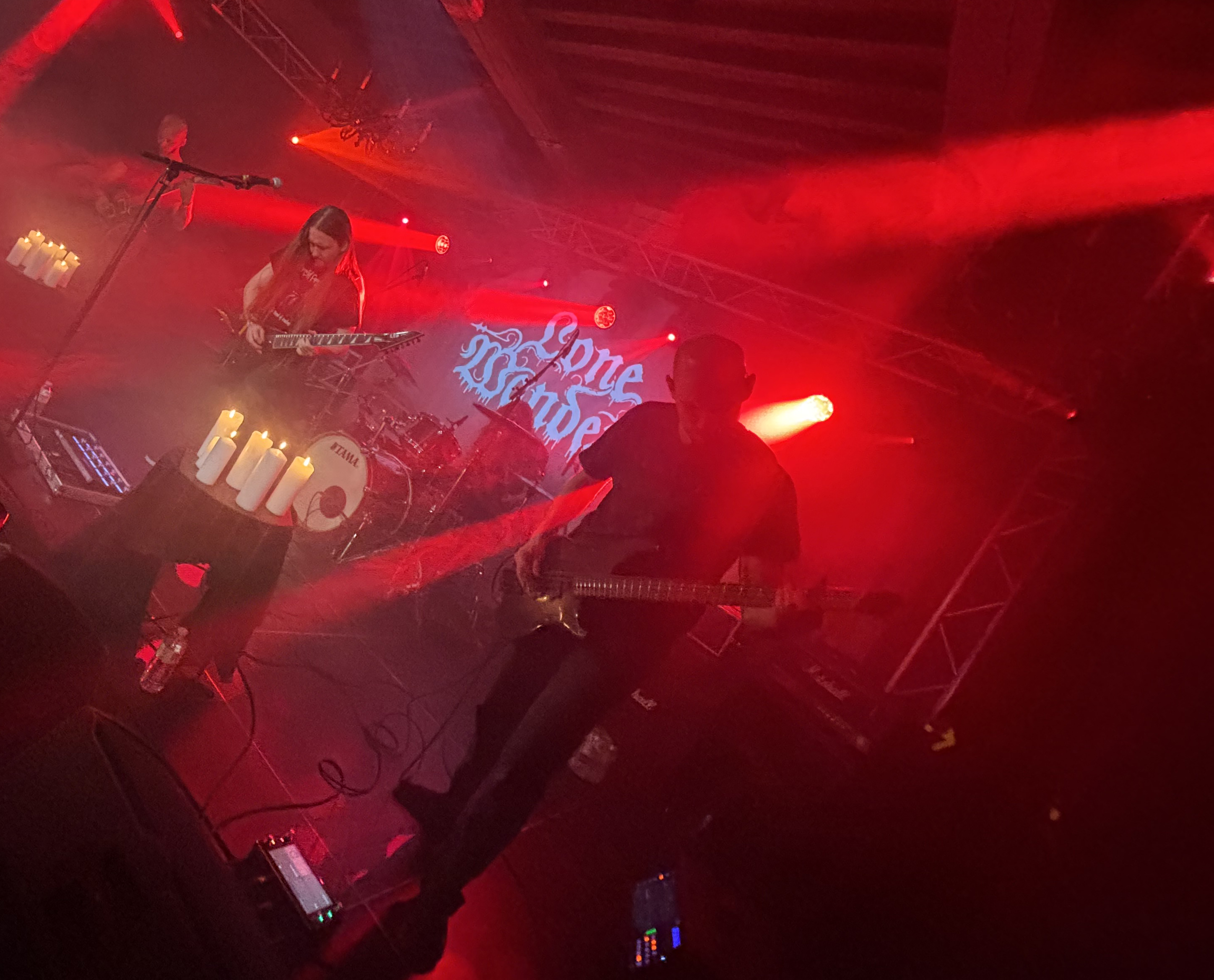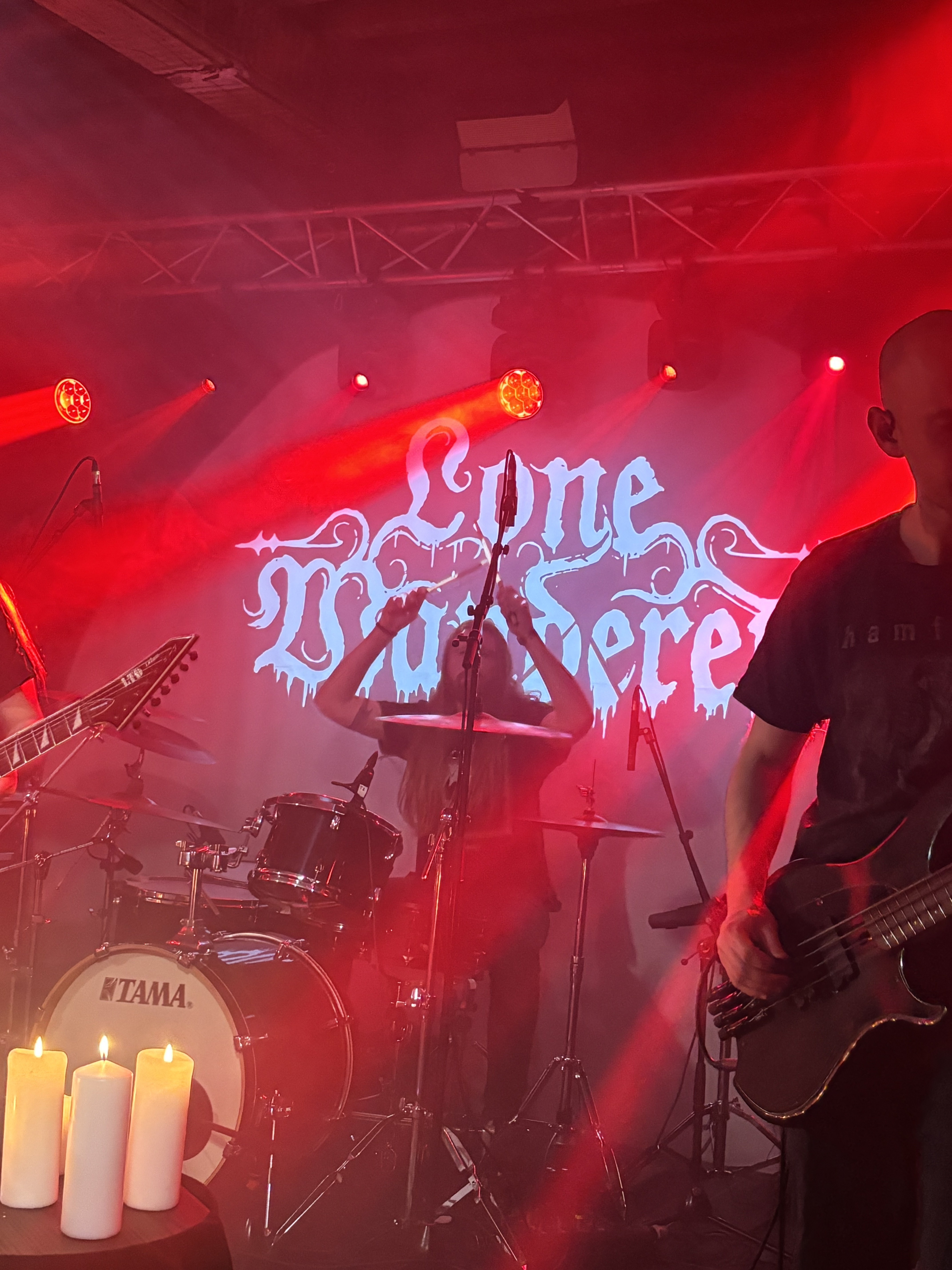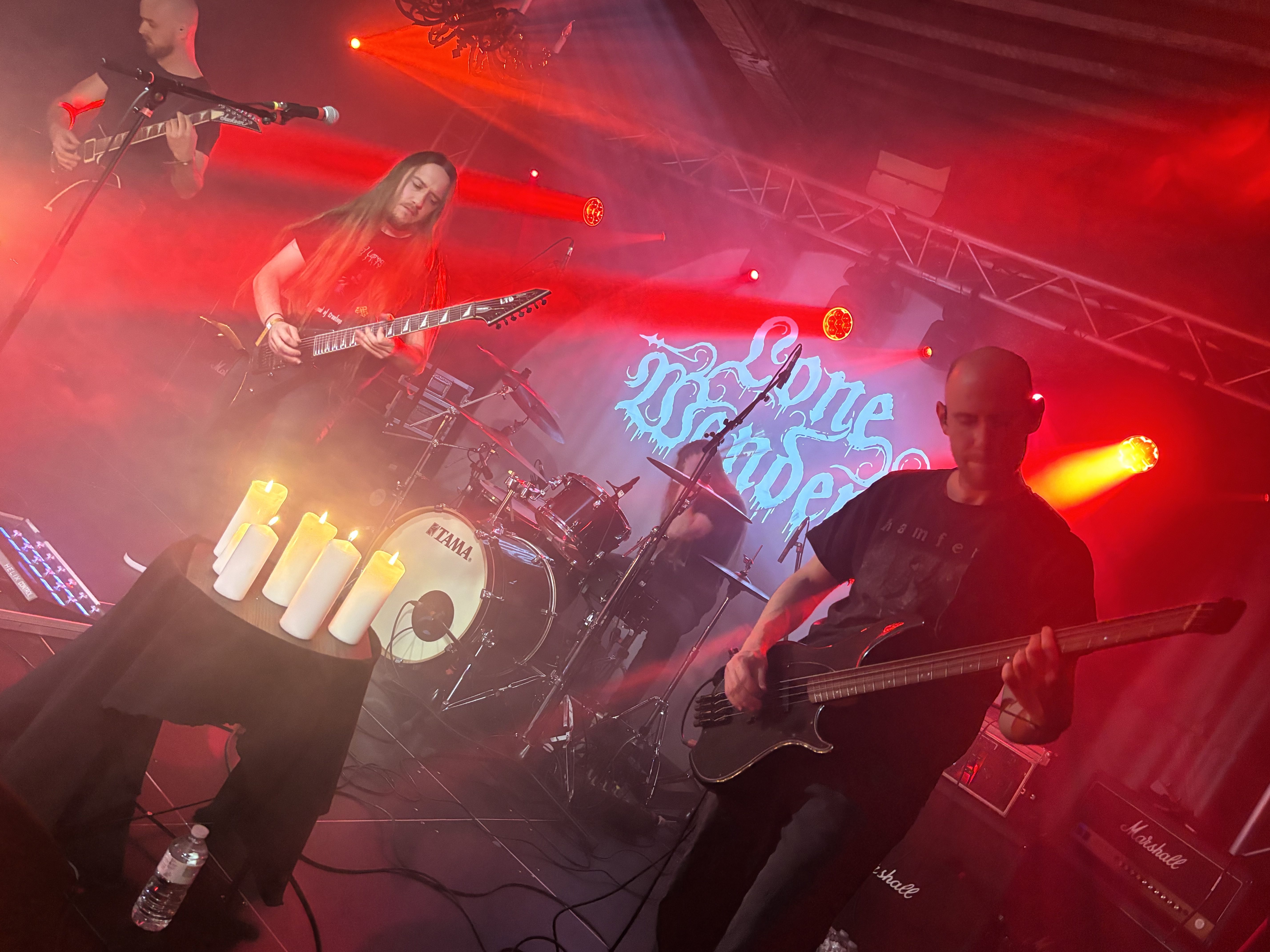 Kerzenschein und Kerkerstille: LONE WANDERER! Ein bisschen dauert es schon, bis der einsame Wanderer namens Bruno seinen ganzen Klimbim auf der Bühne sortiert hat. Sogar echte Kerzen lässt er anzünden, um die finsteren Mauern zu illuminieren. Weil ihm die Chose aber immer noch zu hell ist, fordert er erfolgreich, das Licht im kompletten Saal zu löschen. Nicht nur die an Dunkelheit gewöhnten ASCIAN-Recken finden trotz der Schwärze ihr Bier – auch LONE WANDERER liefern eine absolut bemerkenswerte Show ab, die ihrer neuen Scheibe „Exequiae“ mehr als gerecht wird. „Existence Nullified“ – joo freili!