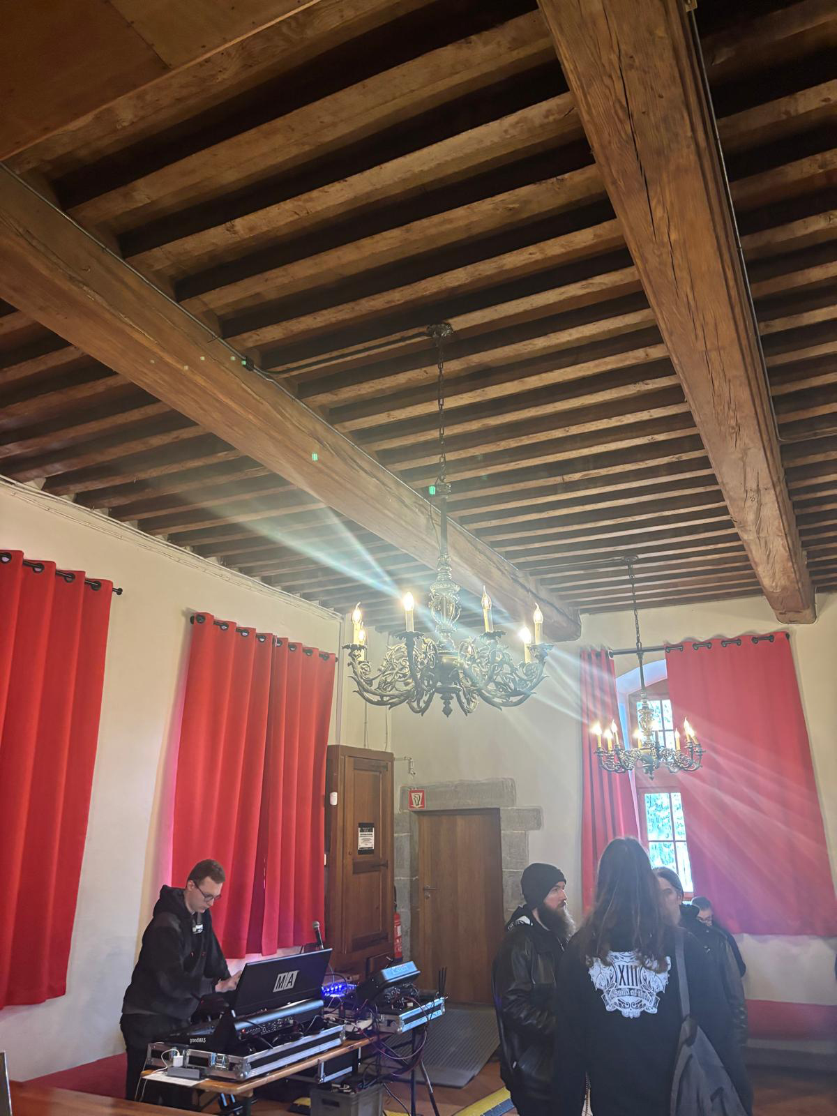 AETURNA zünden das Feuer pünktlich im Chateau D’Avourie im belgischen Anthisnes an, direkt um die Ecke von Lüttich. Wer die Location noch nicht gecheckt hat, kommt aus dem Staunen nicht raus: Die mittelalterliche Burg ist der absolute Wahnsinn! Im Saal startet die Doom-Messe, während Holztreppen, massive Portale und edle Kronleuchter und samtene Vorhänge dafür sorgen, dass sich die Crowd wie edle Burgherren und Burgfräulein fühlt. Die belgischen Getränke in den noblen Biergläsern sind für deutsche Pilstrinker zwar gewöhnungsbedürftig, aber die Craft-Beer-Ultras feiern es hart. Im Untergeschoss mutiert so mancher Doom-Fan beim Anblick der Auswahl zum kleinen Kind im Bonbonladen.