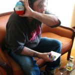 Wir haben da auf diesem mobilen Festival gespielt. Es ist irgendwie seltsam, weil der Flug dahin so wahnsinnig lang ist, und die Zeitverschiebung ist wirklich entsetzlich. Es ist ein furchtbarer, furchtbarer Flug. (Er zeichnet weiter). Oh, ich fürchte das wird ein bisschen bizarr hier, ich glaube ich bekomme Fieber...