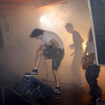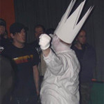 Was dann kam, war für die meisten Anwesenden der Schock schlechthin. Wer CAPUT nicht kannte, lernte sie schnell kennen. Ein komplett weißer Sänger in Strumpfhosen und geschminkten Gesicht, weißem Hemd und einer Papierkrone bestritt das Konzert jedenfalls komplett im Zuschauerraum. Ein Paradiesvogel, der wie besessen vor der Bühne herumturnte und so nach und nach die Reihen lichtete. Die Musik der Jungs ist brachial. Derbe Gitarren, aggressive Gitarren und erwähnter Sänger in weißem Aufzug der sich die Seele aus dem Leib brüllte. Umstehende behaupteten zwar, den einen oder anderen Song wiederzuerkennen, mir fiel eine Unterscheidung jedoch recht schwer. Als Gesamtkunstwerk betrachtet eindrucksvoll, musikalisch anstrengend und in jedem Fall gewöhnungsbedürftig.