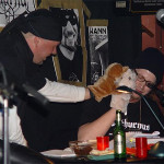 Die insgesamt fast viereinhalb Stunden sollten sich nun Eric und Volkmar Weber abwechseln, für Laune im Club zu sorgen. Die geplante zweite halbe Stunde in Volkmars Händen wurde zum einen deutlich länger als geplant und zum anderen noch unterhaltsamer als erwartet. Stand das COTHURNUS Magazin schon jeher für gute Unterhaltung zwischen grenzüberschreitender Geschmacklosigkeit, linker Bissigkeit und metallischem Hochgenuss. Auch ohne die angekündigte Begleitung durch Jarne, der irgendwelche obskuren PCs nach Lyon fahren musste, lag die Meute teilweise auf dem Boden vor Lachen. Besonders amüsant war hier natürlich die großartige Story über den legendären MAYHEM Auftritt in Berlin aus dem 2001er COTHURNUS. Eine andere COTHURNUS Petition betrifft die nicht zu rechtfertigende und somit hier nicht anerkannte Auflösung der unsterblichen IMMORTAL bzw. die Umbenennung in MORTAL 2003 oder NEARLY IMMORTAL. Völlig abgedrehte Geschichten über holländisches "Nazi Goreng" oder ein Vorgeschmack des am 8.Mai erscheinenden neuen COTHURNUS durch die Aktion "Dönerweitwurf Gegen Rechts" trafen die Lachmuskeln hart. Interaktives Musikraten und ein Lehrgang zum Thema Songwriting durch die JBO des Grindcore, die EXCREMATORY GRINDFUCKERS. Den anderen Teil seines Programms bestritt er durch Lesungen aus Büchern von Wischmeyer (u.a. ex-Frühstyxradio), thematisch bewegte man sich zwischen gegrillten Delphinrosetten, analen Ausscheidungen und einem High-Tech Ägyptenurlaub. "Reich sein, heißt nicht Ferrari fahren, sondern einen verbrennen". In diesem Sinne. Das neue COTHURNUS gibt’s ab dem 8.Mai!