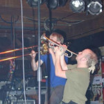 Die Fabrik war zwar nicht ganz ausverkauft - schätzungsweise zu zwei Drittel - doch zum Feiern war eindeutig genug Publikum vorhanden. Inzwischen zum Trio (zurück-)geschrumpft, dabei aber verstärkt durch Posaune und Trompete, und z. T. auch durch weitere Gastmusiker, fuhren sie ihren bewährten Ska-Punk-Sound und direkt ab dem ersten Song wurde gepogt und gedivt, was das Zeug hielt. Das Programm war schön gemischt: In der ersten Hälfte des Konzerts gab es abwechselnd einen Song der neuen Platte und einen alten zu hören, in der zweiten Hälfte verlagerte sich der Schwerpunkt dann in Richtung der alten Stücke, wobei einige sogar auf Zuruf gespielt wurden. Und es fehlte wirklich kein Klassiker: "Gegen Den Trend", "Unbekanntes Pferd", das fantastische "Hamburg, 8 Grad, Regen" - alles kam und zündete. Wunderbar war auch "Mondschuld Country" von der "Tresenthesen"-EP mit Steal-Gitarre. Die neuen Stücke konnten dabei durchaus mit den alten mithalten und auch das Publikum nahm sie ebenso begeistert auf - und das, obwohl die Platte erst einen Tag vorher erschienen war, also vermutlich fast niemand die Songs kannte. Und man bekam auch noch ordentlich was geboten für sein Geld: Nach guten 90 Minuten folgte noch eine Zugabe à 4 Songs, nach der sich die Band eigentlich verabschieden wollte. Doch obwohl schon das Decken-Licht anging, forderte das Publikum lautstark seine Helden zurück, und sie ließen sich nicht lang bitten, sondern spielten drei weitere Songs, so dass die Band letztendlich über zwei Stunden auf der Bühne stand.