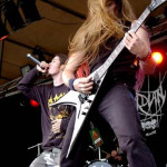 Ja und dann gab’s die niedersächsischen SLAYVADER. (Death-)Thrash-Metal ohne Kompromisse, viele "Acts Of Rage" (übrigens Naglfar gewidmet) sozusagen. Immer wieder schön, daß die Herren mit den Äxten feine bunte Tarnhosen tragen, während alles andere mehr oder minder schwarz ist. Einfach wie wirksame Idee. Ebenso wirkungsvoll die Musiksalven, die Braunschweigs thrashiest ins Publikum hämmerten. Kein Wunder, daß das Publikum die noch recht trockene Wiese im Gemünden verwandelte, die "Cities Of The Dead" waren ganz weit weg. DEW SCENTED brachten alle auf ihre Seite "One BY One" sozusagen.