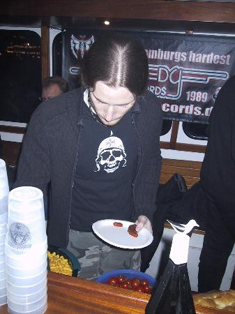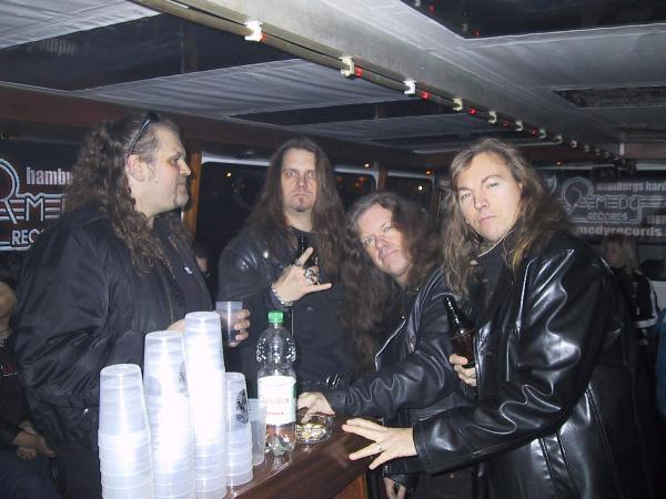 Remedy Records, die Plattenfirma von TORMENT-Chef Jörn, hatte auf die Barkasse St. Pauli geladen, um die neuen Scheiben beider Kapellen zu hören. Durch fiesen Sturm und prasselnden Regen quälten sich also Langhaarige - in schwarze Ledermäntel gehüllt - zur Brücke 19 und bestiegen den schaukelnden Kahn. Dort floss astreines Hamburger Bier - ähnlich flott wie der Niederschlag draußen - in die Kehlen der anwesenden Gäste. Label-Chefin Petra hatte zudem für das "leibliche Wohl" gesorgt. Eine fette, nicht serienmäßige Audio-Anlage besorgte den Rest. Und von der Wand lacht das Hänschen dazu. Die nächtliche Hafenrundfahrt folgte - eine wahrhaftige Metal-Reise. Leset, was die Journaille hörte: