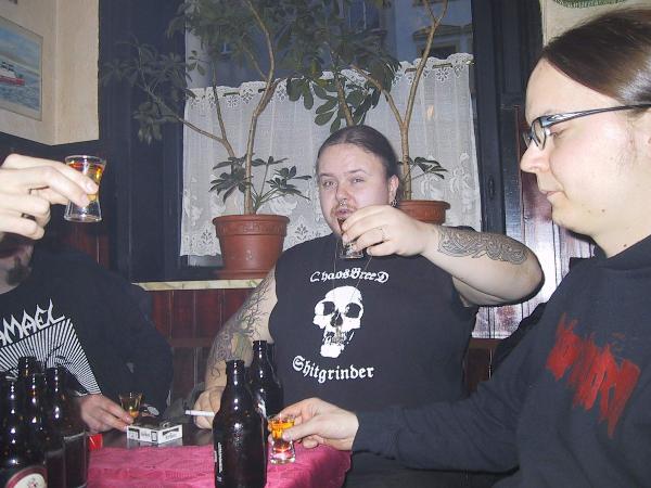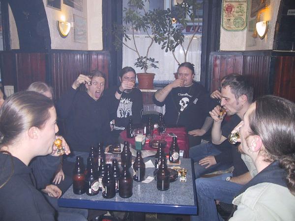 Womit wir beim nächsten Thema wären. Finnen trinken schnell und zielgerichtet - und zwar alles, was nicht niet- und nagelfest ist. Seine gewonnene Wette setzte der Tastenmann alsbald um in Trinkbares. Auf Anregung des Gitarristen Henri (Apfelkorn JETZT"!) orderte er solange den fruchtigen Spaßmacher, bis Herberts Vorräte erschöpft waren. Also flugs umgestiegen: Der Wirt brachte auf Kosten des Hauses kleine Feiglinge, es folgte Jägermeister und immer wieder Bier…