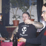Nach diesen kleinen kulinarisch-sportlichen Ausflügen (nebenbei versuchten sich alle im Bierdeckelweitwurf) lockerten sich die Zungen auch beim in sich gekehrtesten Nordmann. Während sich die Finnisch-Kenntnisse der am Tisch sitzenden Germane auf das schnell gerlente "UTU UTZ" (1.1) und "Perkele" ("Vorwärts") beschränkten, merkte sich die Suomis in beeindruckender Geschwindigkeit nützliche Vokabeln und Sätze. Kleine Auswahl gefällig - mal abgesehen von mehr oder weniger fäkalen Versatzstücken? "Ich habe eine Panzerfaust in meinem Arschkanal", "Ich habe Spargel in meiner Lederhose" oder eben "Ich will Apfelkorn JETZT".