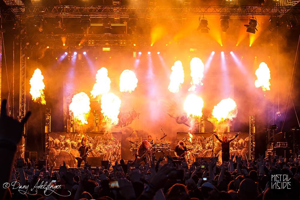 Wir reisen weiter von Schweden nach Finnland, wo die wilden Kerle und ihre Anstandsdame von ENSIFERUM herkommen. Mit den Pagan-Metallern macht kein Festival etwas falsch, die Truppe ist Spaßgarant, ohne gleich das metallische Äquivalent zu Jürgen Drews oder dem Wendler zu sein. ENSIFERUM verstehen ihr Handwerk, geben permanent Vollgas und haben offensichtlich selbst jede Menge Spaß. Dass das ansteckend ist, versteht sich von selbst. Vermutlich haben sich auch HAIL OF BULLETS von der allgemeinen guten Laune anstecken lassen, denn die Todesmetaller um Sänger Martin van Drunen hatten mächtig Spaß in den Backen und bereiteten die Leute ideal auf den folgenden Auftritt von AMON AMARTH vor. Zumindest diejenigen, die sich nicht zugunsten eines Platzes vor der Bühne schon vorm Sicherheitszaun drängelten und dort ausharrten, bis die schwedischen Kultmetaller loslegten.