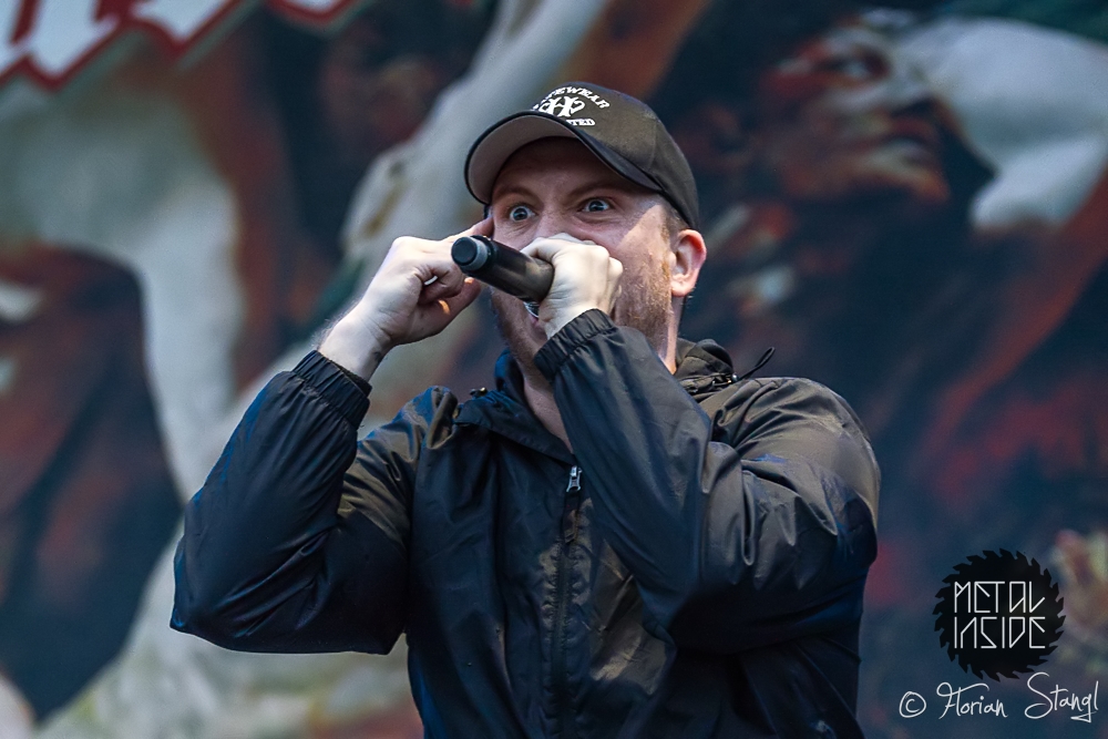 Nach gewonnenem Achtelfinale ging es quasi zur dritten Halbzeit in die Hardbowl – DISCIPLINE hatten reichlich Zulauf, begannen zwar nahezu zeitgleich mit dem Abpfiff ihre Show vor mäßig gefüllten Reihen mit „You Never Walk Alone“ als Intro, doch spätestens mit dem zweiten Song war die Bude gerammelt voll. Schade, dass somit ein Großteil den Gänsehautmoment als die Anwesenden im Zelt unter Anfeuerungen von der Bühne den Alltime-Fußball-Schlager mitsangen, verpassten. Wie melodiös auch der dreckigste Hool-Hardcore sein kann, müssen die Niederländer nicht mehr unter Beweis stellen, in dem Bereich sind sie schon längst mindestens Europameister, die Textsicherheit des Publikums war beeindruckend, ihr Wille zum Abgehen nach über 1 ½ Stunden „auf-Leinwand-Gestarre“ verständlich und so tobte das Zelt binnen kürzester Zeit. Gut zu sehen, dass die vielfachen Hinweise seitens der Veranstalter gegenüber der Nichtakzeptanz von faschistischen, rassistischen oder sonst wie diskriminierender Drucken auf Kleidung (bzw. das Tragen bestimmter Marken) sowie sonstigem Schmuck von den Ordnern sehr ernst genommen wurde als sie einen eindeutig tätowierten Herren, der seine Bildchen nach dem Ausziehen seines Shirts zur Schau stellte, nicht gerade zärtlich versorgten. Die Ernsthaftigkeit der Werbung und Aussagen wurde dadurch mehr als deutlich gemacht. Daumen hoch! (jq)
