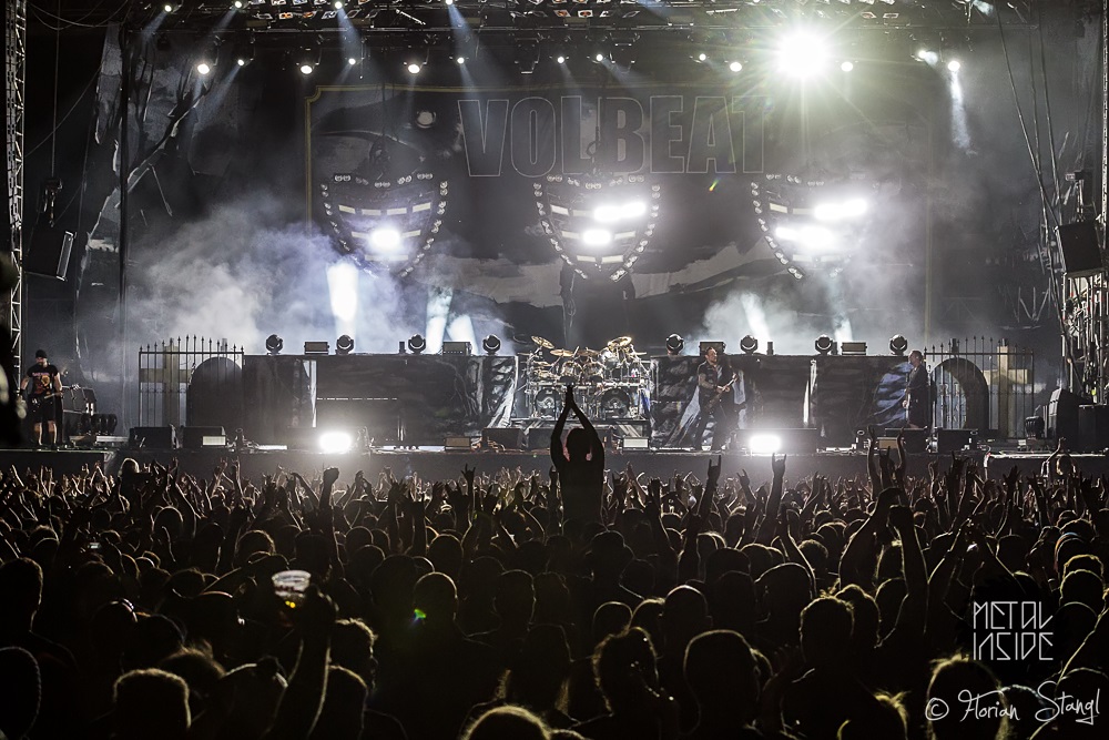 2007 habe ich die VOLBEAT das erste Mal auf dem WFF gesehen und war, wie ein Großteil des Publikums, nicht nur angetan von der geschickten Melange aus druckvoll-rotzigen Metal-Riffs und dem 50's-Rock'n'Roll-Schmalz in Michael Poulsens Stimme, sondern speziell durch sein unschlagbares Showtalent. Sieben Jahre später ist Letzteres sicherlich noch routinierter geworden, aber eben leider auch die Musik, der Überraschungseffekt bleibt schon lange aus. Jede neue, in schöner Regelmäßigkeit herausgebrachte Platte hat mindestens einen Hit und einen Song, den man ohne große Gegenwehr in der Setlist platzieren kann, denn das Schema „V“ befolgen die Dänen mit zuverlässiger Konstanz und so fällt es manchmal schwer zu entscheiden, ob man eben gespielten Song nicht bereits vor einer halben Stunde gehört hat. Nichts desto trotz sind ihre Lieder allesamt Mitsing-Garanten, ist ihre Show mit Pyros und der Leuchtkraft einer Kleinstadt im Unterhaltungswert hoch anzusiedeln und Poulsens unnachahmliche Art, mit der er jeden Gig so locker moderiert, als hätte er diese Sätze noch nie, nie, niemals zuvor gesagt, lässt dem Publikum jedes Konzert irgendwie als etwas besonderes erscheinen. Von der Warte aus zwar anspruchstechnisch bestenfalls gutes Mittelmaß, aber showtechnisch ein absolut verdienter Headliner für den ersten Tag. (jq)