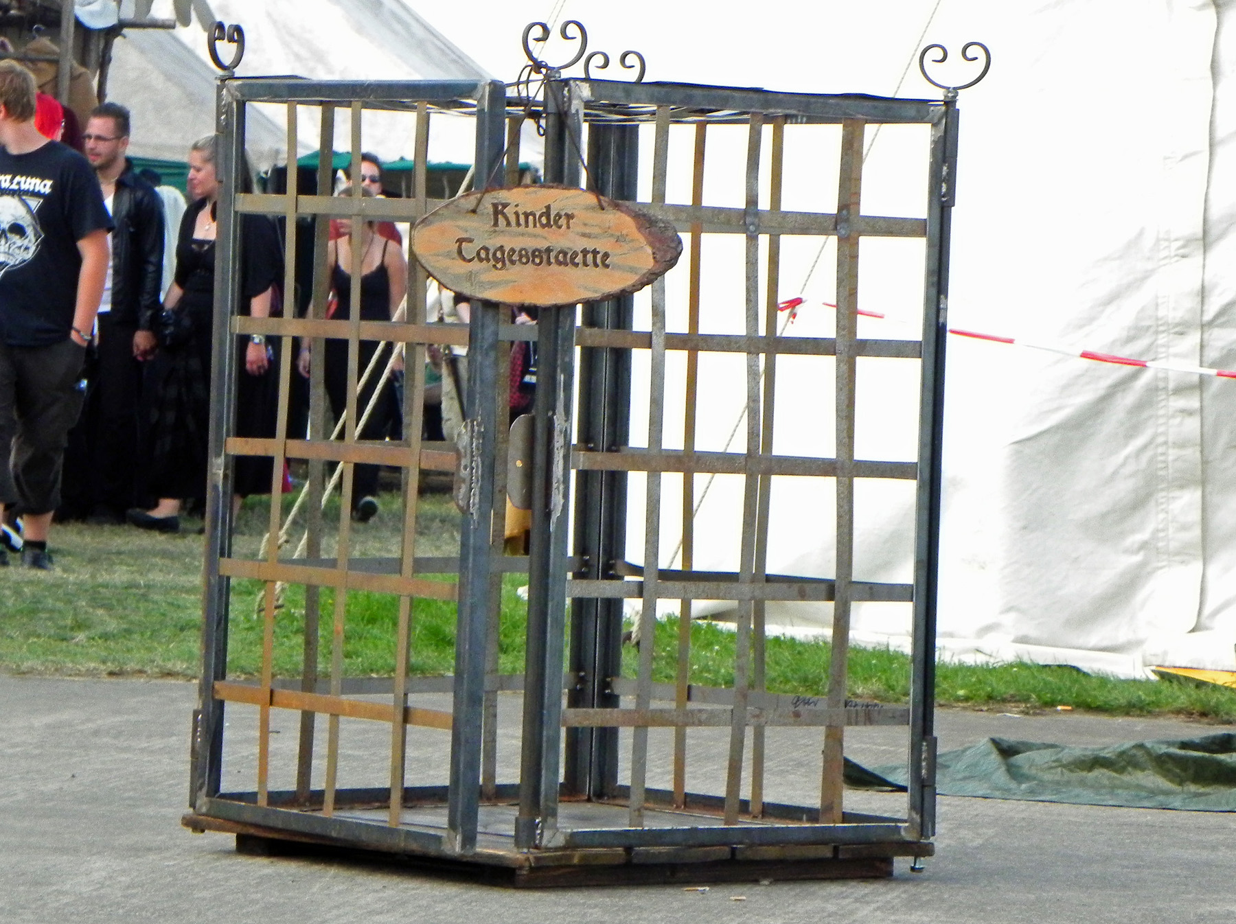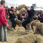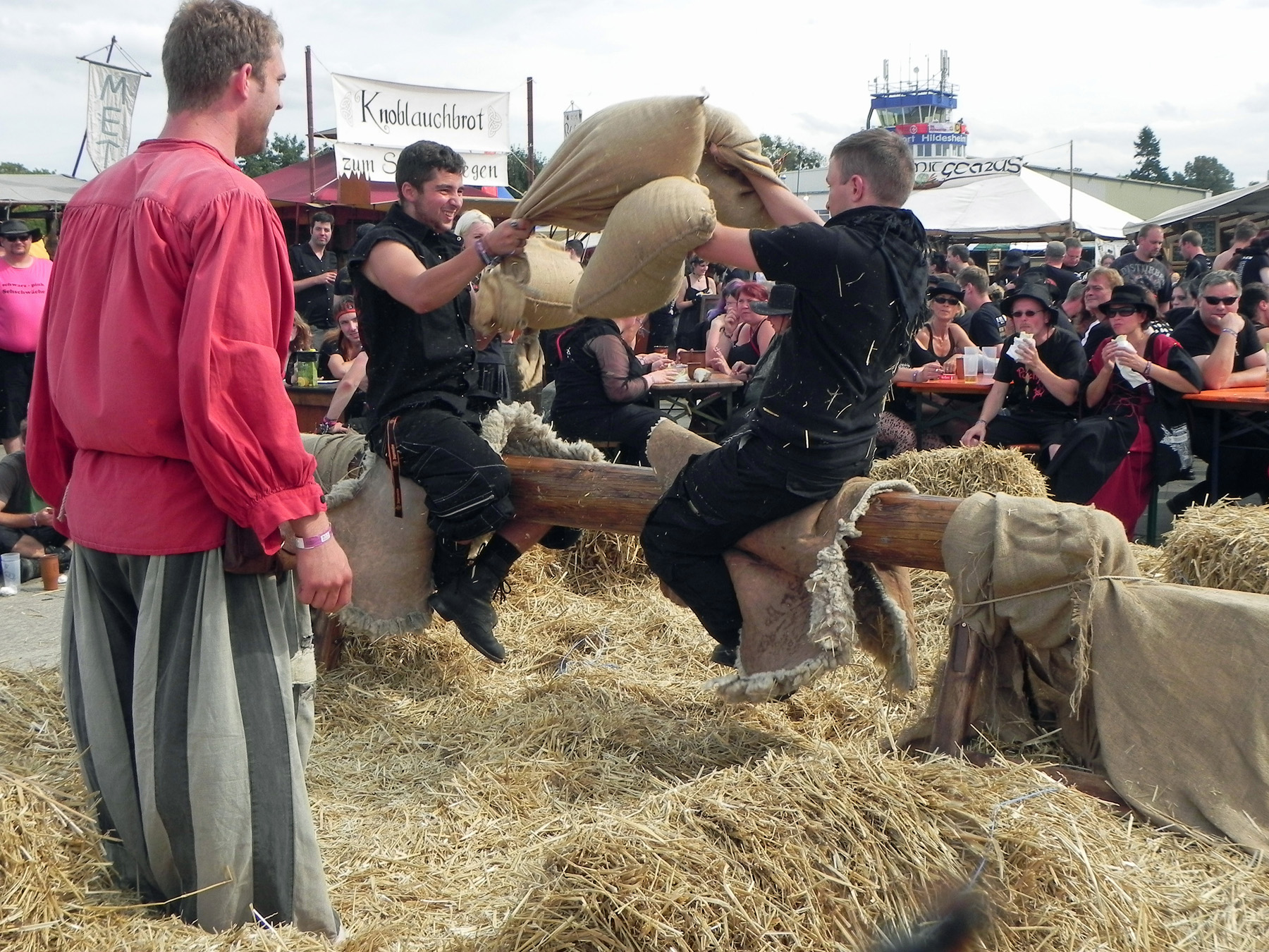 Während die Mexikaner von RABIA SORDA im Hangar dem Publikum mit harten elektronischen Klängen einheizten, ging es auf der Main Stage bei LACRIMAS PROFUNDERE rockiger und schwermütiger zu. „Antiadore“, „What I´m Not“, „I Don´t Care“ und Konsorten wurden vom Publikum gut aufgenommen und mit reichlich Beifall belohnt, bevor STAHLMANN auf die Bühne kamen und eine härtere Gangart anschlugen. Ob „Adrenalin“, „Hass Mich... Lieb Mich“ oder „Stahlwittchen“ - die Stahlmänner gaben kein Pardon und auch wenn im Publikum vereinzelt etwas von „Rammstein-Klon“ zu hören war, tat das der Sache keinen Abbruch, denn auch wenn die musikalischen Wurzeln nicht zu überhören waren, überzeugte die Darbietung doch allemal. Wer statt Neuer Deutscher Härte lieber in nostalgisch-altertümlichem Ambiente verweilen wollte, konnte sich derweil auf dem Mittelaltermarkt mit Strocksäcken duellieren, sich über die mittelalterliche Partnerbörse „Kuppeley“ Gesellschaft suchen und hinterher auch gleich gegen Bares Buße tun.