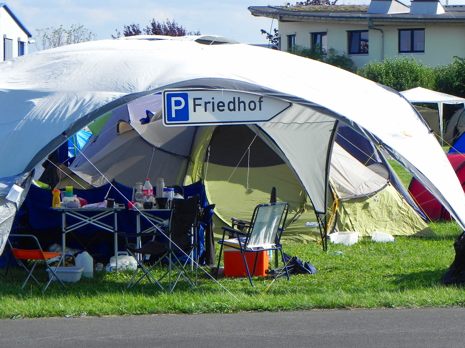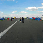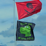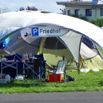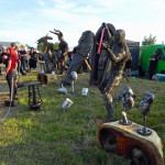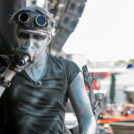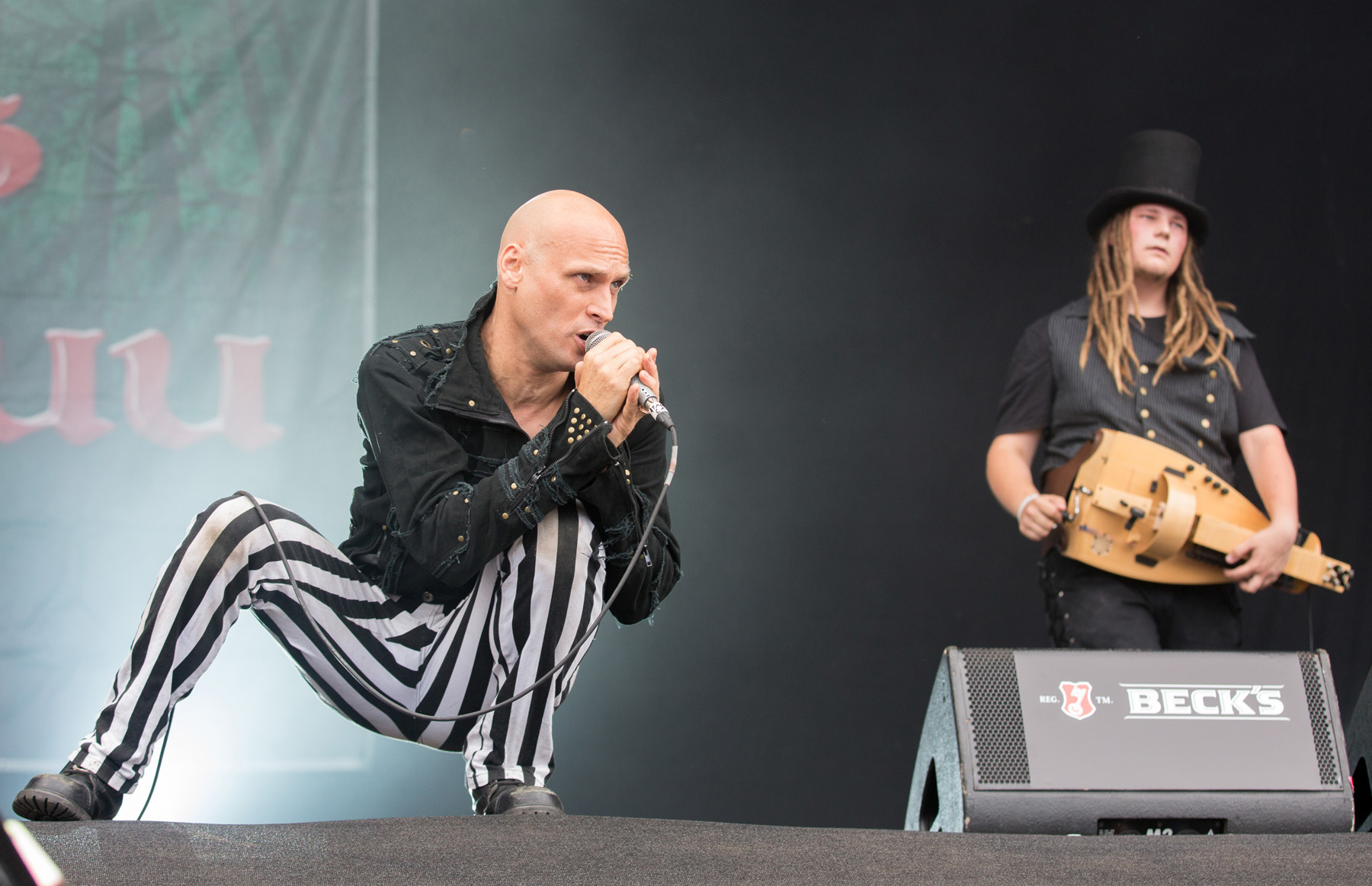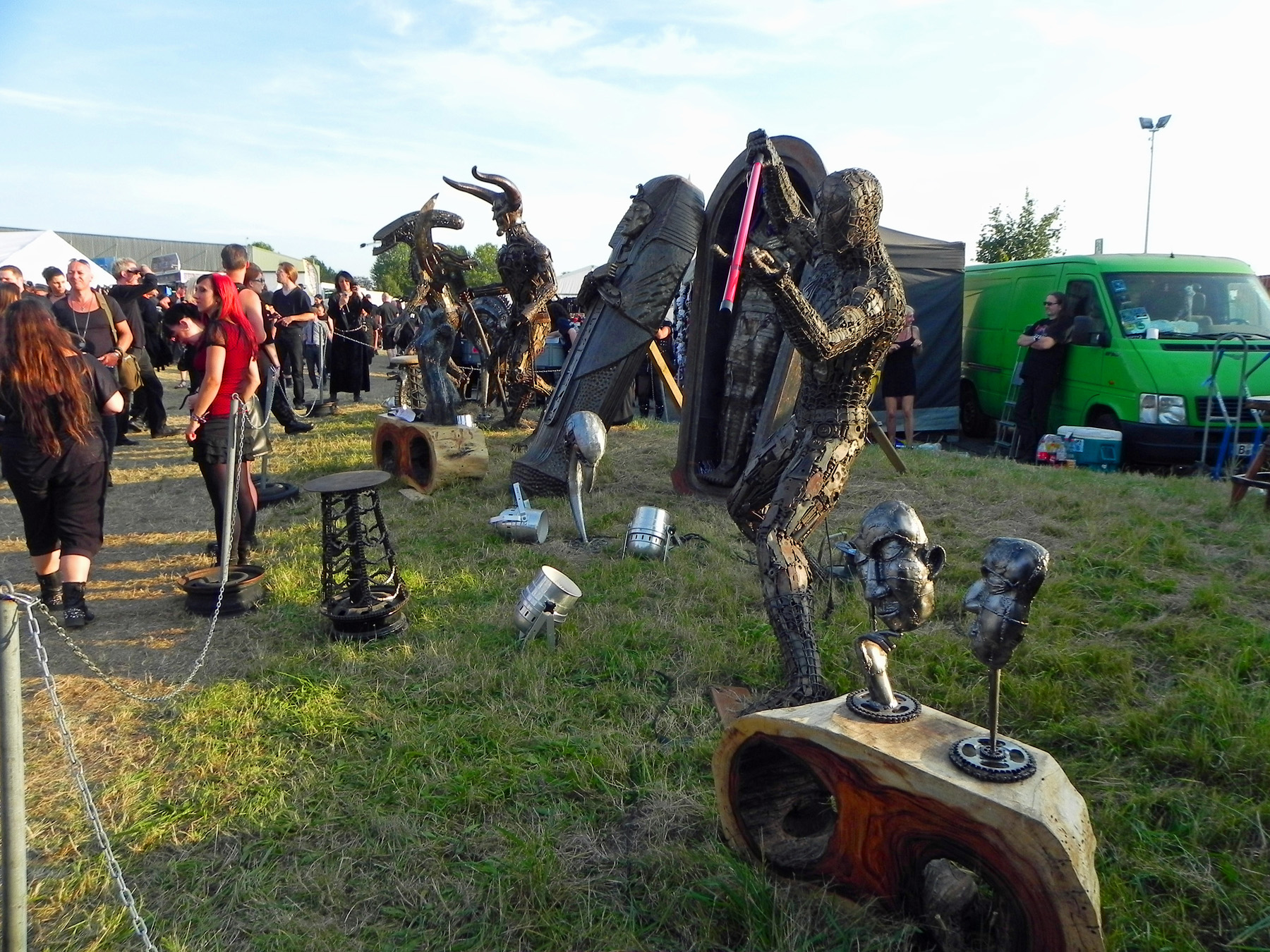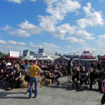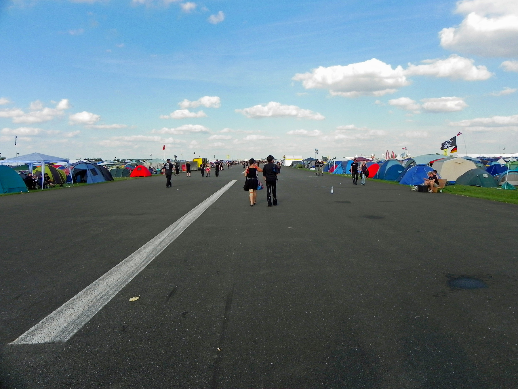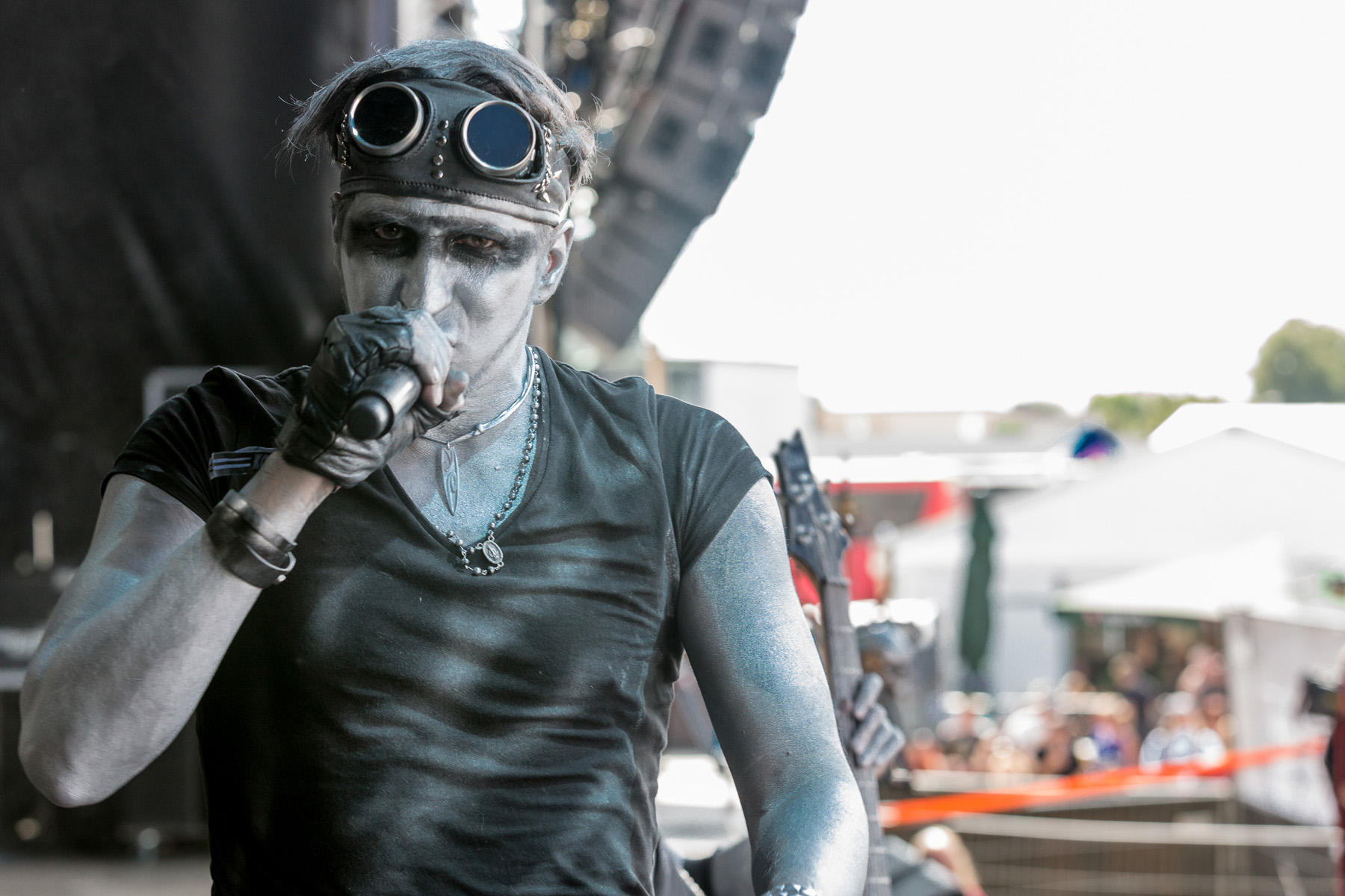 Auch vor der Main Stage füllte es sich wieder, nachdem der Himmel seine Schleusen wieder geschlossen hatte, und die schwarz-bunte Schar begann, sich erneut auf der Wiese niederzulassen, um HENKE zu lauschen, dessen eher getragene Klänge á la „Zeitmemory“, „Vergessen“ und „Wer Mich Liebt“ zu einer kleinen Pause mit gepflegter musikalischer Untermalung einluden. Unterdessen begann der Himmel zunehmend aufzuklaren, der Wind jedoch frischte ordentlich auf und sorgte dafür, dass auf dem Campingplatz einige Zelte und Pavillons auf Wanderschaft gingen oder von ihren Besitzern zumindest in eher unorthodoxen, recht windschiefen Zuständen aufgefunden wurden. Die zahlreich vertretenen Flaggen flatterten dafür umso schöner und die unheilvoll aussehenden Wolkenberge verschwanden hinter dem Horizont, auch wenn Besucher mit aufwendigem Kopfschmuck vermutlich gerne auf die frische Brise verzichtet hätten.