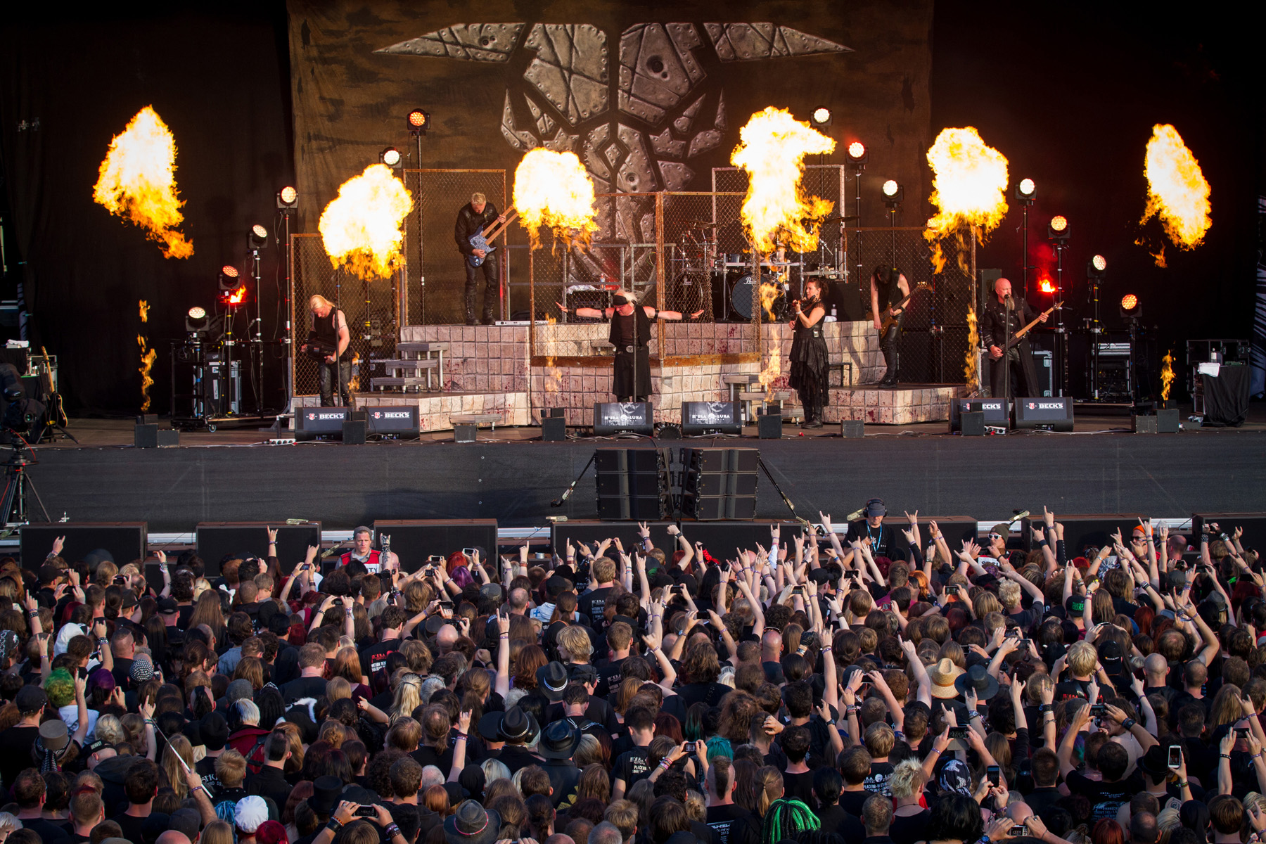 Kurz nach 18 Uhr begannen auf der Main Stage die Gothic Metal-Urgesteine von PARADISE LOST mit Songs wie „Erased“, „Isolate“ und „Faith Divides Us- Death Unites Us“ damit, langsam aber sicher das Abendprogramm einzuläuten, was sich auch in einer wachsenden Schlange am Eingang vom Campingplatz zum Festivalgelände äußerte. Mit SUBWAY TO SALLY folgte eine weitere altgediente, da zu den Mitbegründern ihres Genres gehörende Truppe, die das Publikum mit rockigen bis metallischen Mittelalterklängen auf Touren brachten. Das Programm wurde untermalt von Pyrotechnik und umfasste Klassiker wie „Wenn Engel Hassen“, „Arme Ellen Schmitt“ und „Veitstanz“, und im Anbetracht der Tatsache, auf welchem Festival man sich befand, durfte natürlich auch die Verneigung vor der Szene in Gestalt von „Das Schwarze Meer“ nicht fehlen. Überhaupt lobte Sänger Eric Fish das M´era Luna-Publikum geradezu über den grünen Klee.