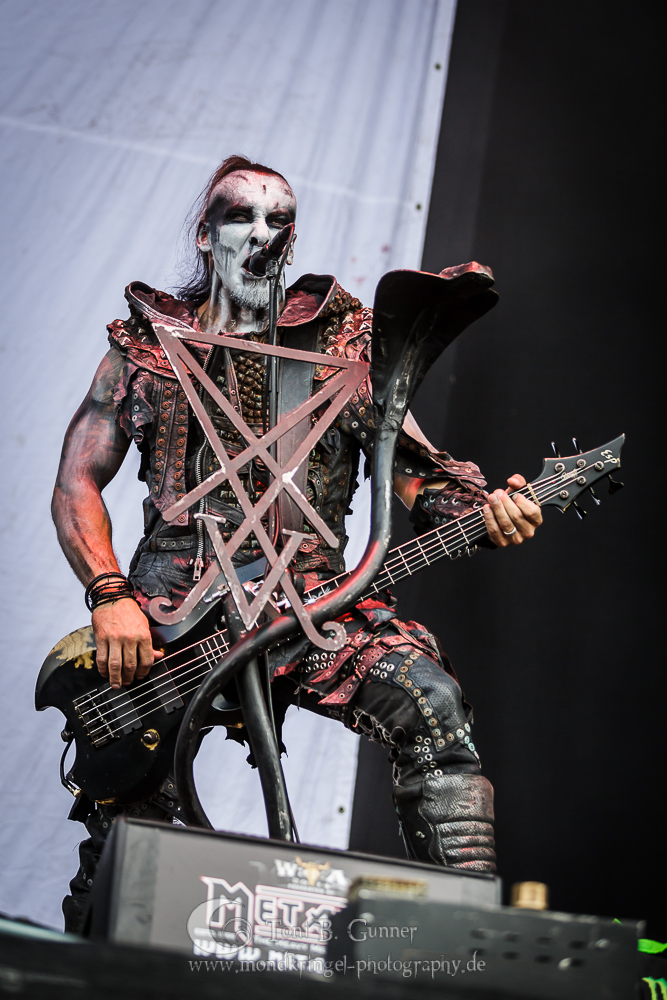Die Polen BEHEMOTH sind zurzeit einer der intensivsten und besten Livebands im Extrem Metal Sektor. Darüber hinaus dürfen sie sich über eine Spielzeit von 75 Minuten freuen. Dabei schaffen sie es, trotz gleißendem Sonnenlichts dem Gig ordentlich Atmosphäre zu verpassen. Zwar wird die gleiche Show geboten, wie am Jahresanfang bei der Hallentour, doch das tut der Stimmung keinen Abbruch. Man sieht den Musikern förmlich an, dass sie hier sind, um sich noch mehr treue Fans zu erspielen. Dabei werden mit „Blow Your Trumpets Gabriel“, „Ora Pro Nobis Lucifer“, „The Satanist“ und „O Father O Satan O Sun“ recht viele Songs vom neuen Album gespielt. Klassiker wie „Conquer All“, „As Above So Below“ und „Chant For Eschaton 2000“ werden ebenfalls gezockt. Die coole Feuershow heizt der Meute zusätzlich ein. Nur der schwarze Konfettiregen bleibt dieses mal aus. (rs)
