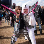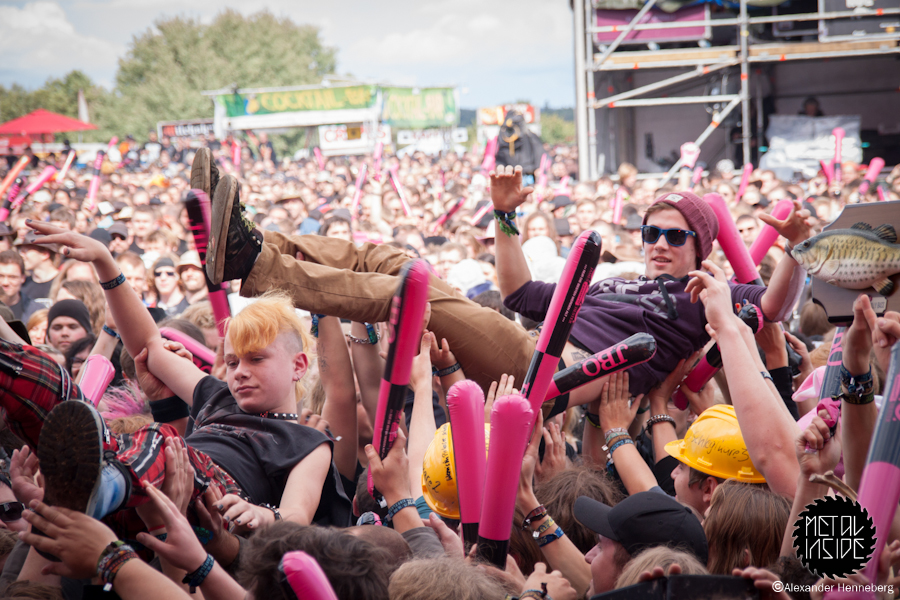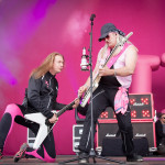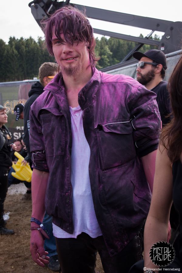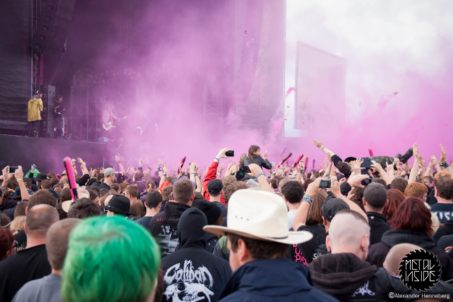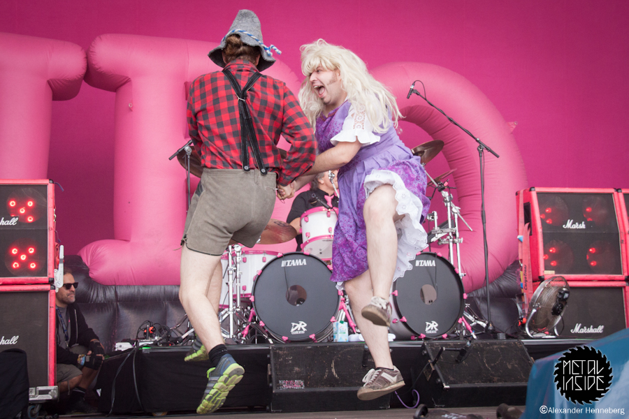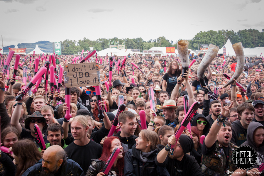 Etwas später wurde es dann aber doch wieder Zeit, die Ruhe zu beenden, denn nun kamen die Chaoten von J.B.O. und haben vorab im großen Rahmen schon angekündigt: „Es wird Pink!“. Das sich das in vielerlei Hinsicht bestätigen sollte, entdeckte man sofort. Überall waren Leute mit pinken J.B.O.-Klatschstäben und einige Rowdies warfen kleine Päckchen mit pinken Inhalt in die Massen. Zudem war auf der Bühne einfach alles in Pink gehüllt und das auf einem Metal-Festival. Aber irgendwie ist das auch passend für die drei Jungs. Ihre Show war die reinste Gaudi und alle waren in Partystimmung. Was in den pinken Päckchen war, wurde auch schnell enthüllt, es war Holi-Pulver, das alle zeitgleich hoch werfen sollten, und als der Zeitpunkt kam, war tatsächlich alles und jeder pink!
