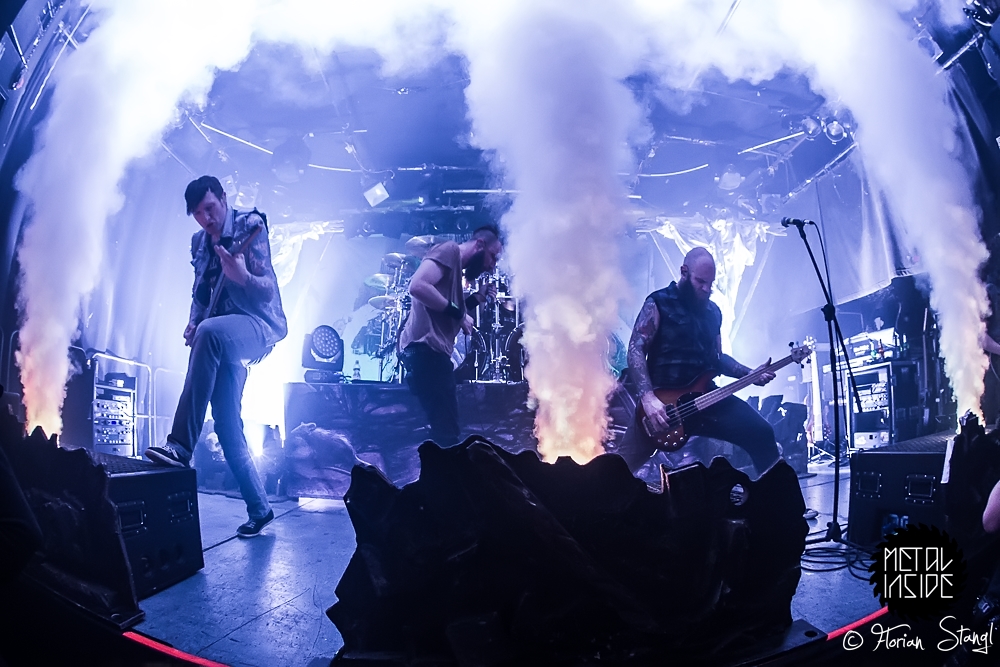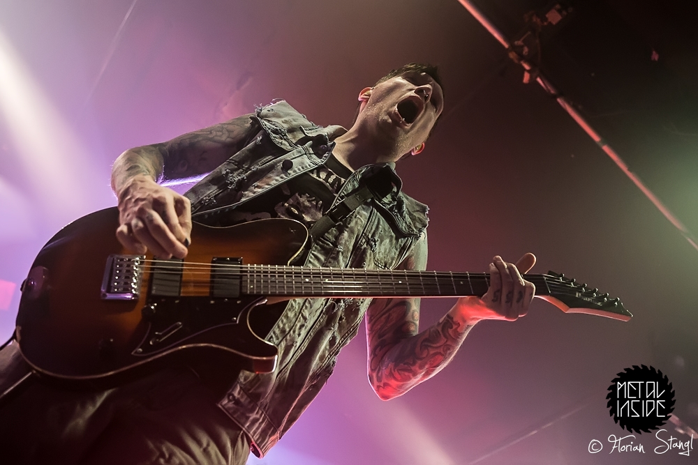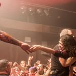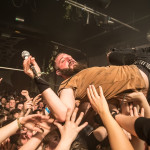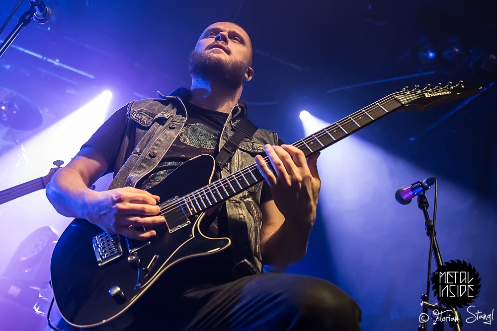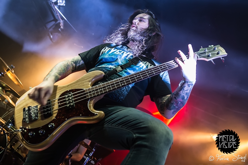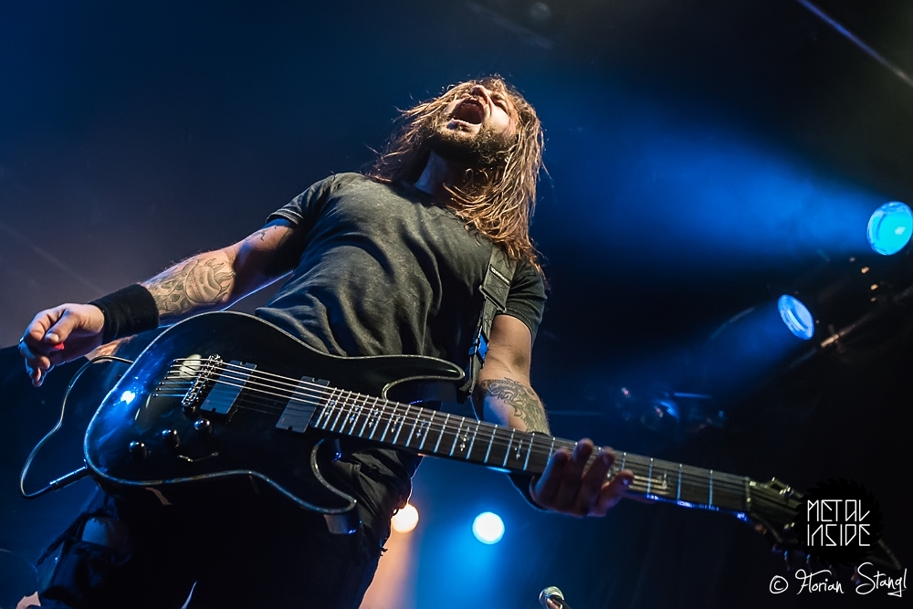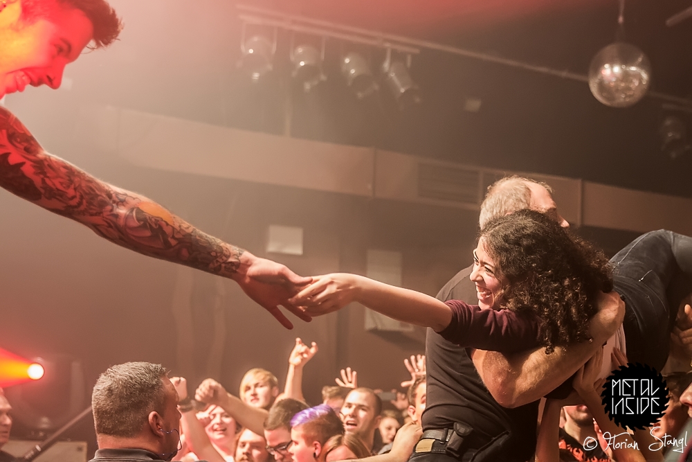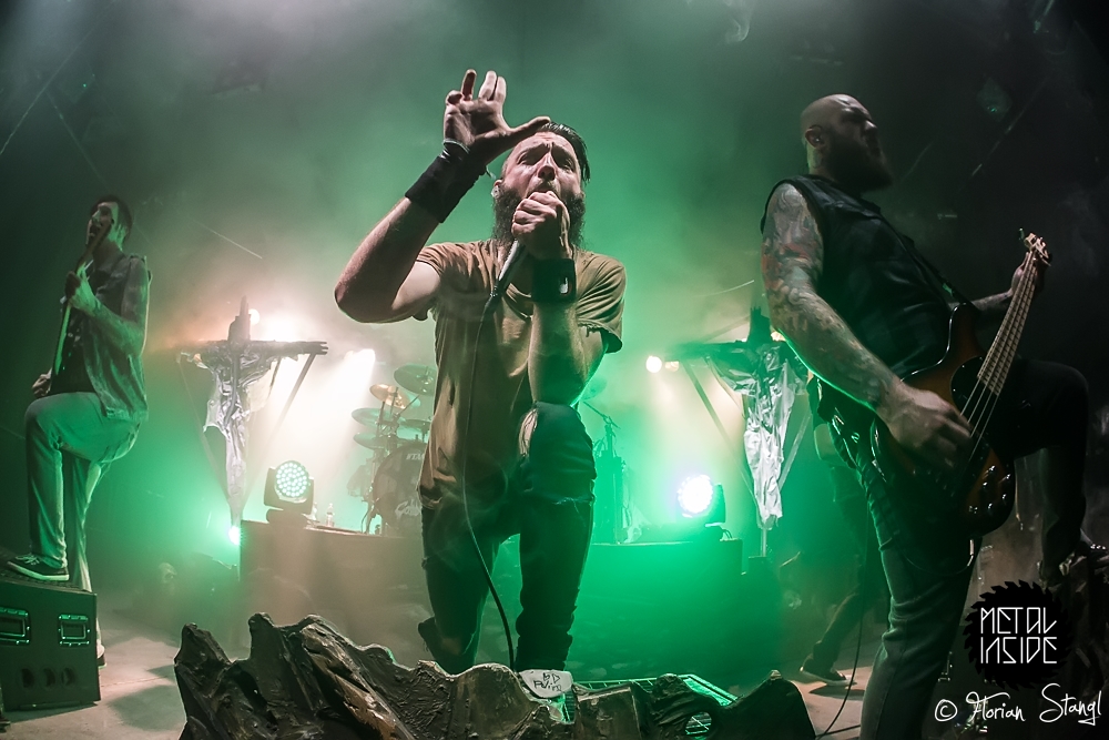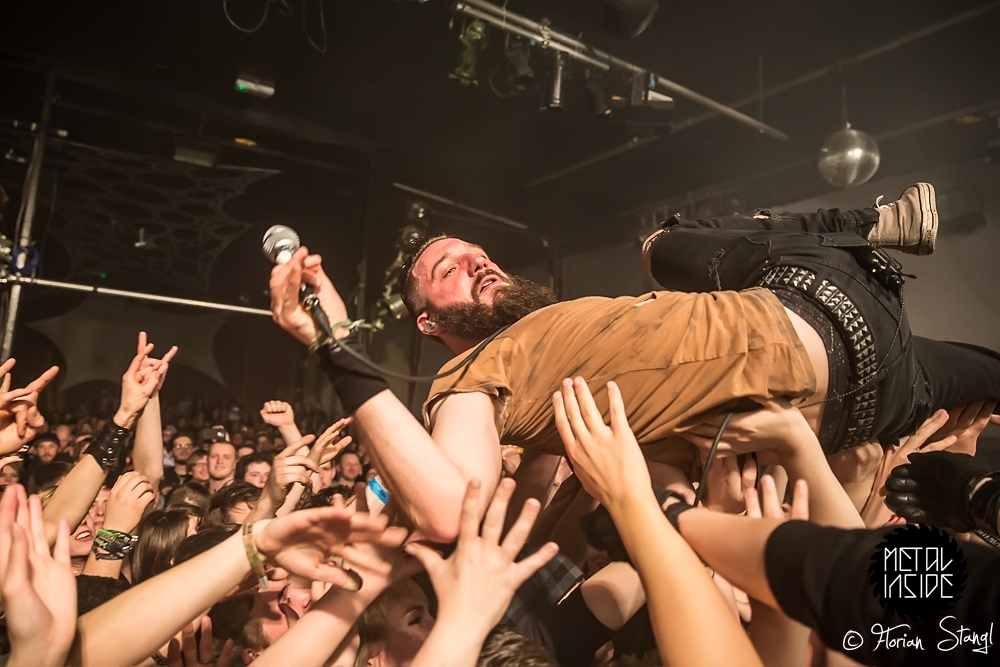 Und Headliner CALIBAN? Die fuhren erst mal ein eindrucksvolles Bühnenbild auf, passend zum Cover ihres aktuellen Albums „Ghost Empire“, mit Ruinen und Kreuzen, Nebelwerfern und eindrucksvoller Lichtshow. Nachdem sich Sänger Andy gleich zu Beginn ins Publikum schmiss und ihn von der Bühne aus seine Kollegen von den Support Bands lauthals unterstützten, gab es kein Halten mehr. CALIBAN präsentierten sich wie erwartet als brachiales Abrisskommando mit viel Nähe zu ihren Fans, die am Ende völlig ausgepowert und durchgeschwitzt auf einen legendären Abend im Nürnberger Hirsch zurückblicken konnten.