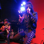 Mit einem Fassungsvermögen von gerade mal 150 Mann und fehlender Absperrung war dort eine intime Atmosphäre garantiert und pünktlich zum Beginn um 22:20 Uhr war der Laden denn auch gerammelt voll. Die Band erschien zunächst als Trio- Sänger Jyrki 69 und die beiden Gitarristen Timo-Timo und Bazie, jeweils mit einer Akustikgitarre bewaffnet- und eröffnete ihr Set mit "Never Say Die", gefolgt von "Gothic Girl" und, unter großem Applaus, dem Klassiker "Brandon Lee". Für ebenso großes wie freudiges Hallo sorgte das sich auf dem ersten in Richtung des späteren Goth´n Roll-tendierenden gleichnamigen Album befindende "Wasting The Dawn", das schon seit etwa sieben Jahren durch Abwesenheit in der Setliste geglänzt und nun nach langer Zeit endlich den Weg zurückgefunden hatte- vielleicht, weil es sich in ein Akustik-Set einfach sehr gut einfügte. Zu dessen Auftakt fand auch Bassist Archzie den Weg auf die Bühne, dem im Zwischenteil dann schließlich zu allgemeinem Jubel Schlagzeuger Jussi 69 folgte, um den Sound mit Shakern und Artverwandtem zu vervollständigen. Noch weitaus größer wurde die Überraschung allerdings, als Jyrki schließlich mit den Worten: "You can dance if you like, or sing along... But whatever you do- don´t you step on my fuckin´ blue suede shoes!" doch tatsächlich den Auftakt zu Elvis´ "Blue Suede Shoes" gab. Und wer hätte das gedacht: es war, als sei Elvis auferstanden. Die dunkle Stimme des Sängers der 69 Eyes passte derart perfekt zum Timbre der viel zu früh verstorbenen Legende, dass es hier einfach konstatiert werden muss: Elvis lebt. Vielleicht ist dies seine Reinkarnation, vielleicht auch nicht, aber er hätte zweifellos seinen Spaß an dieser Darbietung gehabt. Den hatten die Band und das Publikum auch, und da man von manchen Dingen bekanntlich nicht genug bekommen kann, folgte etwas später dann mit "Heartbreak Hotel" auch noch ein zweites, ebenso gelungenes Elvis-Cover. Hübsch mit dem Vampir-Image der Band kokettierend kommentierte Jyrki anschließend mit den Worten: "That´s what The 69 Eyes sounded like in the 50s!". Vielleicht lebt Elvis ja also wirklich noch... Insgesamt bot das Set einen schönen Querschnitt des kreativen Schaffens seit "Wasting The Dawn", bei dem auch der eine oder andere Song zum Zuge kamen, auf den das Publikum auf den letzten Touren hatte verzichten müssen, beinhaltete aber genauso Material vom aktuellen Album "Back In Blood". Die Akustik-Atmosphäre kam bei ruhigen Liedern wie "Hunger" etwas besser zum Tragen als bei Uptempo-Rocknummern wie "Dead Girls Are Easy", aber gelungen war das komplette Set, das nach einer Dreiviertelstunde mit "Lost Boys" schließlich seinen Abschluss fand. Das Publikum wurde mit einem verfrühten "Happy new year, hyvää uutta vuotta!" sowie "Danke!" in zahlreichen Sprachen entlassen und begann umgehend, in Richtung Tavastia-Bühnenraum zu strömen, wo wenige Minuten später HIM beginnen sollten.